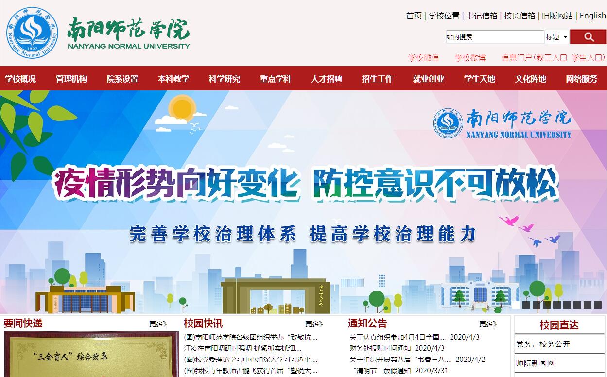 南陽師范學(xué)院為河南省屬普通本科高校,始建于1951年的河南省立南陽師范學(xué)校,1958年升格為南陽師范??茖W(xué)校,2000年升格為南陽師范學(xué)院。2007年通過教育部本科教學(xué)工作水平評估,2011年獲批為“服務(wù)國家特殊需求人才培養(yǎng)項(xiàng)目——學(xué)士學(xué)位授予單位開展培養(yǎng)碩士專業(yè)學(xué)位研究生試點(diǎn)”單位,2016年被確定為河南省示范性應(yīng)用技術(shù)類型本科院校,2017年獲批為碩士學(xué)位授予單位。學(xué)校占地面積1875畝,建筑面積85.2萬m2,教學(xué)科研儀器設(shè)備總值3.74億元,中、外文紙質(zhì)圖書223萬冊,電子圖書(期刊)954萬冊。全日制在校生27705人?,F(xiàn)有教職工1604人,其中正高131人,副高393人,博士373人,專任教師1313人。擁有國家級百千萬人才第一層次人選、享受國務(wù)院特殊津貼專家、全國優(yōu)秀教師、全國模范教師、省管專家、省級學(xué)術(shù)技術(shù)帶頭人等,初步形成了以高層次專家為核心,以教授、博士為骨干的高水平師資隊(duì)伍。學(xué)校率先在全國開展大學(xué)生專業(yè)技能崗位對接培訓(xùn),是全國本科院校中首個國家級職業(yè)指導(dǎo)工作室建設(shè)試點(diǎn)單位。建有國家級大學(xué)生校外實(shí)踐教育基地、國家級眾創(chuàng)空間、全國高校實(shí)踐育人創(chuàng)新創(chuàng)業(yè)示范基地、國家級特色專業(yè)、省級特色專業(yè)、省級專業(yè)綜合改革試點(diǎn)專業(yè)、省級教學(xué)團(tuán)隊(duì)、省級實(shí)驗(yàn)教學(xué)示范中心、省級精品課程和精品資源共享課程等教學(xué)平臺。近年來,學(xué)生在全國大學(xué)生“挑戰(zhàn)杯”、數(shù)學(xué)建模等國際、國內(nèi)競賽中屢獲佳績,先后獲得全國青年科普創(chuàng)新實(shí)驗(yàn)暨作品大賽總冠軍、全國工程機(jī)器人大賽特等獎、創(chuàng)青春大學(xué)生創(chuàng)業(yè)大賽國家級銀獎、中國曲藝牡丹獎以及省部級以上獎勵300余項(xiàng)。畢業(yè)生就業(yè)率穩(wěn)定在95%以上,用人單位滿意度超過90%。學(xué)校擁有河南省一級重點(diǎn)學(xué)科3個、二級重點(diǎn)學(xué)科8個。建有省級協(xié)同創(chuàng)新中心、省級重點(diǎn)實(shí)驗(yàn)室、省級工程實(shí)驗(yàn)室、省級工程技術(shù)研究中心、省文化產(chǎn)業(yè)發(fā)展研究基地、省高校人文社科重點(diǎn)研究基地、民政部全國民政政策理論研究基地、文化部民族民間文化中原曲藝研究基地、中國社會科學(xué)院東漢史研究基地等省部級平臺18個。近五年,承擔(dān)國家級科研項(xiàng)目116項(xiàng),省部級科研項(xiàng)目293項(xiàng);先后獲得河南省教學(xué)成果特等獎、河南省社會科學(xué)優(yōu)秀成果一等獎、省科技進(jìn)步獎等315項(xiàng);獲得國家授權(quán)專利369項(xiàng);以第一作者單位在SCI、SSCI、A&HCI、EI源期刊、CSSCI、中文核心期刊發(fā)表學(xué)術(shù)論文2247篇,出版學(xué)術(shù)著作、教材近200部。先后主辦或承辦了“有機(jī)廢棄物資源化利用”歐盟—中國合作研討會、東漢史研究國際論壇、華夏玉文化大講堂、中國第九屆災(zāi)害史年會、中西部無機(jī)化學(xué)年會、馮友蘭學(xué)術(shù)思想研討會、國學(xué)(漢學(xué))教育國際學(xué)術(shù)研討會等高端學(xué)術(shù)會議和論壇。《南都學(xué)壇》《南陽師范學(xué)院學(xué)報》均被評為河南省一級期刊、全國百強(qiáng)社科學(xué)報、中國人文社科學(xué)報核心期刊。在2018年年初全球自然指數(shù)排行榜上,學(xué)校位列全國高校第114位,全省高校第4位,化學(xué)學(xué)科排名進(jìn)入世界500強(qiáng)。學(xué)校與美國、英國、澳大利亞、愛爾蘭、意大利、芬蘭、瑞典、馬來西亞、韓國等多個國家的高水平大學(xué)建立長期合作關(guān)系,先后與澳大利亞科廷大學(xué)達(dá)成學(xué)分互認(rèn)協(xié)議、與澳大利亞南澳大學(xué)開展中外本科課程合作項(xiàng)目、與韓國全州大學(xué)合作舉辦本科教育項(xiàng)目、與美國多所州立大學(xué)建立了《中美人才培養(yǎng)計(jì)劃》121雙學(xué)位項(xiàng)目的校級交流項(xiàng)目、與芬蘭薩沃尼亞應(yīng)用科技大學(xué)和瑞典梅拉達(dá)倫大學(xué)簽署了研究生聯(lián)合培養(yǎng)協(xié)議。中外合作辦學(xué)規(guī)模不斷擴(kuò)大,留學(xué)生規(guī)模位居河南省師范類院校第一名。先后獲批為國家留學(xué)基金委高等學(xué)校青年骨干教師出國研修項(xiàng)目資質(zhì)單位和優(yōu)秀本科生國際交流項(xiàng)目選派資質(zhì)單位,成功獲批為河南省漢文化國際推廣基地,并當(dāng)選中國教育國際交流協(xié)會理事單位。學(xué)校先后榮獲“全國文明單位”“河南省高校黨建工作先進(jìn)單位”“河南省教育系統(tǒng)先進(jìn)集體”“河南省示范性應(yīng)用技術(shù)類型本科院?!薄昂幽鲜∷枷胝喂ぷ飨冗M(jìn)單位”“河南省校務(wù)公開示范單位”“河南省屬本科高校行風(fēng)評議第一名”“河南省高校德育評估第一名”“河南省首批高校心理健康教育示范單位”“河南高等教育質(zhì)量社會滿意本科院校”“全國大學(xué)生社會實(shí)踐活動先進(jìn)單位”等榮譽(yù)稱號。“南水北調(diào)中線水源區(qū)生態(tài)環(huán)保志愿服務(wù)項(xi