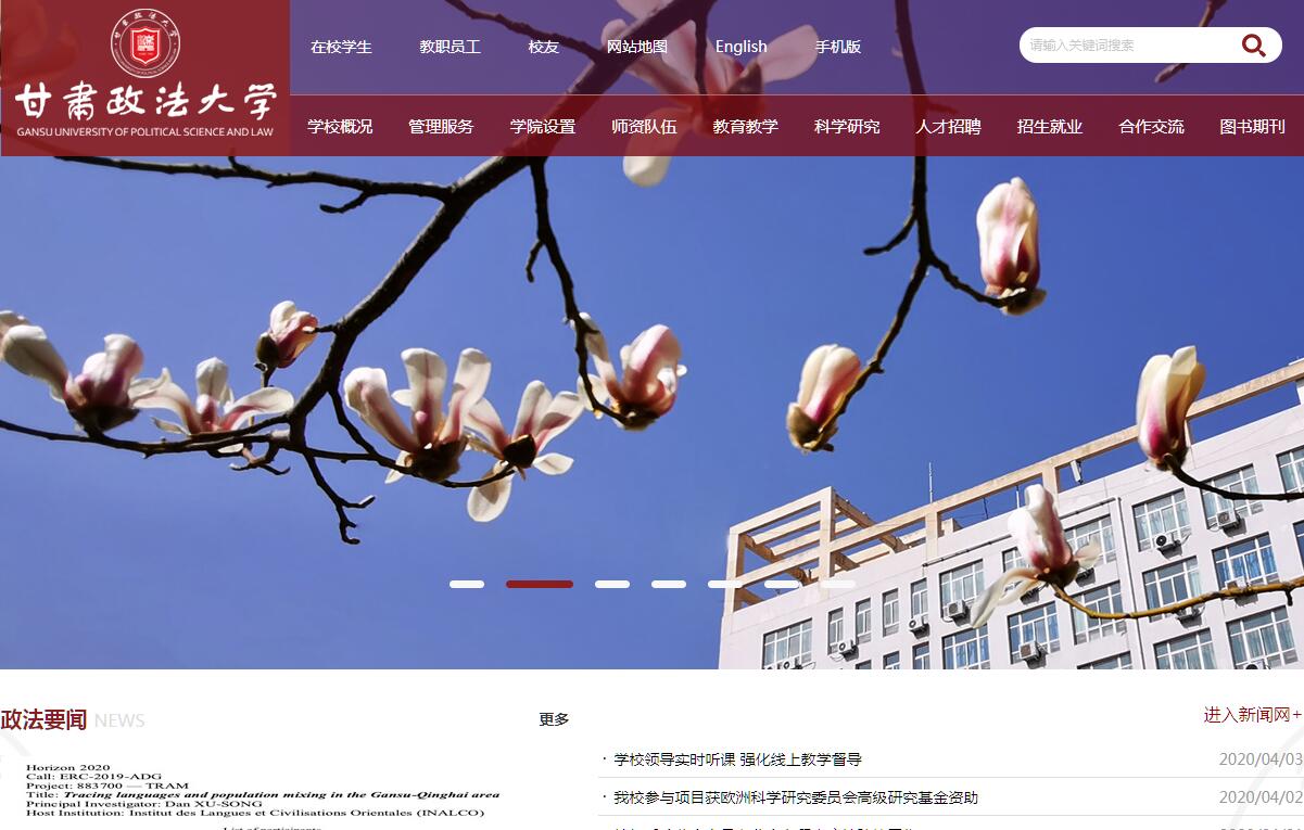 甘肅政法大學是甘肅省省屬的唯一一所政法類普通本科院校,是全國最早建立的省屬本科政法院校,前身是1956年創(chuàng)建的甘肅省政法干部學校,1984年正式成立甘肅政法學院,開辦普通高等教育。學校2006年取得碩士學位授予單位資格,2007年開辦碩士研究生教育,2017年開辦國際生教育,同年被確定為甘肅省博士學位授予立項建設單位,是國家首批卓越法律人才教育培養(yǎng)基地院校、全國第二批高校實踐育人創(chuàng)新創(chuàng)業(yè)教育基地”和全國政法院?!傲⒏衤?lián)盟”成員。2019年6月,經(jīng)教育部同意,更名為甘肅政法大學。學校設有12個二級學院,建有省級人文社科重點研究基地9個、省級重點實驗室2個、省級科研創(chuàng)新團隊3個、省級智庫1個,省級實驗教學示范中心4個、省級教學團隊6個。學?,F(xiàn)有蘭州市安寧西路校區(qū)、蘭州市安寧萬新路校區(qū)、蘭州新區(qū)校區(qū)3個校區(qū)。校園占地面積1066.59畝,校舍建筑面積39.77萬平方米,教學科研行政用房面積16.85萬平方米,教學科研儀器設備總值6910.12萬元,現(xiàn)有紙質(zhì)圖書126.31萬冊、電子圖書80.80萬冊,建有現(xiàn)代計算機網(wǎng)絡服務系統(tǒng),建有專業(yè)實驗室46個,校內(nèi)外實習、實訓基地164個。能夠滿足辦學需要。學?,F(xiàn)有全日制在校生11021人,其中本科生10145人,碩士研究生876人。在2006年教育部本科教學工作水平評估中獲得“良好”。學校近兩屆教學成果獎評選中,獲得省級教學成果獎5項,其中一等獎2項。建校以來,已累計為社會培養(yǎng)各級各類人才7萬余人,涌現(xiàn)出一大批先進典型。學校現(xiàn)有教職工894人,其中專任教師總數(shù)633人,高級職稱教師414人,具有碩士以上學位的教師513人,博士127人,博士在讀67人,聘請兼職、客座教授282人。專任教師中享受國務院特殊津貼專家3人,全國優(yōu)秀教師2人,入選教育部“新世紀優(yōu)秀人才支持計劃”3人,教育部高等學校教學指導委員會委員4人,甘肅省領軍人才5人,甘肅省優(yōu)秀專家2人,甘肅省 “飛天學者”8人,甘肅省“555”創(chuàng)新人才13人,“甘肅省園丁獎”9人,隴原師德先進個人1人。學校現(xiàn)有34個本科專業(yè),涵蓋了法學、管理學、工學、文學、經(jīng)濟學、藝術(shù)學等六大學科門類,社會學科、管理學、工學、人文學科為學校主要學科門類。有法學、偵查學、邊防管理等3個國家級特色專業(yè)建設點、13個省級特色專業(yè)。法學學科為甘肅省優(yōu)勢學科,證據(jù)科學、工商管理2個學科為甘肅省特色學科。有法學、工商管理、網(wǎng)絡空間安全3個一級學科碩士學位授權(quán)點,17個二級學科碩士學位授權(quán)點,4個專業(yè)碩士學位授權(quán)點。學校具有較強的科學研究能力,近五年科研成果獲省部級以上獎勵29項,其中教育部高校社科優(yōu)秀成果獎1項,國家民委優(yōu)秀社科成果獎1項,甘肅省哲學社會科學優(yōu)秀成果一等獎3項、二等獎6項。學校承擔省部級以上科研項目118項,其中國家社科基金和自然基金項目38項?!陡拭C政法學院學報》入選CSSCI擴展版來源期刊、北大中文核心期刊。學校注重國際合作與交流,與美國俄克拉荷馬州立大學、英國胡弗漢頓大學、吉爾吉斯斯坦奧什國立大學、俄羅斯圣彼得堡大學、哈薩克斯坦法律大學等國外高校建立了互派留學生、訪問學者、聯(lián)合培養(yǎng)等校際學術(shù)交流與合作關系。學校積極發(fā)揮學科和專業(yè)優(yōu)勢,主動服務法治建設和地方經(jīng)濟社會發(fā)展。一是主動為全面依法治國和國家治疆治藏治邊方略的實施提供有力的實用人才支撐;二是發(fā)揮人文社科研究基地的智庫作用,為黨委和政府決策提供智力支持;三是開展國別法治比較研究,積極服務“絲綢之路經(jīng)濟帶”建設;四是發(fā)揮證據(jù)科學研究與應用重點實驗室、司法鑒定中心、犯罪心理測試中心等科研服務平臺功能,推進科研成果的轉(zhuǎn)化和應用,為公正司法提供科技服務。辦學類型定位:應用型普通本科高等學校。辦學層次定位:以本科教育為主體,加強碩士研究生教育,開辦博士研究生教育,拓展國際學生教育。學科專業(yè)建設目標定位:法學創(chuàng)一流,管理學樹品牌,證據(jù)科學顯特色,多學科交叉融合、協(xié)調(diào)發(fā)展。人才培養(yǎng)目標定位:政治素質(zhì)過硬,專業(yè)知識扎實,具有法治信仰、人文情懷、創(chuàng)新精神、實踐能力和社會責任感的應用型專門人才。服務面向定位:立足甘肅,面向全國,輻射“絲綢之路經(jīng)濟帶”沿線國家,積極為國家重大戰(zhàn)略需求、西部地方經(jīng)濟社會發(fā)展和法治建設服務。發(fā)展目標定位:經(jīng)過5-10年的建設與發(fā)展,把學校辦成西部一流,在“絲綢之路經(jīng)濟帶”沿線國家有較高知名度,國內(nèi)有重要影響的高水平政法大學。