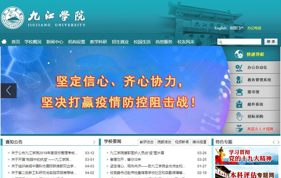 九江學(xué)院是經(jīng)國家教育部批準設(shè)立的國有公辦全日制本科普通高等院校,辦學(xué)歷史可上溯至1901年由美國基督教衛(wèi)理公會創(chuàng)辦的但福德學(xué)校,現(xiàn)辦學(xué)體制為“軍地共建、省市共建”。學(xué)校坐落在長江中下游歷史文化名城——江西省九江市,位于廬山之麓、長江之濱、鄱陽湖之畔。校園生態(tài)環(huán)境優(yōu)良,景觀美麗如詩。名城、名山、名江、名湖,造就了九江學(xué)院的靈氣,尤其是具有千年歷史、享有“天下書院之首”美譽的白鹿洞書院,更為九江學(xué)院賦予深厚的文化氣息和辦學(xué)氛圍。學(xué)校占地2850多畝,現(xiàn)有主校區(qū)、潯東校區(qū)、廬峰校區(qū)、南湖校區(qū)、八里湖校區(qū)五個校區(qū),校舍面積130余萬平方米。下設(shè)22個二級學(xué)院,1所“三級甲等”附屬醫(yī)院。設(shè)有93個本科專業(yè),涵蓋了經(jīng)濟學(xué)、法學(xué)、教育學(xué)、文學(xué)、歷史學(xué)、理學(xué)、工學(xué)、農(nóng)學(xué)、醫(yī)學(xué)、管理學(xué)、藝術(shù)學(xué)等十一大學(xué)科門類?,F(xiàn)有國際貿(mào)易、凝聚態(tài)物理、植物學(xué)、材料加工工程、旅游管理、化學(xué)工程與工藝、人體解剖學(xué)與組織胚胎學(xué)、中國古代文學(xué)、思想政治教育、會計學(xué)等省級重點學(xué)科,國際經(jīng)濟與貿(mào)易、生物科學(xué)等國家級特色專業(yè)。面向全國30個?。ㄊ?、自治區(qū))招生,全日制在校生3.4萬余人。學(xué)校始終堅持以立德樹人為根本,以人才培養(yǎng)為中心,堅持服務(wù)國家和區(qū)域經(jīng)濟社會發(fā)展需求,立足贛北,面向江西,輻射全國,放眼世界,為長江經(jīng)濟帶、長江中游城市群、國家生態(tài)文明示范區(qū)建設(shè)提供人才支撐和智力支持,培養(yǎng)綜合素質(zhì)好、專業(yè)基礎(chǔ)實、實踐能力強,具有創(chuàng)新創(chuàng)業(yè)精神的高級應(yīng)用型人才。學(xué)?,F(xiàn)有教職工2600余人,專任教師1900余人(副高以上職稱的808人,博士330人;研究生導(dǎo)師70余人),其中:入選江西省“贛鄱英才555工程”4人;獲得國務(wù)院特殊津貼和省政府特殊津貼12人;江西省高校學(xué)科帶頭人和青年骨干教師40人;江西省高校教學(xué)名師6人;入選省“百千萬人才工程”17人。近年來,學(xué)校聘請了近200位知名專家學(xué)者為學(xué)校兼職和客座教授。中國科學(xué)院院士楊叔子教授受聘為學(xué)校名譽校長,中國科學(xué)院院士潘際鑾教授受聘為學(xué)校學(xué)術(shù)委員會主任;中國工程院院士袁隆平、程天民和中國科學(xué)院院士嚴陸光等專家學(xué)者受聘為學(xué)校名譽教授。學(xué)?;A(chǔ)設(shè)施齊全,教學(xué)樓、實驗樓、圖書館、信息技術(shù)樓、田徑運動場和室內(nèi)體育館、學(xué)生活動中心等分布于各個校區(qū),計算機網(wǎng)絡(luò)覆蓋全校,實現(xiàn)了教學(xué)科研、圖書文獻檢索和辦公管理的網(wǎng)絡(luò)化和校園一卡通。圖書館設(shè)有1個主館和4個分館,共藏紙質(zhì)圖書317萬余冊、電子圖書200余萬種;建有各類實驗教學(xué)中心/綜合實驗室22個,其中,5個省級實驗教學(xué)示范中心、49個中央與地方共建基礎(chǔ)實驗室、中央與地方特色優(yōu)勢學(xué)科實驗室及中央財政支持地方高校改革發(fā)展專項資金項目。建有廬山實習(xí)培訓(xùn)中心等校內(nèi)外實習(xí)基地285個;現(xiàn)有教學(xué)科研儀器設(shè)備總值2.49億元。學(xué)校持續(xù)深化教育教學(xué)改革,大力推進本科教學(xué)“質(zhì)量工程”建設(shè),現(xiàn)有人才培養(yǎng)模式創(chuàng)新實驗區(qū)、教學(xué)創(chuàng)新團隊、實驗教學(xué)示范中心、雙語教學(xué)示范課程等35個國家級、省級“質(zhì)量工程”項目,223個國家級、省級“本科教學(xué)工程”項目?!笆濉币詠?,共獲得省級教學(xué)成果一等獎5項、二等獎12項。全面推進素質(zhì)教育和全員育人,積極探索創(chuàng)新應(yīng)用型人才培養(yǎng)模式,深入開展以創(chuàng)新創(chuàng)業(yè)、好習(xí)慣、國學(xué)素養(yǎng)等為主要內(nèi)容的“特色教育”。建立了“五三二一”創(chuàng)新創(chuàng)業(yè)人才培養(yǎng)體系,形成了抱團創(chuàng)業(yè)、集群創(chuàng)業(yè)、無縫創(chuàng)業(yè)、多樣創(chuàng)業(yè)、新式創(chuàng)業(yè)等特色,得到了江西省委省政府領(lǐng)導(dǎo)的充分肯定,并榮獲“中國高校創(chuàng)業(yè)教育示范單位”稱號。注重發(fā)揮校園文化育人功能,精心打造“濂溪講壇”文化品牌,先后邀請國內(nèi)外100余名知名專家學(xué)者作客講壇,并獲評“江西省高校校園文化建設(shè)優(yōu)秀成果一等獎”。深入開展國學(xué)經(jīng)典誦讀、科技文化節(jié)等校園文化精品活動,著力打造“暑期三下鄉(xiāng)”社會實踐活動品牌,全面提升學(xué)生綜合素質(zhì)。近年來,在全國“互聯(lián)網(wǎng)+”大學(xué)生創(chuàng)新創(chuàng)業(yè)大賽、“挑戰(zhàn)杯”全國大學(xué)生課外學(xué)術(shù)科技作品競賽、全國大學(xué)生數(shù)學(xué)建模競賽等各類賽事中均取得了優(yōu)異成績。人才培養(yǎng)質(zhì)量穩(wěn)步提升,新生報到率連續(xù)多年位于江西省同類院校前列;畢業(yè)生總體初次就業(yè)率連續(xù)多年超過江西