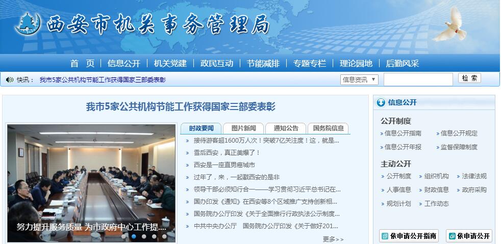 根據《中共陜西省委辦公廳、陜西省人民政府辦公廳關于印發(fā)〈西安市人民政府職能轉變和機構改革方案〉的通知》(陜辦字[2015]44號),設立西安市機關事務管理局,為市政府工作部門。其主要職責:(一)貫徹落實機關事務管理工作的有關政策、法規(guī),擬定機關事務管理與服務有關政策措施,并組織實施。(二)負責市級機關辦公用房的建設、維修和產權產籍管理;負責市級黨政機關、人民團體和事業(yè)單位辦公用房違規(guī)建設、使用的核查清理工作。(三)負責市政府機關事務管理和服務保障工作;承擔市政府辦公區(qū)的治安保衛(wèi)和消防安全管理責任;負責擬訂市級機關物業(yè)管理的相關規(guī)定和制度,并監(jiān)督實施;負責市政府辦公區(qū)環(huán)境衛(wèi)生和公共設施管理工作。(四)擬定公務用車改革有關政策措施,承擔全市公務用車改革和管理工作;負責全市公務用車使用情況的監(jiān)督檢查。(五)負責制定市級機關、事業(yè)單位厲行節(jié)約、反對浪費成效評估辦法,組織實施檢查考核。(六)負責全市公共機構節(jié)約能源資源工作;會同有關部門對全市公共機構節(jié)能管理進行規(guī)劃,制定有關制度并組織實施。(七)負責市政府辦公區(qū)、市政府政務服務中心、市應急指揮中心(電子政務中心)、城市規(guī)劃展覽館,綜合服務樓及武警營區(qū)后勤保障專項經費的預算和使用管理等工作。(八)負責市政府辦公區(qū)社會化服務管理工作。(九)負責市政府重要會議和大型活動的服務保障工作。(十)指導、監(jiān)督區(qū)縣機關事務和公務用車改革管理工作。(十一)承辦市政府交辦的其他事項。