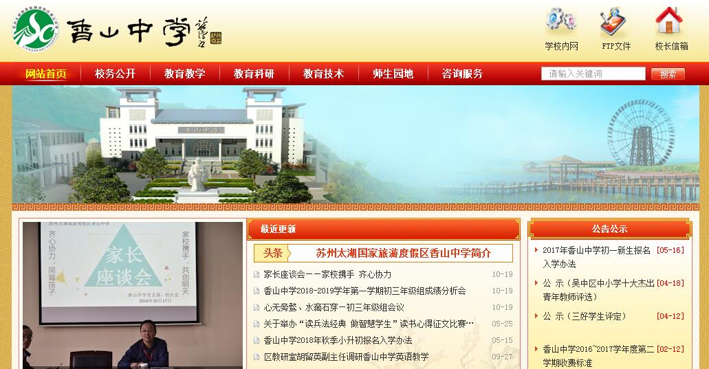 蘇州太湖國(guó)家旅游度假區(qū)香山中學(xué)興建于1958年,2002年9月易地新建,有豐厚的辦學(xué)歷史。學(xué)校地處蘇州太湖國(guó)家旅游度假區(qū)中心區(qū),占地30478平方米,建筑面積6462平方米。學(xué)校依山傍湖,風(fēng)景旖旎,有微機(jī)房、音樂室、圖書室、閱覽室、江蘇省中小學(xué)標(biāo)準(zhǔn)化實(shí)驗(yàn)室等;所有教學(xué)班級(jí)全部配備背投電視和實(shí)物投影儀,寬帶網(wǎng)絡(luò)接進(jìn)班級(jí)。學(xué)校現(xiàn)有教職員工53名,教師現(xiàn)代化備課條件優(yōu)越。學(xué)校秉承“為每個(gè)學(xué)生提供一生都值得回憶的優(yōu)質(zhì)初中教育”的辦學(xué)理念,積極實(shí)施科研興校、科研興教策略,積極鍛造高素質(zhì)教師隊(duì)伍,積極提高學(xué)生綜合素質(zhì)?!捌渲靖哌h(yuǎn),其氣恢弘?!苯裉斓奶K州太湖國(guó)家旅游度假區(qū)香山中學(xué),在上級(jí)領(lǐng)導(dǎo)的關(guān)心支持下,在全體師生員工的共同努力下,正頑強(qiáng)進(jìn)取,奮勇拼搏,向蘇州市教育現(xiàn)代化學(xué)校努力邁進(jìn)。