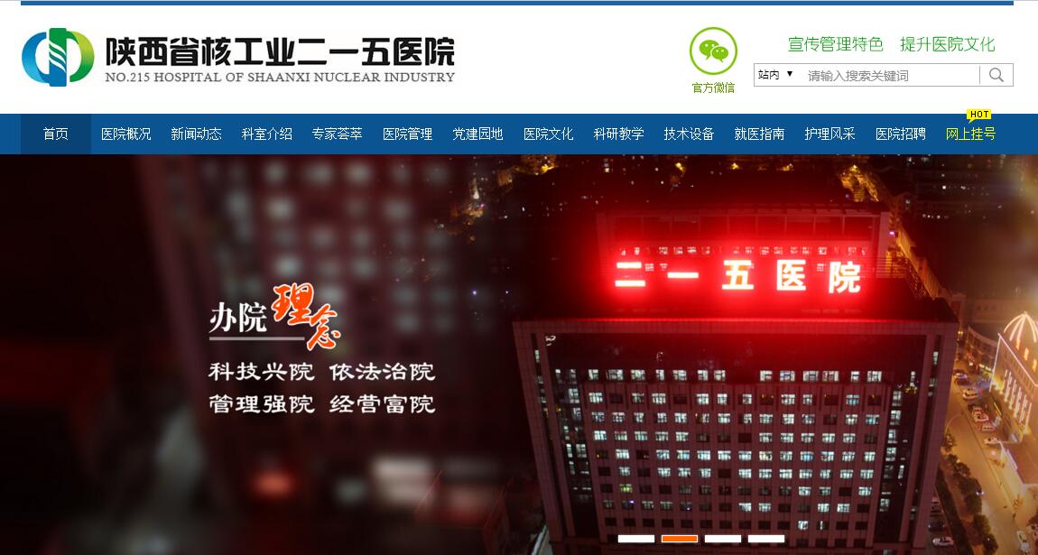 陜西省核工業(yè)二一五醫(yī)院始建于1974年,是咸陽市科室齊全、設(shè)備先進(jìn),融醫(yī)療、教學(xué)、科研、預(yù)防、康復(fù)為一體的三級綜合性醫(yī)院,是國家自然科學(xué)基金委員會依托單位、西安交通大學(xué)醫(yī)學(xué)院教學(xué)醫(yī)院,西安醫(yī)學(xué)院附屬醫(yī)院,西藏民族大學(xué)教學(xué)基地,上海交通大學(xué)瑞金醫(yī)院協(xié)作醫(yī)院、咸陽市公安法醫(yī)創(chuàng)傷醫(yī)院,咸陽市老年病醫(yī)院,陜西省醫(yī)保、新農(nóng)合定點(diǎn)單位,合療、醫(yī)保、人壽保險“直通車”單位,擁有職業(yè)病健康體檢資質(zhì)和法醫(yī)司法鑒定資質(zhì),咸陽市新農(nóng)合大病保險直通車報銷定點(diǎn)醫(yī)院。醫(yī)院開放病床1550張,設(shè)臨床、醫(yī)技科室41個,門診診室54個,年門診量35萬人次、出院病人4萬余人次、手術(shù)量2萬余臺。在職職工1750人,其中衛(wèi)生技術(shù)人員1521名,擁有省突出貢獻(xiàn)專家、省“三五”人才、杰出人才、杰出青年和高級職稱專家、教授200余人。2014年1月投入使用的醫(yī)療綜合大樓,為廣大患者提供了環(huán)境優(yōu)美、流程合理、方便舒適的就醫(yī)環(huán)境。醫(yī)療綜合大樓分為AB兩區(qū)地上12層,地下2層,設(shè)置電梯28部,中央空調(diào)采暖。一層至四層為門急診、醫(yī)技科室、藥房等,四層為消毒供應(yīng)中心,五層為手術(shù)室,六層至十二層主要為病區(qū)。按國際標(biāo)準(zhǔn)設(shè)計(jì)了全層流凈化手術(shù)室,醫(yī)學(xué)影像科、檢驗(yàn)科、輸血科、消毒供應(yīng)中心等醫(yī)技科室。設(shè)置專科門診54個,門診收費(fèi)實(shí)行“一卡通”就診流程,患者就診只需提供本人身份證,辦理“就診卡”,免去掛號、交費(fèi)、劃價等步驟。秉承“生態(tài)環(huán)保,綠色節(jié)能”的理念,按綠色醫(yī)院標(biāo)準(zhǔn)建設(shè),醫(yī)院設(shè)備先進(jìn)、技術(shù)領(lǐng)先、環(huán)境舒適、服務(wù)優(yōu)質(zhì),醫(yī)院新醫(yī)療大樓內(nèi)部功能分區(qū)明確,設(shè)施齊全,在全市醫(yī)院中處于領(lǐng)先地位。醫(yī)院設(shè)有骨科五個病區(qū)(關(guān)節(jié)外科病區(qū)、創(chuàng)傷外科病區(qū)、脊柱外科病區(qū)、手足外科病區(qū)、燒傷整形科病區(qū)),普通外科(普通外科一病區(qū)(胃腸外科)、普通外科二病區(qū)(肝脾外科)、普通外科三病區(qū)(膽胰外科、臨床營養(yǎng)科)、普通外科四病區(qū)(肛腸介入)),神經(jīng)外科三個病區(qū)(神經(jīng)外科一病區(qū)、神經(jīng)外科二病區(qū)、神經(jīng)外科重癥監(jiān)護(hù)病區(qū)),胸心外科(病區(qū)),腫瘤科兩個病區(qū)(腫瘤科一病區(qū)、腫瘤科二病區(qū)),重癥醫(yī)學(xué)科(病區(qū)),沁尿外科(病區(qū)),男性科,婦科(病區(qū)),產(chǎn)科(病區(qū)),、耳鼻喉科(病區(qū)),眼科(病區(qū)),呼吸內(nèi)科(病區(qū)),內(nèi)分泌糖尿病科(病區(qū)),消化內(nèi)科(病區(qū)),血液內(nèi)科(病區(qū)),心血管內(nèi)科兩個病區(qū)(心血管內(nèi)科一病區(qū)、心血管內(nèi)科二病區(qū)),神經(jīng)內(nèi)科兩個病區(qū)(神經(jīng)內(nèi)科一病區(qū)、神經(jīng)內(nèi)科二病區(qū)),腎病內(nèi)科三個病區(qū)(腎病內(nèi)科病區(qū)、血液透析一病區(qū)、血液透析二病區(qū)),兒科(病區(qū)),兒??疲夏瓴】疲ú^(qū)),中醫(yī)科(病區(qū)),康復(fù)醫(yī)學(xué)科(病區(qū)),急診科(病區(qū)),風(fēng)濕免疫科(病區(qū)),疼痛科(病區(qū)),口腔頜面外科,口腔科,皮膚科,乳腺甲狀腺科,骨質(zhì)疏松科,睡眠科,腦卒中門診,體檢科,發(fā)熱門診,感染性疾病科,放療科,醫(yī)學(xué)影像科,內(nèi)窺鏡室,體外碎石室,核醫(yī)學(xué)科,病理科,功能科,檢驗(yàn)科,手術(shù)麻醉科,藥劑科,醫(yī)學(xué)工程部,高壓氧科,輸血科,消毒供應(yīng)室等臨床醫(yī)技科室。醫(yī)院共有各類設(shè)備580余臺件,磁共振兩臺(GE3.0T磁共振、HDx1.5T核磁共振),CT三臺(128排CT、16排CT、16排大孔徑定位CT)、瓦里安直線加速器(放療)、ECT、FD20血管機(jī)2臺、飛利浦DR 2臺、CR、數(shù)字減影成像系統(tǒng)、鉬靶乳腺機(jī)、骨質(zhì)疏松掃描儀及治療儀、全自動生化分析儀、全新的血液透析設(shè)施、日本奧林巴斯H290系列高清內(nèi)鏡、ME2高端超聲內(nèi)鏡等系列電子內(nèi)窺鏡、膠囊胃鏡、系列電視外科手術(shù)腔鏡、大型彩超、美國GE-E10、E8超高檔四維彩超、運(yùn)動平板、快速冰凍切片、體外碎石機(jī)、中心吸氧系統(tǒng)、高壓氧艙等大型醫(yī)療設(shè)備和高科技檢查診治設(shè)備。為患者提供科學(xué)、規(guī)范、準(zhǔn)確、及時的診療服務(wù)。外科系統(tǒng)開展主要技術(shù)項(xiàng)目有左右半肝切除術(shù),腹腔鏡下胰、膽總管、膽囊、肝葉切除術(shù),膽道鏡下膽管內(nèi)取石,電視胸腔鏡下肺葉切除、肺破裂、心臟破裂修補(bǔ)術(shù),食道管切除術(shù),氣管、支氣管成形術(shù)、復(fù)雜縱隔腫瘤切除術(shù),腦室系統(tǒng)腫瘤切除術(shù),蝶鞍區(qū)腫瘤切除術(shù),顱內(nèi)血管性疾病人工栓塞術(shù),膝關(guān)節(jié)鏡檢查,斷肢(斷趾)再植、血管游離移植皮瓣覆蓋術(shù)、全關(guān)節(jié)人工關(guān)節(jié)置換術(shù)、3D打印技術(shù)關(guān)節(jié)置換術(shù)