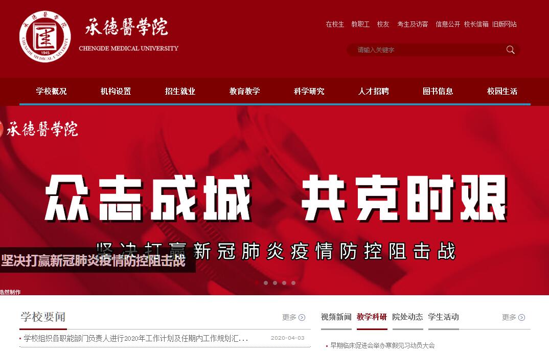 承德醫(yī)學(xué)院是一所隸屬河北省政府領(lǐng)導(dǎo)的高等醫(yī)學(xué)本科院校。創(chuàng)建于1945年9月,時稱冀東軍區(qū)衛(wèi)生學(xué)校;1948年成為為中國醫(yī)科大學(xué)第四分校;1949年5月,入駐熱河省省會—承德,更名熱河醫(yī)學(xué)院;1982年12月升格為本科院校,定名為承德醫(yī)學(xué)院。1996年9月通過國家本科教學(xué)合格評估。2001年河北省農(nóng)林科學(xué)院特產(chǎn)蠶桑研究所并入我校。2003年7月被國務(wù)院學(xué)位委員會批準(zhǔn)為碩士學(xué)位授權(quán)單位。2006年10月,新校區(qū)投入使用并遷入新校區(qū)。2007年9月在國家教育部高等院校本科教學(xué)工作水平評估中獲得優(yōu),秀。2013年11月順利通過國家教育部臨床醫(yī)學(xué)專業(yè)認(rèn)證。學(xué)校2015年榮獲“全國文明單位”稱號,2017年通過“全國文明單位”復(fù)查驗收,繼續(xù)保留“全國文明單位”稱號;附屬醫(yī)院2017年榮獲“全國文明單位”稱號 。目前,學(xué)?,F(xiàn)有教職工2238人(含直屬附屬醫(yī)院),其中專業(yè)技術(shù)人員1863人,正高職稱203人、副高職稱429人,博士和碩士1233人?,F(xiàn)有專任教師1006人。有享受國務(wù)院特殊津貼專家、全國優(yōu)秀教師、河北省突貢專家、省級教學(xué)名師、省級青年學(xué)科帶頭人、百人計劃特聘專家、省“三三三人才工程”和中青年骨干教師50人。有碩士研究生導(dǎo)師448人,博士研究生導(dǎo)師7人,還聘請了40余名國內(nèi)外知名學(xué)者為客座教授。2014年院士工作站獲得批準(zhǔn)成立。現(xiàn)有本、??圃谛I叭罩蒲芯可?380人,來自全國28個?。ㄗ灾螀^(qū)、直轄市)。其中在讀碩士研究生604人,留學(xué)生266人。2006年開始招收外國留學(xué)生,2007年開始選送護(hù)理專業(yè)(??疲W(xué)生赴新加坡留學(xué)并獲全額獎學(xué)金。與丹麥哥本哈根大學(xué)、日本札幌市立大學(xué)、韓國又石大學(xué)、美國印第安納Dabney大學(xué)、馬來西亞馬來亞大學(xué)、意大利卡梅里諾大學(xué)等在內(nèi)的多所國際性大學(xué)簽署學(xué)生交流合作協(xié)議。學(xué)校設(shè)有臨床醫(yī)學(xué)、中西醫(yī)臨床醫(yī)學(xué)、中醫(yī)學(xué)、護(hù)理學(xué)、醫(yī)學(xué)影像學(xué)、麻醉學(xué)、中藥學(xué)、應(yīng)用心理學(xué)、針灸推拿學(xué)、康復(fù)治療學(xué)、生物信息學(xué)、生物醫(yī)學(xué)工程等12個本科專業(yè)和臨床醫(yī)學(xué)、護(hù)理、涉外護(hù)理、醫(yī)學(xué)影像技術(shù)、醫(yī)學(xué)生物技術(shù)、計算機應(yīng)用技術(shù)等6個??茖I(yè)。直屬附屬醫(yī)院1所,非直屬附屬醫(yī)院25所,教學(xué)實習(xí)醫(yī)院64所,總床位達(dá)68000余張。有臨床學(xué)院、護(hù)理學(xué)院、繼續(xù)教育學(xué)院、基礎(chǔ)醫(yī)學(xué)院、中醫(yī)學(xué)院、研究生學(xué)院、國際教育學(xué)院等7個學(xué)院及中藥學(xué)系、心理學(xué)系、生物醫(yī)學(xué)工程系、社會科學(xué)部、公共體育部、外語教學(xué)部等6個教學(xué)系部。學(xué)?,F(xiàn)有臨床醫(yī)學(xué)、基礎(chǔ)醫(yī)學(xué)、中藥學(xué)三個碩士授權(quán)一級學(xué)科,涵蓋了26個二級學(xué)科,其中臨床醫(yī)學(xué)、中藥學(xué)、護(hù)理為專業(yè)學(xué)位授予學(xué)科。學(xué)校現(xiàn)有國家中醫(yī)藥管理局“十一五”重點???個、省級重點學(xué)科和重點發(fā)展學(xué)科8個、省級醫(yī)學(xué)重點發(fā)展學(xué)科4個、省級臨床重點??平ㄔO(shè)(培育)單位10個、校級重點學(xué)科19個;國家級特色專業(yè)建設(shè)點2個、河北省本科教育創(chuàng)新高地2個、河北省品牌特色專業(yè)2個、省級“專業(yè)綜合改革試點”項目3個;臨床醫(yī)學(xué)為地方高校第一批本科專業(yè)綜合改革試點;卓越醫(yī)生教育培養(yǎng)計劃項目1個;卓越醫(yī)生(中醫(yī))教育培養(yǎng)計劃項目1個;省級精品課程9門;省級精品資源共享課程1門;省級實驗教學(xué)示范中心4個;河北省優(yōu)秀教學(xué)團(tuán)隊1個;河北省大學(xué)生校外實踐教育基地1個。校園占地面積74.9萬平方米。其中圖書館建筑面積1.5萬平方米,藏書77萬冊,紙質(zhì)期刊510種,擁有電子圖書285萬冊和電子資源數(shù)據(jù)庫10個(中國知網(wǎng)、萬方數(shù)據(jù)庫、超星讀秀及百鏈學(xué)術(shù)搜索、EBSCO外文庫、重慶聚合、新學(xué)術(shù)外文期刊、中文在線、新東方英語、高??佳谢泳氛n程、銀符在線考試網(wǎng))。學(xué)校2015年榮獲“全國文明單位”稱號,2017年通過“全國文明單位”復(fù)查驗收,繼續(xù)保留“全國文明單位”稱號;附屬醫(yī)院2017年榮獲“全國文明單位”稱號;學(xué)校先后10次榮獲“省級文明單位”稱號;先后被授予河北省校園文化建設(shè)“十佳單位”、河北省“文明大院”、全省教育系統(tǒng)創(chuàng)先爭優(yōu)先進(jìn)集體、河北省學(xué)校安全穩(wěn)定工作先進(jìn)單位等稱號。學(xué)校黨委被評為“河北省高校黨建工作先進(jìn)集體”;團(tuán)委被評為“全國五四紅旗團(tuán)委”;基礎(chǔ)醫(yī)學(xué)院獲“全國教育系統(tǒng)先進(jìn)集體”;護(hù)理學(xué)院被評為“全國三八紅旗集體”;附屬醫(yī)院被評為“全國衛(wèi)生系統(tǒng)先進(jìn)單位”、“全國衛(wèi)生系統(tǒng
