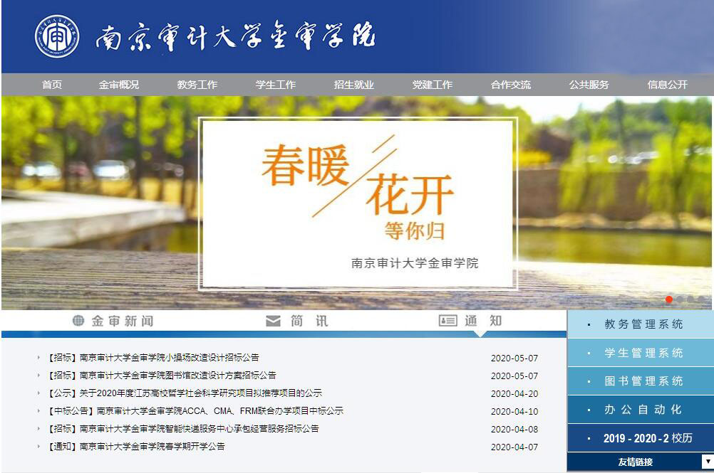 南京審計大學(xué)金審學(xué)院是一所以培養(yǎng)審計、會計、金融人才為主,經(jīng)濟學(xué)、管理學(xué)、工學(xué)、教育學(xué)、藝術(shù)學(xué)等多學(xué)科協(xié)調(diào)發(fā)展的全日制普通本科高校。學(xué)校坐落于鐘靈毓秀、虎踞龍盤的金陵古都,位于風(fēng)景秀麗的南京市仙林大學(xué)城中心地段。這里匯聚了南京大學(xué)、南京師范大學(xué)等12所高校,人文氛圍濃厚,校園景色秀麗,交通便捷,是莘莘學(xué)子讀書求學(xué)的好地方。南京審計大學(xué)金審學(xué)院是2002年經(jīng)江蘇省教育廳批準(zhǔn)成立的一所普通全日制本科層次的公有民辦二級學(xué)院,2005年經(jīng)教育部批準(zhǔn)轉(zhuǎn)制為獨立學(xué)院。學(xué)校堅持社會主義辦學(xué)方向,全面貫徹黨和國家的教育方針,堅持立德樹人根本任務(wù),肩負(fù)人才培養(yǎng)、科學(xué)研究、社會服務(wù)、文化傳承創(chuàng)新的重要使命。學(xué)校堅持走以質(zhì)量提升為核心的內(nèi)涵式發(fā)展道路,堅持依法治校、教授治學(xué)、民主管理、社會參與,努力將學(xué)校建設(shè)為全國知名特色鮮明高水平應(yīng)用型財經(jīng)大學(xué)。學(xué)校致力于培養(yǎng)德智體美全面發(fā)展,具有社會責(zé)任感、創(chuàng)新精神、國際視野的優(yōu)秀人才。學(xué)校面向全國招生,現(xiàn)有全日制在校本科生一萬人左右。學(xué)校共享南京審計大學(xué)和仙林大學(xué)城的優(yōu)質(zhì)教育教學(xué)資源,現(xiàn)有教職員工600余人,其中教授、副教授等高級職稱教師200余人,青年教師中具有博士和碩士研究生學(xué)歷的比例達到80%以上。已經(jīng)形成了一支包括教育部長江學(xué)者特聘教授在內(nèi)的結(jié)構(gòu)合理,業(yè)務(wù)精湛,專兼職相結(jié)合的優(yōu)質(zhì)師資隊伍。學(xué)?,F(xiàn)設(shè)有會計與審計學(xué)院、金融與經(jīng)濟學(xué)院、管理學(xué)院、信息科學(xué)與工程學(xué)院、教師教育學(xué)院、藝術(shù)設(shè)計學(xué)院、國際商學(xué)院7個二級學(xué)院和一個基礎(chǔ)教學(xué)部,設(shè)有審計學(xué)、會計學(xué)、金融學(xué)、計算機科學(xué)與技術(shù)、學(xué)前教育(師范類)、環(huán)境設(shè)計(藝術(shù)類)等21個本科專業(yè)。學(xué)校堅持國際化辦學(xué)理念,著力提升國際交流與合作的層次與水平。設(shè)立中外合作辦學(xué)項目和辦學(xué)機構(gòu),與澳大利亞科廷大學(xué)、英國雷丁大學(xué)、韓國釜慶大學(xué)、新加坡特許科技學(xué)院等十余所高校開展了廣泛的交流與合作,為廣大學(xué)生拓寬國際視野開辟了多層次的國際交流和出國學(xué)習(xí)深造的發(fā)展機會。學(xué)校堅持審計學(xué)、會計學(xué)、金融學(xué)和學(xué)前教育(師范類)等特色專業(yè)建設(shè)的同時,通過模塊化教學(xué)不斷滿足學(xué)生出國深造、考研、考公務(wù)員、高質(zhì)量就業(yè)等個性化發(fā)展需求,贏得了社會的廣泛贊譽。近40%的畢業(yè)生在畢馬威、阿里巴巴、國家稅務(wù)機關(guān)、中國銀行等金融系統(tǒng)、大中型企業(yè)、外資企業(yè)和政府機關(guān)就業(yè)。大批畢業(yè)生順利考取南京大學(xué)、東南大學(xué)、香港大學(xué)、國防大學(xué)等國內(nèi)一流高校以及美國加州大學(xué)洛杉磯分校、澳大利亞國立大學(xué)、澳大利亞悉尼大學(xué)、英國倫敦大學(xué)國王學(xué)院等國際一流高校研究生。多年來,學(xué)校畢業(yè)生就業(yè)率始終保持在96%以上,畢業(yè)生畢業(yè)半年后的工作與專業(yè)相關(guān)度、就業(yè)現(xiàn)狀滿意度以及職業(yè)期待吻合度等均位于江蘇省同類高校前列。新時代,學(xué)校著力在特色、質(zhì)量、應(yīng)用型上下功夫,加快建設(shè)特色鮮明高水平應(yīng)用型財經(jīng)大學(xué),為社會經(jīng)濟發(fā)展培養(yǎng)更多的高質(zhì)量應(yīng)用型人才,為實現(xiàn)中華民族偉大復(fù)興的中國夢做出應(yīng)有的貢獻。歡迎廣大考生報考南京審計大學(xué)金審學(xué)院!