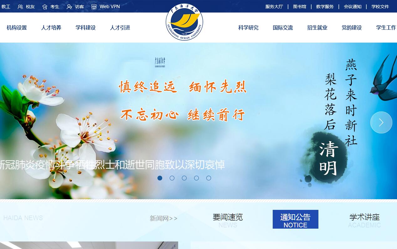 廣東海洋大學是廣東省人民政府和國家海洋局共建的省屬重點建設大學,是一所以海洋和水產(chǎn)為特色、多學科協(xié)調(diào)發(fā)展的綜合性大學,是教育部本科教學水平評估優(yōu)秀院校,是具有“學士、碩士、博士”完整學位授權(quán)體系的大學,是入選廣東高水平大學建設范圍的高校。學校的前身是創(chuàng)建于1935年的廣東省立高級水產(chǎn)職業(yè)學校。她是廣東現(xiàn)代海洋水產(chǎn)教育的發(fā)端,幾經(jīng)遷徙之后升格發(fā)展成農(nóng)業(yè)部直屬的湛江水產(chǎn)學院。1997年1月,由具有62年辦學歷史的湛江水產(chǎn)學院和39年辦學歷史的湛江農(nóng)業(yè)??茖W校實質(zhì)性合并組建湛江海洋大學。2001年12月,湛江氣象學校并入湛江海洋大學。2005年6月,經(jīng)教育部批準,湛江海洋大學更名為廣東海洋大學。學校坐落于祖國大陸最南端美麗的海濱城市——湛江市,校園總面積4892畝?,F(xiàn)有的湖光校區(qū)(校本部)、霞山校區(qū)、海濱校區(qū)分別位于國家AAAA級旅游景區(qū)湖光巖世界地質(zhì)公園東側(cè)、霞山區(qū)解放東路40號、湛江高新技術產(chǎn)業(yè)開發(fā)區(qū)海濱大道中5號。學校交通便利,湛江作為北部灣中心城市、廣東省域副中心城市和全國性綜合交通樞紐,擁有發(fā)達的海運、鐵路、公路和航空等立體式交通體系,湖光校區(qū)距離高鐵站僅12公里。學校瀕臨大海,綠樹長青,鳥語花香,環(huán)境優(yōu)美,是莘莘學子求學成才的理想之地。面向全國25個省、自治區(qū)、直轄市招生?,F(xiàn)有全日制本科生、研究生、留學生近3.2萬人,獨立學院2萬余人,成人高等教育學生1.4萬余人。學校堅持“質(zhì)量立校、人才強校、學術興校、特色揚?!钡霓k學理念,實施“內(nèi)涵發(fā)展、特色發(fā)展、創(chuàng)新發(fā)展”戰(zhàn)略,立足廣東,面向南海,輻射全國,以建設海洋和水產(chǎn)特色鮮明的高水平海洋大學為目標,培養(yǎng)具有國際視野和社會責任感,富有自主學習能力、實踐能力與創(chuàng)新精神的高素質(zhì)專門人才和行業(yè)精英,服務國家海洋事業(yè)和地方經(jīng)濟社會發(fā)展。作為華南海洋高等教育重鎮(zhèn),學校的建設與發(fā)展一直得到黨和國家領導人的親切關懷和大力支持。1997年1月原國家主席楊尚昆在為海洋大學校牌揭幕時高興地說:我們國家很需要這樣一所大學。時任中央政治局委員兼廣東省委書記謝非、李長春、張德江和汪洋均對海大在推動海洋經(jīng)濟發(fā)展方面寄予厚望。2014年11月,中央政治局委員、廣東省委書記胡春華蒞校視察時指出,廣東海洋大學要深化改革,不斷創(chuàng)新,強化內(nèi)涵發(fā)展,全面提高辦學質(zhì)量,辦一流學科、一本院校,努力建設高水平海洋大學。2018年5月,廣東省委書記李希在湛江調(diào)研時指出,湛江還有廣東海洋大學等科技研發(fā)力量,在海洋資源創(chuàng)新開發(fā)方面獨具優(yōu)勢,要用好這些重要創(chuàng)新平臺,把它們作為創(chuàng)新發(fā)展的主陣地,打造成為創(chuàng)新發(fā)展主引擎,為湛江經(jīng)濟發(fā)展提供源源不絕的新動力。廣東省人民政府原副省長歐廣源、李容根、劉昆同志和現(xiàn)任廣東省政協(xié)副主席鄧海光同志還先后擔任學校董事會主席。學校設有水產(chǎn)學院、海洋與氣象學院、食品科技學院、農(nóng)學院、機械與動力工程學院、海洋工程學院、經(jīng)濟學院、管理學院、數(shù)學與計算機學院(軟件學院)、電子與信息工程學院、化學與環(huán)境學院、航海學院、文學與新聞傳播學院、法政學院、外國語學院、中歌藝術學院、馬克思主義學院、體育與休閑學院、繼續(xù)教育學院等19個二級學院以及1個獨立學院——廣東海洋大學寸金學院。學科專業(yè)齊全。學?,F(xiàn)有“水產(chǎn)”“食品科學與工程”和“海洋科學”等3個一級學科博士點;9個一級學科碩士點,44個二級學科碩士點,5個碩士專業(yè)學位類別(共14個領域);77個本科專業(yè)。擁有6個省級重點學科,其中水產(chǎn)一級學科、水產(chǎn)品加工及貯藏工程二級學科被列為“攀峰重點學科”,海洋科學一級學科被列為“優(yōu)勢重點學科”,機械制造及其自動化、動物遺傳育種與繁殖、農(nóng)業(yè)經(jīng)濟管理3個二級學科被列為“特色重點學科”?!八a(chǎn)”“海洋科學”和“食品科學與工程”3個博士授權(quán)一級學科在全國第四輪學科評估中分別進入“B-”“C+”和“B-”檔次,全國排名分別為第6、9、24名,廣東排名分別為第1、2、3名。擁有5個國家級特色專業(yè)、1個國家級綜合改革試點專業(yè)、4個國家首批卓越農(nóng)林人才教育培養(yǎng)計劃改革試點專業(yè);10個廣東省特色專業(yè)、2個廣東省名牌專業(yè)、1個廣東省重點專業(yè)、9個廣東省綜合改革試點專業(yè)、3個廣東省應用型人才培養(yǎng)示范專業(yè)、3個廣東省戰(zhàn)略新興產(chǎn)業(yè)特色專業(yè)。師資力量雄厚。學?,F(xiàn)有教職工1983人,其中專任教師1235人、副高職稱以上人員691人、博士學位者442人;博士生導師42人、碩士生導師278人;雙聘院士5人;廣東省高等學校珠江學者特聘教授2人、青年珠江學者1人;先后有123人次入選近四批廣東省高等學?!扒О偈こ獭迸囵B(yǎng)對象;現(xiàn)有15人入選廣東省高等學校優(yōu)秀青年教師培養(y