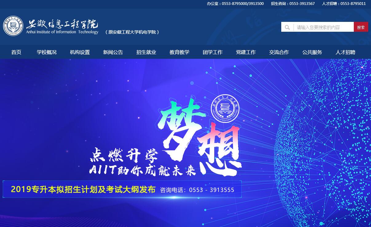 安徽信息工程學院是經國家教育部、安徽省人民政府批準設立,由高科技企業(yè)科大訊飛股份有限公司舉辦、安徽省教育廳主管的非營利性民辦應用型大學。學校位于安徽省次中心城市——蕪湖市。學校現(xiàn)有文津校區(qū)和新蕪校區(qū),總占地面積約1400畝,教職工500余人,全日制在校本科生9000余人。學校設有計算機與軟件工程學院、電氣與電子工程學院、機械工程學院、管理工程學院、藝術設計學院、大數(shù)據(jù)與人工智能學院、通識教育與外國語學院、大學生綜合素質與能力培養(yǎng)中心、大學生創(chuàng)意與創(chuàng)新中心、大學生創(chuàng)新與創(chuàng)業(yè)中心和大學生創(chuàng)業(yè)與就業(yè)競爭力促進中心等七院四中心,設置包含軟件工程、計算機科學技術、機械設計制造及其自動化、機械電子工程、電子信息工程、電氣工程及其自動化、市場營銷、財務管理、環(huán)境設計、產品設計、數(shù)據(jù)科學與大數(shù)據(jù)技術(含人工智能方向)等24個在招本科專業(yè)。學校現(xiàn)有教學科研儀器設備總值近6000萬元。圖書館建筑面積2.3萬平方米,館藏紙質圖書80余萬冊,電子圖書256萬冊,中外文電子期刊11.2萬種,以及包括知網、萬方等數(shù)據(jù)庫系統(tǒng),建有現(xiàn)代電子圖書系統(tǒng)和計算機網絡服務系統(tǒng)。學?,F(xiàn)有7個教學實驗中心,下設覆蓋全校所有專業(yè)的72個實驗室,43個教學機房,113個多媒體教室。同時建有4個省級實驗教學示范中心和華東高校中最大的體驗式拓展訓練基地,校外教學實習基地70余家。學校以“產業(yè)工程師、創(chuàng)業(yè)企業(yè)家的搖籃”為辦學愿景,踐行“厚基礎、重實踐、強應用”辦學理念,秉承“立志、誠毅、創(chuàng)新”校訓精神,緊密對接人才市場和產業(yè)需求, 依托訊飛人才、技術和資源優(yōu)勢,借鑒歐美應用科技大學辦學理念和培養(yǎng)模式,實施“面向市場、聚焦應用、創(chuàng)新驅動”系列改革舉措,致力于打造特色一流的應用研究型大學。