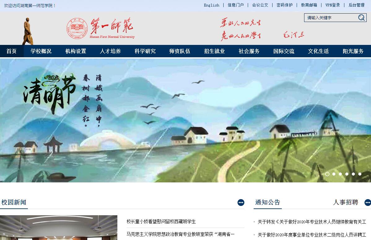 湖南第一師范學(xué)院其前身為南宋紹興年間(公元1161年)著名理學(xué)家張栻創(chuàng)辦的長沙城南書院,1903年始立為湖南師范館。1912年和1914年相繼改為湖南公立第一師范學(xué)校和湖南省立第一師范學(xué)校,解放后更名為湖南省第一師范學(xué)校。2008年升格為普通高等本科院校,并更為現(xiàn)名。學(xué)校有“千年學(xué)府、百年師范”的美譽,群星燦爛,名人輩出:中國共產(chǎn)黨的“一大”代表毛澤東、何叔衡、李達,中共“七大”書記處書記任弼時,中華民國開國元勛黃興,“難酬蹈海亦英雄”的民主革命家陳天華,清代中興名臣曾國藩、左宗棠、胡林翼,以及一大批杰出人物如蔡和森、李維漢、徐特立、楊昌濟、謝覺哉、周谷城、田漢、黎錦熙、張國基、譚延闿、王先謙、何紹基等曾在此學(xué)習(xí)或工作。一師師生(含城南書院)載入《辭?!氛哌_50人。一代偉人毛澤東在此求學(xué)、工作八個春秋,并在此從事中國共產(chǎn)黨的創(chuàng)建等一系列革命活動,實現(xiàn)了由青年學(xué)生到職業(yè)革命家的轉(zhuǎn)變、由激進的民主主義者到偉大的馬克思主義者的轉(zhuǎn)變。學(xué)校歷史悠久,文化底蘊深厚,為中國人民的教育事業(yè)和解放事業(yè)以及社會主義建設(shè)事業(yè)作出了重大貢獻。新中國成立以來,黨和國家領(lǐng)導(dǎo)十分關(guān)心學(xué)校的建設(shè)和發(fā)展。毛澤東稱贊“一師是個好學(xué)?!?,親筆題寫了“第一師范”校名,并題詞“要做人民的先生,先做人民的學(xué)生”作為校訓(xùn)。徐特立6次來校視察,并題詞“實事求是,不自以為是”作為校風(fēng)。江澤民為矗立在校園內(nèi)的“青年毛澤東”銅像題名。黨和國家領(lǐng)導(dǎo)人鄧穎超、宋任窮、宋平、李嵐清、李長春、李鐵映、劉延?xùn)|、彭珮云、陳至立、周鐵農(nóng)、路甬祥、徐匡迪、王兆國等來校視察。并有多位外國元首來校訪問。學(xué)校以師范教育為特色,現(xiàn)有城南書院校區(qū)和東方紅校區(qū),校園占地面積1346畝。在職教職工1000余人,其中教授92人,副教授261人,博士107人,碩士546人,享受政府特殊津貼專家3人,省級教學(xué)名師1人。學(xué)?,F(xiàn)有12個教學(xué)院部,有31個本科專業(yè),覆蓋了教育學(xué)、文學(xué)、理學(xué)、工學(xué)、管理學(xué)、經(jīng)濟學(xué)、法學(xué)、藝術(shù)學(xué)等八大學(xué)科門類,全日制在校本科生16000余人。擁有2個省部級科技創(chuàng)新團隊和2個省部級教學(xué)團隊,國家和省級教學(xué)科研平臺46個。學(xué)校為全國重點文物保護單位、全國愛國主義教育示范基地、全國紅色旅游經(jīng)典景區(qū)、國家卓越小學(xué)教師培養(yǎng)計劃單位、國家級小學(xué)骨干教師培訓(xùn)基地、國家級教育體制改革試點單位、全國學(xué)校藝術(shù)教育先進單位、全省小學(xué)教師培養(yǎng)培訓(xùn)和教研教改基地、湖南省語言文字規(guī)范化示范學(xué)校。