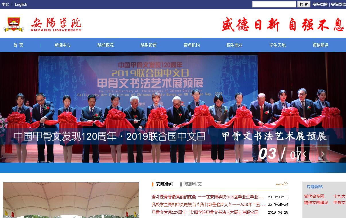 學(xué)校坐落于甲骨文故鄉(xiāng)、殷墟所在地、紅旗渠精神發(fā)祥地、國家歷史文化名城、中國八大古都之一——安陽,是經(jīng)國家教育部批準(zhǔn)設(shè)立的一所實(shí)施普通本科學(xué)歷教育為主的高等學(xué)校。學(xué)校前身是始建于2003年4月的安陽師范學(xué)院人文管理學(xué)院,2015年10月順利通過全國高等學(xué)校設(shè)置評(píng)議委員會(huì)專家組轉(zhuǎn)設(shè)驗(yàn)收,2016年5月正式揭牌更名為安陽學(xué)院。學(xué)?,F(xiàn)有“十四院兩部”,即航空工程學(xué)院、計(jì)算機(jī)科學(xué)與技術(shù)學(xué)院、建筑工程學(xué)院、數(shù)理學(xué)院、文學(xué)與傳媒學(xué)院、外國語學(xué)院、國際教育學(xué)院、財(cái)會(huì)學(xué)院、經(jīng)濟(jì)與管理學(xué)院、音樂學(xué)院、美術(shù)學(xué)院、職業(yè)教育學(xué)院、馬克思主義學(xué)院、繼續(xù)教育學(xué)院、體育教學(xué)部和公共藝術(shù)教學(xué)部。學(xué)校以學(xué)科建設(shè)為龍頭,始終堅(jiān)持“優(yōu)化結(jié)構(gòu)、突出重點(diǎn)、交叉匯集、協(xié)調(diào)發(fā)展”的學(xué)科建設(shè)指導(dǎo)思想,現(xiàn)設(shè)有40個(gè)本科專業(yè),30個(gè)??茖I(yè),4個(gè)對(duì)口本科專業(yè),10個(gè)對(duì)口??茖I(yè),19個(gè)五年一貫制大專和7個(gè)中專專業(yè),涵蓋文學(xué)、理學(xué)、工學(xué)、法學(xué)、經(jīng)濟(jì)學(xué)、管理學(xué)、教育學(xué)和藝術(shù)學(xué)等八大學(xué)科門類。學(xué)校始終堅(jiān)持教學(xué)工作的中心地位,以質(zhì)量工程建設(shè)為主線,深入開展教育教學(xué)改革。會(huì)計(jì)學(xué)、漢語國際教育、數(shù)學(xué)與應(yīng)用數(shù)學(xué)、機(jī)械電子工程、環(huán)境設(shè)計(jì)等5個(gè)專業(yè)入選河南省民辦高校品牌專業(yè)。機(jī)電與信息工程實(shí)驗(yàn)教學(xué)示范中心被評(píng)選為省級(jí)實(shí)驗(yàn)教學(xué)示范中心;機(jī)械電子工程專業(yè)被評(píng)為河南省重點(diǎn)學(xué)科;計(jì)算機(jī)應(yīng)用基礎(chǔ)課程為省級(jí)精品在線開放課程;基礎(chǔ)英語教研室獲批河南省優(yōu)秀基層教學(xué)組織;周易文化大數(shù)據(jù)云平臺(tái)實(shí)驗(yàn)室獲批安陽市重點(diǎn)實(shí)驗(yàn)室;物流管理專業(yè)獲批河南省高等學(xué)校專業(yè)綜合改革試點(diǎn)項(xiàng)目;我校“安陽學(xué)院教學(xué)質(zhì)量評(píng)估研究院”成功獲批河南省高校智庫。2018年12月,我校甲骨文藝術(shù)研究中心在聯(lián)合國教科文組織摩洛哥人工智能論壇期間,成功舉辦“水墨聚焦·中國甲骨文書法藝術(shù)展”。學(xué)校積極實(shí)施科研成果獎(jiǎng)勵(lì)辦法,共計(jì)發(fā)表高水平學(xué)術(shù)論文1500余篇,承擔(dān)各級(jí)各類科研項(xiàng)目共計(jì)1000余項(xiàng),獲得各類科研成果獎(jiǎng)96項(xiàng),出版專著教材共110部,獲批國家專利多項(xiàng)。學(xué)校大力實(shí)施“人才興?!睉?zhàn)略,師資力量雄厚,名師薈萃,擁有一支師德高尚、業(yè)務(wù)精湛、結(jié)構(gòu)合理、充滿活力的高水平“雙師型”教師隊(duì)伍,包括全國模范教師1人,全國優(yōu)秀教師1人,河南省高校教學(xué)名師2人,省管優(yōu)秀專家2人,曾憲梓教育基金會(huì)全國優(yōu)秀教師2人,二級(jí)教授3人,河南省五一勞動(dòng)獎(jiǎng)?wù)芦@得者1人,計(jì)算機(jī)應(yīng)用技術(shù)河南省重點(diǎn)學(xué)科帶頭人1人,河南省教育廳優(yōu)秀管理人才2人,市管優(yōu)秀專家2人。學(xué)校現(xiàn)有全日制在校生2萬余人,各類建筑分布合理,主要由學(xué)習(xí)區(qū)、生活區(qū)、休閑區(qū)、運(yùn)動(dòng)區(qū)四大區(qū)域組成,環(huán)境優(yōu)美,是學(xué)生學(xué)習(xí)和生活的理想園地。學(xué)校教學(xué)設(shè)施齊全,教學(xué)儀器設(shè)備完善,能夠滿足實(shí)驗(yàn)教學(xué)及相應(yīng)學(xué)科開課。館藏文獻(xiàn)豐富,包括紙質(zhì)文獻(xiàn)、電子文獻(xiàn)、多種報(bào)刊及中外文數(shù)據(jù)庫。學(xué)校全面貫徹落實(shí)黨的教育方針,堅(jiān)持“立德樹人、知行合一、特色立校、內(nèi)涵強(qiáng)?!钡霓k學(xué)理念,以全面提升人才培養(yǎng)能力為核心,以校企合作為平臺(tái),增強(qiáng)專業(yè)自我發(fā)展能力,深化教育教學(xué)改革,加強(qiáng)學(xué)科專業(yè)建設(shè),提高教師隊(duì)伍素質(zhì),主動(dòng)適應(yīng)經(jīng)濟(jì)轉(zhuǎn)型和社會(huì)發(fā)展,進(jìn)而不斷提高教育教學(xué)水平,立足安陽、面向河南,結(jié)合區(qū)域經(jīng)濟(jì)社會(huì)發(fā)展和產(chǎn)業(yè)結(jié)構(gòu)調(diào)整需求,培養(yǎng)具有高度社會(huì)責(zé)任感和職業(yè)操守、創(chuàng)新精神和實(shí)踐技能的高素質(zhì)應(yīng)用型人才。學(xué)校將全面貫徹落實(shí)黨的十九大精神和省委十屆六次全會(huì)暨省委工作會(huì)議精神,突出特色發(fā)展和內(nèi)涵建設(shè),以立德樹人為根本,以質(zhì)量提升為核心,以改革創(chuàng)新為動(dòng)力,以融入?yún)^(qū)域和服務(wù)地方為導(dǎo)向,全面深化改革,搶抓高等教育改革和高校轉(zhuǎn)型發(fā)展機(jī)遇,努力把學(xué)校建設(shè)成為辦學(xué)條件優(yōu)良、管理規(guī)范、特色鮮明的高水平應
