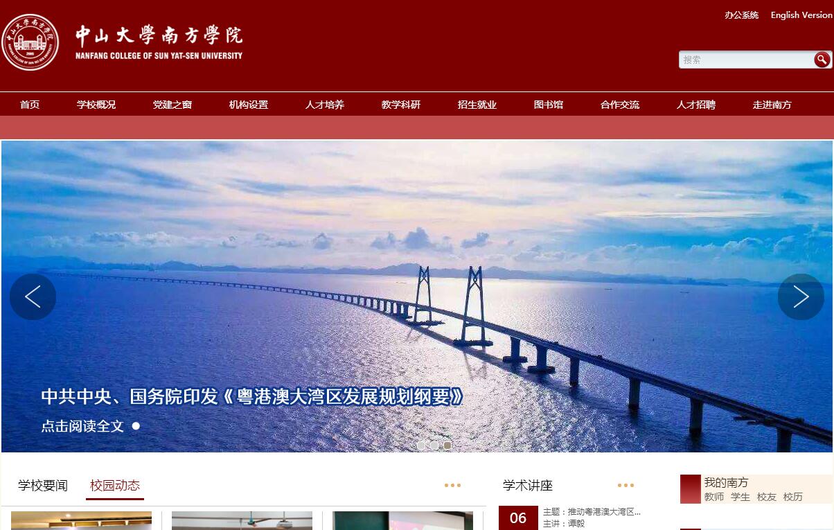 中山大學(xué)南方學(xué)院是2006年經(jīng)教育部批準,由中山大學(xué)與廣東珠江投資集團合作創(chuàng)辦的獨立學(xué)院,是一所多學(xué)科全日制應(yīng)用型本科高等學(xué)校,2016年被遴選為廣東省普通本科轉(zhuǎn)型試點高校。學(xué)校位于素有“北回歸線上的明珠”和“廣州后花園”之譽的廣州市從化區(qū),校園占地面積1000畝。經(jīng)過十年的建設(shè)和發(fā)展,現(xiàn)已擁有完備的教學(xué)生活和文化體育設(shè)施,校園布局有致,秀麗寧靜,是陶冶情操、讀書治學(xué)的勝境。學(xué)校圖書館面積2.91萬平方米,藏書205萬冊,共享中山大學(xué)圖書館中文電子期刊68375種;外文電子期刊52123種;中文電子圖書154.37萬冊;外文電子圖書55.98萬冊,還有超星移動圖書館、博看暢銷期刊數(shù)據(jù)庫和聯(lián)圖隨書光盤檢索平臺,已初步建設(shè)成為數(shù)字化圖書館,更開創(chuàng)廣東省高校圖書館24小時開放的管理模式,全方位滿足讀者需求。學(xué)校設(shè)有10個院系40個專業(yè),形成以管理學(xué)、經(jīng)濟學(xué)、文學(xué)為主,工學(xué)、理學(xué)、醫(yī)學(xué)、藝術(shù)學(xué)協(xié)調(diào)發(fā)展、結(jié)構(gòu)合理、優(yōu)勢互補的學(xué)科體系?,F(xiàn)有本科生19232人,繼續(xù)教育在校生2348人。學(xué)?,F(xiàn)有2個廣東省省級實驗教學(xué)示范中心,3個省級特色專業(yè),5個省級大學(xué)生實踐教學(xué)基地、3個省級教學(xué)團隊、5個省級精品資源共享課、1個省級戰(zhàn)略新興產(chǎn)業(yè)特色專業(yè)項目,7個省級綜合改革試點專業(yè)項目,6個省級人才培養(yǎng)模式創(chuàng)新實驗區(qū)、1個省級應(yīng)用型人才培養(yǎng)示范專業(yè)、1個省級重點專業(yè)、2個省級重點學(xué)科、1個省級卓越人才培養(yǎng)計劃、6個校級重點專業(yè)建設(shè)項目和5個校級特色專業(yè)建設(shè)項目。并先后成立了金融市場與動能策略研究中心等15個校級、院系級科研機構(gòu)和1各校級科研團隊。目前,學(xué)校承擔國家級項目3項,省部級項目108項,橫向項目32項,項目經(jīng)費總額達2063.9萬元。自2013年起,學(xué)校教職員工共發(fā)表學(xué)術(shù)論文1115篇,被SCI、SSCI、EI、TSSCI等國際權(quán)威期刊論文索引收錄的高水平論文174篇,其中學(xué)生7篇,位居全國獨立學(xué)院前列。學(xué)生積極參加各類專業(yè)相關(guān)比賽,榮獲省部級及以上獎項近千項。學(xué)校大力實施“人才強院”戰(zhàn)略,師資主要來自中山大學(xué)教師,國內(nèi)“985”、“211”高校具有碩士、博士學(xué)位研究生,以及美國、英國、法國、瑞典、日本、韓國、臺灣、香港等地的優(yōu)秀教師人才,同時面向全國招聘具有海外留學(xué)經(jīng)驗和有關(guān)行業(yè)、企業(yè)富有實踐經(jīng)驗的高層管理人士、專業(yè)技術(shù)骨干任教師,建立了一支具有國際視野、結(jié)構(gòu)合理的高素質(zhì)師資隊伍。學(xué)?,F(xiàn)有教師879人,其中博士生導(dǎo)師12人,教育部新世紀優(yōu)秀人才2人,廣東省特支計劃教學(xué)名師1人,廣東省高等學(xué)校教學(xué)名師1人,南粵優(yōu)秀教師4人,廣東省優(yōu)秀教學(xué)成果獎獲得者2人,廣東省高等學(xué)校優(yōu)秀青年教師培養(yǎng)計劃培養(yǎng)對象1人、中青年教師國內(nèi)訪問學(xué)者23人、“千百十人才培養(yǎng)工程”校級培養(yǎng)對象5人,廣東省民辦教育優(yōu)秀教育工作者1人,廣東省民辦教育優(yōu)秀教師1人。學(xué)校特聘知名學(xué)者夏書章、黃天驥、陳平原等3名教授擔任學(xué)術(shù)顧問,聘請巴曙松、任劍濤、張軍、鐘玫、譚勁松、王哲民和陳樹衡等9名具有重要影響力的學(xué)者(教授)擔任講座教授。同時,學(xué)校不斷完善并創(chuàng)新人才引進機制,2016-2017年引進臺灣博士46人,建立了一流的、有特色的本科教學(xué)團隊及科學(xué)研究團隊。學(xué)校堅持“高起點、有特色、更開放”的辦學(xué)理念,堅持為地方經(jīng)濟建設(shè)和社會發(fā)展培養(yǎng)和輸送綜合素質(zhì)高、實踐能力強、具有創(chuàng)新精神的應(yīng)用型人才的辦學(xué)定位,不斷深化教學(xué)改革,按照“寬口徑、厚基礎(chǔ)、精專業(yè)、強能力、以就業(yè)為導(dǎo)向”的人才培養(yǎng)模式,構(gòu)建高素質(zhì)應(yīng)用型人才培養(yǎng)體系。學(xué)校從2013年開始實施自由轉(zhuǎn)專業(yè),2015年起開始實施完全學(xué)分制,并作為廣東省實行完全學(xué)分制的試點高校。學(xué)校秉承“以生為本”的教育理念和因材施教的教育原則,實行彈性學(xué)制,使學(xué)校教學(xué)資源的配置方式由學(xué)校計劃調(diào)控為主變?yōu)閷W(xué)生自主選擇為主,搭建了尊重學(xué)生個性發(fā)展、適應(yīng)社會發(fā)展的教育平臺。學(xué)校創(chuàng)造性的實施“思政、通識、學(xué)工”三位一體育人理念,以思想政治教育為靈魂,以通識教育為素養(yǎng),以專任教師為引導(dǎo)、輔導(dǎo)員為教輔、學(xué)生自主為實踐,共同形成培養(yǎng)學(xué)生“成人”的多維育人體系,更有利于學(xué)生素質(zhì)培養(yǎng)和能力提升,并具有鮮明特色的課程體系與教學(xué)模式。為適應(yīng)社會需求,針對學(xué)生特點,學(xué)校先后開設(shè)了“政商研究院”、“ACCA、CGA實驗班”、“經(jīng)濟類