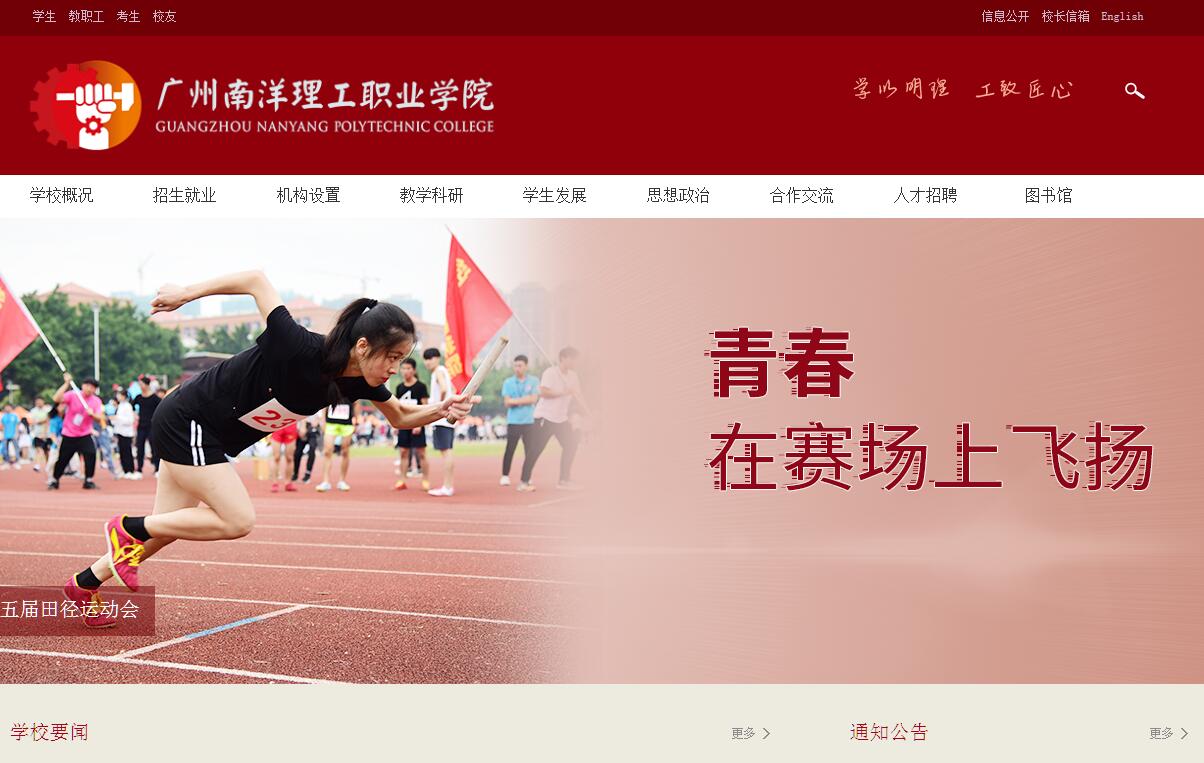 廣州南洋理工職業(yè)學(xué)院,是經(jīng)廣東省人民政府批準(zhǔn)、國家教育部備案的省屬全日制普通高等學(xué)校,簡稱“南洋理工”。學(xué)校與廣東科技學(xué)院、廣州華南商貿(mào)職業(yè)學(xué)院同屬廣東南博教育集團(tuán)旗下的高等院校,依托南博教育集團(tuán)雄厚的辦學(xué)實(shí)力與集團(tuán)化辦學(xué)優(yōu)勢(shì),取得了卓越的辦學(xué)成績,贏得了社會(huì)各界的一致好評(píng)。學(xué)校以“創(chuàng)百年學(xué)府,育產(chǎn)業(yè)精英”為愿景與使命,遵循“育人立校,質(zhì)量興校,人才強(qiáng)校,特色榮校,制度治?!钡霓k學(xué)理念,立足廣州、面向珠三角、服務(wù)廣東,主動(dòng)適應(yīng)珠三角產(chǎn)業(yè)結(jié)構(gòu)和區(qū)域經(jīng)濟(jì)社會(huì)發(fā)展需求,深入推進(jìn)基于“產(chǎn)教融合、校企合作、工學(xué)結(jié)合、頂崗實(shí)習(xí)”的人才培養(yǎng)模式改革,致力于培養(yǎng)“德才兼?zhèn)?,技能突出,全面發(fā)展”的應(yīng)用型、高素質(zhì)技術(shù)技能人才。2016年底,學(xué)校正式確立了“十三五”期間升格為本科院校的發(fā)展目標(biāo)。近年來,學(xué)校大力推進(jìn)由外延式發(fā)展向內(nèi)涵式發(fā)展的轉(zhuǎn)變,著力打造“思想道德好、實(shí)踐技能高、綜合素質(zhì)高和就業(yè)質(zhì)量高”即“一好三高”的人才培養(yǎng)特色。先后被民政部授予“全國民辦非企業(yè)單位優(yōu)秀服務(wù)品牌”稱號(hào);被教育部國防教育辦公室、全軍學(xué)生軍訓(xùn)工作辦公室授予“優(yōu)秀組織單位”稱號(hào);被廣東省教育廳評(píng)為“廣東省就業(yè)工作督查優(yōu)秀等級(jí)”,并榮獲“最具競爭力提升院校”稱號(hào)。學(xué)校還先后榮獲“廣東省民辦教育突出貢獻(xiàn)獎(jiǎng)”、“廣東最具就業(yè)競爭力民辦學(xué)院”、“廣東最具社會(huì)認(rèn)可度學(xué)院”、“廣東省國防教育先進(jìn)工作單位”、教育部“國防教育特色學(xué)?!钡仁鈽s。目前,廣州南洋理工職業(yè)學(xué)院正站在新的歷史起點(diǎn)上,為把學(xué)校建設(shè)成為廣東一流、全國知名的高水平民辦理工類大學(xué)而努力奮斗!學(xué)校發(fā)展歷程:廣州南洋理工職業(yè)學(xué)創(chuàng)建于1984年,其前身為“廣州南洋自學(xué)輔導(dǎo)大學(xué)”,后于1996年更名為“廣州南洋科技專修學(xué)院”,2004年經(jīng)廣東省人民政府批準(zhǔn)、國家教育部備案設(shè)立“廣州南洋理工職業(yè)學(xué)院”,正式升格為全日制普通高等學(xué)校。辦學(xué)條件基本完善:學(xué)校坐落在有“廣州后花園”之稱的廣州市從化區(qū)。設(shè)有建筑工程學(xué)院、機(jī)電與汽車學(xué)院、信息工程學(xué)院、經(jīng)濟(jì)管理學(xué)院、服裝與設(shè)計(jì)學(xué)院、外國語學(xué)院、中醫(yī)健康學(xué)院、馬克思主義學(xué)院、通識(shí)教育學(xué)院九個(gè)二級(jí)學(xué)院;現(xiàn)有全日制專科在校生11235人,教職工700余人,其中專任教師近500人;校園面積509畝,校舍近20萬平方米;擁有先進(jìn)的專業(yè)實(shí)驗(yàn)室(場(chǎng))120個(gè),多媒體教室156間,教學(xué)儀器設(shè)備總值達(dá) 4700多萬元,普通課室全部安裝空調(diào);圖書館館藏紙質(zhì)圖書88萬多冊(cè)、電子圖書41萬冊(cè);學(xué)生公寓全部裝有空調(diào)、寬帶,提供熱水供應(yīng)等,并在生活區(qū)建有商業(yè)一條街等生活配套設(shè)施,獲評(píng)“廣東省學(xué)校衛(wèi)生管理評(píng)價(jià)優(yōu)秀學(xué)?!薄=逃虒W(xué)改革成效顯著:學(xué)校專業(yè)設(shè)置以工科類專業(yè)為主,經(jīng)、管、文、藝類專業(yè)協(xié)調(diào)發(fā)展,現(xiàn)有招生專業(yè)41個(gè),其中省級(jí)品牌專業(yè)1個(gè),省財(cái)政重點(diǎn)支持專業(yè)5個(gè),校級(jí)重點(diǎn)專業(yè)8個(gè);5項(xiàng)省級(jí)教學(xué)成果培育項(xiàng)目獲省教育廳立項(xiàng);“高職院?!寄軆?yōu)先 基礎(chǔ)模塊’教學(xué)改革研究”入選2016年度民辦職業(yè)技術(shù)教育“十佳”案例;依托“學(xué)生軍政教導(dǎo)隊(duì)”創(chuàng)新大學(xué)生思想政治工作模式,成效顯著,先后榮獲國家級(jí)獎(jiǎng)項(xiàng)5項(xiàng)、省級(jí)獎(jiǎng)項(xiàng)13項(xiàng)、市級(jí)獎(jiǎng)項(xiàng)5項(xiàng)。人才培養(yǎng)質(zhì)量不斷提高:學(xué)校遵循“以賽促學(xué),以賽促教,以賽促改”的原則,積極組織師生參加各級(jí)各類技能大賽,在校生在全國職業(yè)院校技能大賽、全國網(wǎng)站設(shè)計(jì)開發(fā)大賽、全國跨境電商大賽、全國電子商務(wù)類三創(chuàng)大賽等賽事中成績優(yōu)異;畢業(yè)生就業(yè)率一直保持在98%以上。根據(jù)第三方調(diào)查機(jī)構(gòu)麥可思報(bào)告,學(xué)校在廣東省高職院校畢業(yè)生就業(yè)現(xiàn)狀滿意度調(diào)查中排名全省第二;根據(jù)權(quán)威媒體廣州日?qǐng)?bào)作為第三方評(píng)估機(jī)構(gòu)發(fā)布的“2017年全國民辦高職高專排行榜”顯示,我校位居全國民辦高職高專院校排名第29名、廣東省民辦高職高專院校第3名。科研實(shí)力大幅提升:近五年來,學(xué)校教科研實(shí)力及社會(huì)服務(wù)能力快速提升,先后有100多項(xiàng)科研課題獲立項(xiàng),科研經(jīng)費(fèi
