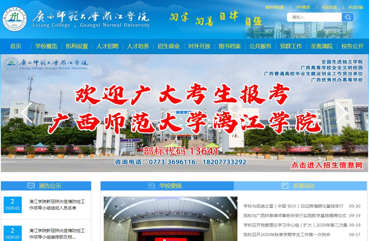 廣西師范大學(xué)漓江學(xué)院創(chuàng)建于2001年5月,是經(jīng)教育部批準(zhǔn),由廣西師范大學(xué)按新機(jī)制、新模式舉辦的全日制應(yīng)用型普通本科高等學(xué)校(獨(dú)立學(xué)院)。學(xué)校是中國獨(dú)立學(xué)院協(xié)作會常務(wù)理事單位、中國教育發(fā)展戰(zhàn)略學(xué)會教育管理信息化專業(yè)委員會理事單位、全國(寧波)文化創(chuàng)意產(chǎn)教合作聯(lián)盟理事單位、廣西高等教育學(xué)會會員單位、廣西“應(yīng)用技術(shù)大學(xué)(學(xué)院)聯(lián)盟”會員單位。學(xué)校地處國家歷史文化名城桂林市,坐落于漓江之濱、雁山腳下,東向與廣西師范大學(xué)雁山校區(qū)隔路相對。校園占地近900畝,建筑面積21.92萬平方米,圖書館藏書76.8萬冊,建有多媒體教室93間、各類實(shí)驗(yàn)實(shí)訓(xùn)場所(室)76個(gè)(間),總資產(chǎn)近7億元。學(xué)校環(huán)境優(yōu)美,辦學(xué)和生活服務(wù)設(shè)施完善,無線網(wǎng)絡(luò)校園全覆蓋,為學(xué)子們營造了沐浴書香、暢游學(xué)海、靜學(xué)深思的修讀氛圍。學(xué)?,F(xiàn)有語言文學(xué)學(xué)院、傳媒學(xué)院、經(jīng)濟(jì)與管理學(xué)院、商貿(mào)與法律學(xué)院、教育與音樂學(xué)院、設(shè)計(jì)學(xué)院、體育與健康學(xué)院、理工學(xué)院、馬克思主義學(xué)院/至善學(xué)院(合署)等9個(gè)二級學(xué)院,校企共建名淘電商學(xué)院、粵嵌電子工程學(xué)院、融媒體學(xué)院等3個(gè)產(chǎn)業(yè)(行業(yè))學(xué)院。開設(shè)49個(gè)本科專業(yè),初步形成了涵蓋經(jīng)、法、教、文、理、工、管、藝8個(gè)學(xué)科門類,以面向和對接現(xiàn)代服務(wù)業(yè)專業(yè)為主體、以教師教育類和人文社科類專業(yè)為兩翼,以文化創(chuàng)意與教育服務(wù)、財(cái)經(jīng)商貿(mào)與法律服務(wù)、信息與通信技術(shù)服務(wù)、旅游+運(yùn)動康養(yǎng)服務(wù)4個(gè)專業(yè)集群為平臺的“一體兩翼四集群”專業(yè)結(jié)構(gòu)格局。建有廣西高校自治區(qū)級特色專業(yè)2個(gè),廣西高校自治區(qū)級創(chuàng)新創(chuàng)業(yè)教育示范專業(yè)、自治區(qū)級轉(zhuǎn)型發(fā)展試點(diǎn)專業(yè)(群)、自治區(qū)級協(xié)同育人(建設(shè))平臺、自治區(qū)級實(shí)驗(yàn)教學(xué)示范(建設(shè))中心、自治區(qū)級大學(xué)生校外實(shí)踐教學(xué)基地、自治區(qū)級大學(xué)生創(chuàng)業(yè)示范基地各1個(gè),以及廣西民辦高校重點(diǎn)專業(yè)和重點(diǎn)支持建設(shè)專業(yè)8個(gè),自治區(qū)一流本科專業(yè)建設(shè)點(diǎn)2個(gè),自治區(qū)級一流本科課程3門。學(xué)校面向全國22個(gè)?。ㄊ?、自治區(qū))招生,現(xiàn)有全日制普通本科在校生12568人,其中高職高專起點(diǎn)(專升本)學(xué)生269人。近年來,學(xué)生在國家級、自治區(qū)級各類學(xué)科(技能)大賽中獲獎(jiǎng)2000余人次,斬獲全國大學(xué)生電子設(shè)計(jì)競賽一等獎(jiǎng)、全國高校國際貿(mào)易專業(yè)技能大賽一等獎(jiǎng)、全國大學(xué)生廣告藝術(shù)大賽二等獎(jiǎng),以及廣西師范生教學(xué)技能大賽高中組一等獎(jiǎng)和初中組一等獎(jiǎng)、全國大學(xué)生數(shù)學(xué)建模競賽廣西賽區(qū)一等獎(jiǎng)、全區(qū)師范生教學(xué)信息化大賽一等獎(jiǎng)等高含金量的獎(jiǎng)項(xiàng)。近五年來,畢業(yè)生就業(yè)率居廣西同類高校前列,先后獲得2015年度、2018年度、2019年度“廣西普通高校畢業(yè)生就業(yè)創(chuàng)業(yè)工作突出單位”殊榮,2019屆畢業(yè)生初次就業(yè)率和一次就業(yè)率分別達(dá)到91.93%和89.01%。截止2019年7月,學(xué)校為國家和地方輸送了14屆畢業(yè)生共28000余人。學(xué)?,F(xiàn)有教職工近500人,其中自有專任教師近300人。自有專任教師中,副高以上職稱64人,碩士以上學(xué)位210人。擁有全國優(yōu)秀教育工作者1人,教育部萬名優(yōu)秀創(chuàng)新創(chuàng)業(yè)導(dǎo)師庫入選導(dǎo)師4人,自治區(qū)優(yōu)秀創(chuàng)新創(chuàng)業(yè)導(dǎo)師人才庫首批入選導(dǎo)師13人,教育部全國高校思政教育優(yōu)秀工作者1人,廣西高校首批“卓越學(xué)者”1人,廣西高校優(yōu)秀中青年骨干教師培養(yǎng)工程人選3人,廣西高校優(yōu)秀青年骨干教師國內(nèi)訪問學(xué)者計(jì)劃人選4人,西部地區(qū)高校人才培養(yǎng)特別項(xiàng)目人選3人,廣西高校青年教師教學(xué)業(yè)務(wù)能力提升計(jì)劃人選58人,廣西民辦高?!皟?yōu)秀教師”15人,國家留學(xué)基金委建設(shè)高水平大學(xué)公派研究生項(xiàng)目人選2人,中國教育發(fā)展戰(zhàn)略學(xué)會教育管理信息化專業(yè)委員會理事1人,全國(寧波)文化創(chuàng)意產(chǎn)教合作聯(lián)盟理事單位理事1人,廣西高校中國語言文學(xué)類教學(xué)指導(dǎo)委員會副主任委員1人、高等學(xué)校對口支援教學(xué)指導(dǎo)委員會委員1人、英語類教學(xué)指導(dǎo)委員會委員1人,國家社科基金課題立項(xiàng)、項(xiàng)目結(jié)項(xiàng)通訊評審專家1人,廣西高校教師系列專業(yè)技術(shù)職務(wù)評審專家1人,廣西高等學(xué)校教師資格專家審查委員會委員1人,廣西民間文藝家協(xié)會副主席1人,廣西語言文學(xué)學(xué)會會長1人,廣西壯學(x