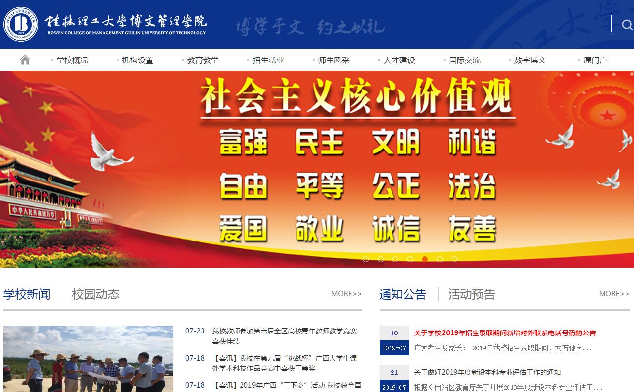 桂林理工大學(xué)博文管理學(xué)院創(chuàng)辦于2002年4月,是經(jīng)教育部批準(zhǔn),以新機(jī)制創(chuàng)辦、獨(dú)立設(shè)置的全日制普通本科高校。學(xué)校現(xiàn)有桂林、南寧兩個(gè)校區(qū)。桂林校區(qū)位于雁山區(qū)教育園區(qū),占地700余畝,規(guī)劃總建筑面積48萬平方米。擁有現(xiàn)代化的教學(xué)樓,功能先進(jìn)的實(shí)驗(yàn)室、實(shí)訓(xùn)室;設(shè)施完備的宿舍樓、食堂、體育場館,環(huán)境優(yōu)雅、生活便利。南寧校區(qū)位于廣西東盟經(jīng)濟(jì)技術(shù)開發(fā)區(qū),占地面積1000余畝,規(guī)劃總建筑面積50萬平方米,預(yù)計(jì)2019年初步建成。學(xué)校秉承“博學(xué)于文,約之以禮”的校訓(xùn),堅(jiān)持“育人為本、質(zhì)量立校、特色強(qiáng)校”的辦學(xué)理念,依托桂林理工大學(xué)優(yōu)質(zhì)辦學(xué)資源,以土建、地質(zhì)、經(jīng)貿(mào)等學(xué)科專業(yè)為重點(diǎn),形成以工為主,管、經(jīng)、文、藝、理等多學(xué)科協(xié)調(diào)發(fā)展的學(xué)科體系?,F(xiàn)開設(shè)34個(gè)本科專業(yè)。擁有廣西高校特色專業(yè)1個(gè)、轉(zhuǎn)型試點(diǎn)專業(yè)1個(gè),廣西民辦高校重點(diǎn)建設(shè)專業(yè)5個(gè),自治區(qū)級(jí)創(chuàng)新創(chuàng)業(yè)教育改革示范專業(yè)1個(gè)、創(chuàng)新創(chuàng)業(yè)教學(xué)團(tuán)隊(duì)1個(gè)、協(xié)同育人平臺(tái)1個(gè)。設(shè)有土木與工程學(xué)院、商學(xué)院、信息工程學(xué)院、建筑與設(shè)計(jì)學(xué)院、文理學(xué)院等教學(xué)單位,在校學(xué)生近13000人,專任教師644人,其中具有高級(jí)職稱的專任教師240人,具有碩士及以上學(xué)位專任教師共481人。近年來,我校教師主持和參與國家級(jí)科研項(xiàng)目20余項(xiàng);主持省部級(jí)科研教改立項(xiàng)項(xiàng)目43項(xiàng),市廳級(jí)科研教改立項(xiàng)項(xiàng)目130余項(xiàng);獲得省部級(jí)教學(xué)成果獎(jiǎng)3項(xiàng);發(fā)明專利6項(xiàng),出版專著、教材46部,發(fā)表學(xué)術(shù)論文近900篇。學(xué)校是北方國際大學(xué)聯(lián)盟成員高校,并與加拿大、英國等多個(gè)國家和臺(tái)灣等地區(qū)多所高校簽署合作辦學(xué)協(xié)議,擁有校外實(shí)習(xí)基地100多個(gè)。學(xué)生以專業(yè)基礎(chǔ)扎實(shí),實(shí)踐能力強(qiáng)倍受社會(huì)稱贊企業(yè)歡迎。近年來,學(xué)校實(shí)行人才分類培養(yǎng)改革,為學(xué)生構(gòu)建了專業(yè)技能型、創(chuàng)新創(chuàng)業(yè)型、考研深造型、國際教育型等多種成才通道,滿足了學(xué)生多樣化成才需求。學(xué)校2013年啟動(dòng)微留學(xué)項(xiàng)目,至2018年底有600多名學(xué)生走出國門開拓視野、提升自我;2018年啟動(dòng)“本碩直通”項(xiàng)目,多名學(xué)生收到來自英國、澳大利亞等世界名校的錄取通知書。歷年來,學(xué)校畢業(yè)生考研上線率達(dá)30%,一次就業(yè)率超過92%。近五年新生報(bào)到率均達(dá)94%以上,在廣西獨(dú)立學(xué)院中名列前茅。近年來,學(xué)生在全國大學(xué)生數(shù)學(xué)建模競賽、英語競賽、“挑戰(zhàn)杯”課外學(xué)術(shù)科技作品競賽、電子設(shè)計(jì)大賽等學(xué)科競賽中,獲國家級(jí)獎(jiǎng)360余項(xiàng),省部級(jí)獎(jiǎng)920余項(xiàng)。學(xué)校先后榮獲“自治區(qū)安全文明校園”、“自治區(qū)優(yōu)秀衛(wèi)生學(xué)?!薄ⅰ案咝K枷胝喂ぷ飨冗M(jìn)單位”等榮譽(yù)稱號(hào)。2013、2014、2015連續(xù)三年被評(píng)為“十大品牌獨(dú)立學(xué)院”、“最具品牌影響力獨(dú)立學(xué)院”、“中國社會(huì)影響力獨(dú)立學(xué)院”,2016年被評(píng)為“就業(yè)典型高?!?,2017年被評(píng)為“創(chuàng)新創(chuàng)業(yè)典型高?!?,2018年被評(píng)為“雙創(chuàng)典型高?!?。漓水悠悠,書聲瑯瑯。學(xué)校“十三五”規(guī)劃確立了“轉(zhuǎn)型發(fā)展、質(zhì)量提升、品牌建設(shè)”的發(fā)展戰(zhàn)略,學(xué)校將進(jìn)一步加大投入,加速教學(xué)轉(zhuǎn)型,立足廣西,面向全國,服務(wù)地方,服務(wù)行業(yè),努力建設(shè)區(qū)域領(lǐng)先、特色鮮明的高水平應(yīng)用技術(shù)型高校。