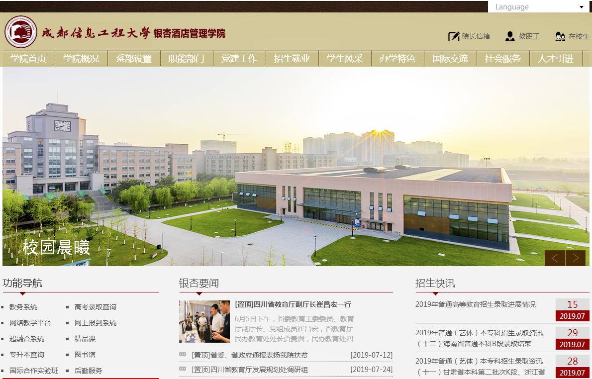 成都信息工程大學(xué)銀杏酒店管理學(xué)院成立于2002年,是由成都銀杏資產(chǎn)管理有限公司全額出資,與成都信息工程大學(xué)合作舉辦的本科層次獨(dú)立學(xué)院,是四川省首批由教育部審核確認(rèn)的獨(dú)立學(xué)院之一。學(xué)院位于成都市郫都區(qū),根植天府沃土,為人文歷史厚積之地。古有望帝啼鵑,今有銀杏含芳,交通便利,教學(xué)、生活設(shè)施完善,環(huán)境幽雅、花木繁茂、碧草如茵,讀書治學(xué)兩相宜。建院以來,秉承“服務(wù)養(yǎng)成,知行相濟(jì)”的校訓(xùn),本著“成就學(xué)生,服務(wù)社會(huì)”的辦學(xué)理念,面向現(xiàn)代服務(wù)業(yè),著力培養(yǎng)具備專業(yè)理論知識(shí)技能,具有人文素養(yǎng)、創(chuàng)新意識(shí)和實(shí)踐能力的高素質(zhì)應(yīng)用型人才。歷經(jīng)十余年發(fā)展,已成為以酒店、旅游為特色,多學(xué)科、多專業(yè)協(xié)調(diào)發(fā)展的應(yīng)用型本科高等學(xué)府,學(xué)院現(xiàn)設(shè)有8個(gè)系,設(shè)有管理學(xué)、文學(xué)、工學(xué)、教育學(xué)與藝術(shù)學(xué)5個(gè)跨度較廣的學(xué)科,25個(gè)本科專業(yè)、22個(gè)專科專業(yè)。我們擁有高素質(zhì)且充滿實(shí)戰(zhàn)經(jīng)驗(yàn)的教師隊(duì)伍,具有教師資質(zhì)的員工307人(其中包含154名全職教師),另聘有兼職教師134人。全職教師中約99.4%擁有學(xué)士及以上學(xué)位,約65.6%擁有碩士及以上學(xué)位,44.2%為教授或副教授。學(xué)院于2016/2017學(xué)年有在校學(xué)生9,327人,于2017/2018學(xué)年有在校學(xué)生9,553人,累計(jì)已有近2萬名莘莘學(xué)子跨出校門,步入社會(huì),一展所長(zhǎng)。治學(xué)十余載,碩果累累。在政府部門支持下,建成了“國(guó)家西部旅游專門人才培訓(xùn)示范單位”、“四川省文科實(shí)踐教育基地”、“四川省旅游與酒店管理實(shí)驗(yàn)教學(xué)示范中心” “四川酒店與飲食文化社會(huì)科學(xué)普及基地”、“四川省旅游科研重點(diǎn)基地”、“四川省首批賓館飯店經(jīng)營(yíng)管理人才培訓(xùn)示范單位”、“四川省創(chuàng)新創(chuàng)業(yè)教育先進(jìn)學(xué)校”等。學(xué)院長(zhǎng)期堅(jiān)持產(chǎn)教融合、協(xié)同育人。學(xué)院與包括世界三大酒店管理集團(tuán)(希爾頓、洲際、萬豪)在內(nèi)的3家人才中心及126家國(guó)內(nèi)外知名企業(yè)建立穩(wěn)定的長(zhǎng)期合作關(guān)系,在實(shí)踐教學(xué)基地、師資互動(dòng)、教學(xué)科研、辦企業(yè)定向培養(yǎng)班、橫向科研課題、項(xiàng)目開發(fā)應(yīng)用、公益活動(dòng)合作等方面成效顯著,學(xué)院與希爾頓、洲際、萬豪等中國(guó)總部合作并簽訂戰(zhàn)略合作協(xié)議,與美國(guó)飯店協(xié)會(huì)教育學(xué)院(AH&LA-EI)簽訂合作協(xié)議,與洲際集團(tuán)共建“洲際英才班”等。艾瑞森中國(guó)校友會(huì)網(wǎng)《2017中國(guó)大學(xué)評(píng)價(jià)研究報(bào)告》顯示, 我院位列“2017中國(guó)獨(dú)立學(xué)院一流本科專業(yè)排行榜”綜合排名第65名、“2017中國(guó)獨(dú)立學(xué)院本科專業(yè)排行榜100強(qiáng)”綜合排名第28位,“2017四川省獨(dú)立學(xué)院本科專業(yè)排行榜”進(jìn)入前3強(qiáng)。我院有包括酒店管理在內(nèi)的23個(gè)本科專業(yè)榮膺星級(jí)專業(yè),其中:酒店管理專業(yè)榮膺六星級(jí)專業(yè)(即中國(guó)頂尖獨(dú)立學(xué)院本科專業(yè))。