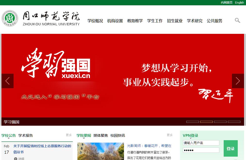 周口師范學院是河南省屬普通本科高校,地處三皇故都、老子故里、歷史文化名城周口市。周口歷史悠久,文化燦爛,人杰地靈,素有“華夏先驅(qū),九州圣跡”之譽。潁河、沙河、賈魯河在此交匯,不盡東流;漯阜鐵路連線京九和隴海線,橫穿周口;寧洛高速、大廣高速等數(shù)條高速在此交匯,是連南貫北、承東啟西的重要交通樞紐。吮千年文化滋養(yǎng),依厚重歷史沉淀,校園花木交蔭,綠圍翠繞,鳥語花香,四季如春,風光旖旎,景色宜人。周口師范學院始建于1973年,歷經(jīng)周口師范學校、周口師范專科學校、周口師范高等??茖W校諸階段,2002年經(jīng)教育部批準升格為本科高等院校。近年來,學校拉大辦學框架,拓寬辦學途徑,豐富辦學內(nèi)涵,提高辦學層次,2013年順利通過教育部本科教學工作合格評估,2014年被確定為“河南省轉(zhuǎn)型發(fā)展試點高?!?,2015年河南省教育廳和周口市人民政府簽署了共同支持周口師范學院轉(zhuǎn)型發(fā)展協(xié)議,學校被確定為河南省首批“示范性應用技術(shù)型本科高?!薄W校占地930453.19平方米,建筑面積577163.07平方米,教學儀器設備總值2.6億元,圖書館藏書160.8103萬余冊,中外文期刊3200余種,建有中國學術(shù)期刊網(wǎng)鏡像站點和5000多種期刊集成化全文數(shù)據(jù)庫;擁有博士后研發(fā)基地1個,擁有省級重點實驗室、省高校重點實驗室培育基地、省高校人文社科研究重點培育基地、省級創(chuàng)新創(chuàng)業(yè)平臺20余個。學校先后被定為河南省首批高?!半p創(chuàng)”基地、河南省首批文化改革發(fā)展人才培養(yǎng)基地、河南省首批非物質(zhì)文化遺產(chǎn)研究基地、河南省教師教育改革創(chuàng)新示范區(qū)和“國培計劃”培訓基地。學?,F(xiàn)有文學院、政法學院、外國語學院、數(shù)學與統(tǒng)計學院、物理與電信工程學院、化學化工學院、生命科學與農(nóng)學學院、計算機科學與技術(shù)學院、教育科學學院、美術(shù)學院、音樂舞蹈學院、體育學院、經(jīng)濟與管理學院、新聞與傳媒學院、機械與電氣工程學院、設計學院、網(wǎng)絡工程學院、軟件學院、繼續(xù)教育學院、馬克思主義學院、公共藝術(shù)與職業(yè)技能教研部21個教學院(部),開設有58個本科專業(yè),涵蓋文學、理學、工學、法學、歷史學、教育學、管理學、經(jīng)濟學、藝術(shù)學等9大學科門類?,F(xiàn)有國家級特色專業(yè)、省級專業(yè)綜合改革試點、省級重點學科,省級教學團隊30余個;省級精品課程、省級優(yōu)秀課程、省級精品資源共享課程19門;省級質(zhì)量工程項目11項,雙學位教育試點專業(yè)8個。建有校內(nèi)實驗室、實訓場所、校外實習基地436個。先后與鄭州大學、常州大學、中國農(nóng)業(yè)科學院研究生院、武漢體育學院、武漢紡織大學、武漢輕工大學、河南科技學院、信陽師范學院聯(lián)合培養(yǎng)碩士研究生。目前,學校普通全日制在校生25440余人,教職工1485人,外籍教師7人,其中教授、副教授等高級專業(yè)技術(shù)人員380人,擁有博士、碩士學位的教師1171人。有河南省教學名師、優(yōu)秀專家、跨世紀學術(shù)和技術(shù)帶頭人、省級骨干教師、省優(yōu)秀教師60余人,聘請省內(nèi)外兼職教授50余人。學校注重加強對外學術(shù)交流與合作,具有招收外國留學生資格,先后與美國、英國、澳大利亞、日本、韓國、臺灣等境外高校建立了校際聯(lián)系,并與其中一些高校開展合作辦學,互派交流生。學校堅持以科研促教學,以教學帶科研,科研成果豐碩。近年來,學校教師主持國家自然科學基金、國家哲學社會科學基金項目等省部級以上科研項目300余項。發(fā)表學術(shù)論文10000余篇,其中中文核心期刊3800余篇;出版專著、教材及工具書490余部;獲河南省高等教育教學成果特等獎1項,一、二等獎10余項。《周口師范學院學報》國內(nèi)外公開發(fā)行,是《中國核心期刊(遴選)數(shù)據(jù)庫》收錄期刊、全國高校優(yōu)秀社科期刊。學校校園文化生活豐富多彩,學生社團活動十分活躍,為學生培養(yǎng)、鍛煉、展現(xiàn)才能提供了廣闊的舞臺。近三年,我校學生參加全國和省級賽事,共獲國家級、省級獎勵2000余項;在2012年、2014年“挑戰(zhàn)杯”全國大學生網(wǎng)絡虛擬運營創(chuàng)業(yè)專項賽決賽中連續(xù)兩次獲全國一等獎;連續(xù)多年在全國機器人大賽、電子設計大賽、建模競賽、軟件工程大賽中獲全國一等獎;連續(xù)七年在河南省教師教育專業(yè)教學技能大賽中榮獲團體一等獎;畢業(yè)生考研率持續(xù)保持在20%左右,考取特崗教師人數(shù)始終位于全省同類高校前列。近年來,學校主動適應經(jīng)濟社會發(fā)展需求,堅持高起點引領(lǐng)、深層次改革、全方位轉(zhuǎn)型,深入推進實施應用型學科專業(yè)結(jié)構(gòu)優(yōu)化、學生創(chuàng)新實踐能力提升、產(chǎn)教融合、“雙師雙能型”師資隊伍建設、創(chuàng)新創(chuàng)業(yè)文化培育五大工程,初步形成了與國家新興戰(zhàn)略產(chǎn)業(yè)和區(qū)域支柱產(chǎn)業(yè)相適應的經(jīng)濟管理類、機械電子類、食品化工類、生物工程類、文化藝術(shù)類和計算機科學類等六大專業(yè)集群;探索實施了“(4-X)+X”、工學交替、項目化教學、“平臺+模塊化”教學、產(chǎn)學研協(xié)同育人、“1