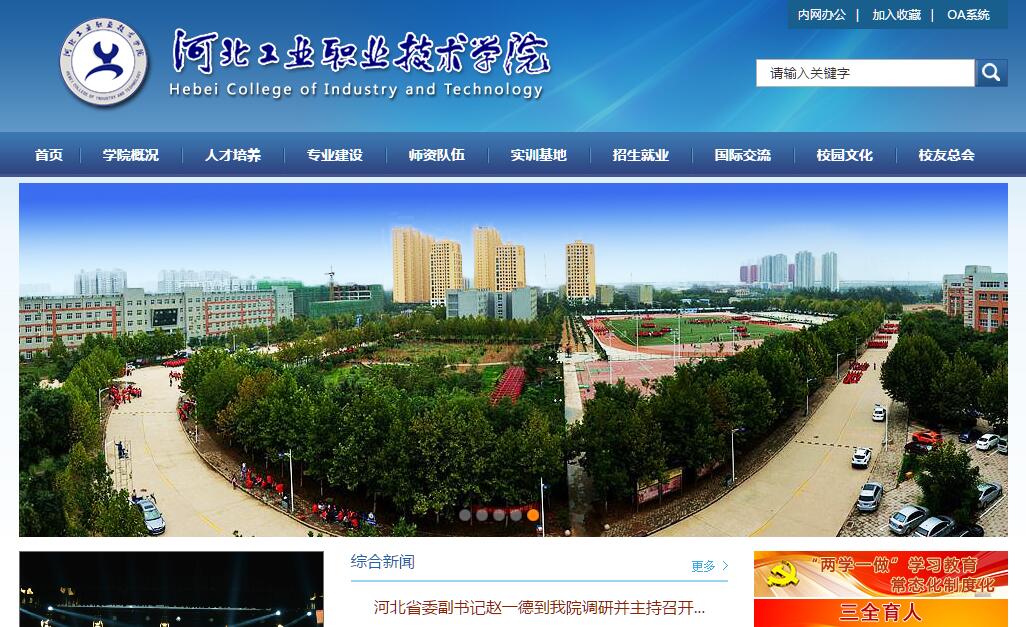 河北工業(yè)職業(yè)技術學院是以鋼鐵冶金為特色的高職院校,是國家100所示范性高職院校之一,是河北省國家優(yōu)質高等職業(yè)院校立項建設單位,是教育部現(xiàn)代學徒制試點單位,全國鋼鐵行業(yè)職業(yè)教育聯(lián)盟理事長單位,河北省鋼鐵焦化職教集團牽頭單位。2014年,學院被教育部評為“全國畢業(yè)生就業(yè)典型經驗高?!保?017年,被教育部評為“全國高校實踐育人創(chuàng)新創(chuàng)業(yè)基地”,2018年,被評為全國第二批“三全育人”綜合改革試點院校、全國“創(chuàng)新創(chuàng)業(yè)典型經驗高?!保辉u為全國高職院校“服務貢獻50強”、“教學資源50強”、“實習管理案例50強”。在2018年中國教育科學研究院發(fā)布的“高職院校滿意度調查結果”中總體滿意度、教育質量等四方面均進入全國前20。學院擁有60年辦學歷史,位于河北省省會石家莊市,隸屬河北省教育廳。現(xiàn)有三個校區(qū),占地1400余畝,建筑面積40余萬平方米,館藏圖書90余萬冊,教職工800多人,全日制在校生1.7萬人,其中,本科專業(yè)實驗班在校生825人。2017年與河北老年大學聯(lián)合辦學,開設老年教育部。目前,學院設有智能制造學院、材料工程系、環(huán)境與化學工程系、汽車工程系、建筑工程系、計算機技術系、經濟貿易系、工商管理系、工業(yè)基礎教學部、基礎課教學部、思想政治與公共體育教學部、成人教育部、老年教育部、應用技術研發(fā)中心、高等職業(yè)教育研究所和國際教育交流中心。學院堅持“立足裝備制造,突出冶金特色,服務區(qū)域,面向全國,接軌國際”的辦學定位,始終把“鐵的紀律,鋼的意志,火的熱情”貫穿人才培養(yǎng)全過程。學院招生形勢持續(xù)向好,生源質量不斷提高,連續(xù)多年錄取分數位居全省前列。招生分數領跑河北同類院校。畢業(yè)生就業(yè)質量高,就業(yè)率連年保持在98%以上。學院與1300多家企業(yè)建立了穩(wěn)定的用人關系,其中行業(yè)內知名企業(yè)400家,2018年,為畢業(yè)生提供就業(yè)崗位40000多個。多家企業(yè)與學院合作參與人才培養(yǎng),設立獎學金、助學金,畢業(yè)生遍及全國各地,學院在鋼鐵行業(yè)更享有“工段長搖籃”的美譽。此外,學院還與400多家大中型企業(yè)共建校外實習基地和專業(yè)建設指導委員會,先后被確定為全國重點建設職業(yè)教育師資培養(yǎng)培訓基地、全國冶金行業(yè)高技能人才培養(yǎng)基地、河北省建設行業(yè)高技能人才培養(yǎng)培訓基地、國家示范性計算機應用與軟件技術專業(yè)職業(yè)教育實訓基地、河北省汽車檢測與維修技術專業(yè)、電工電子與自動化專業(yè)重點建設實訓基地、河北省焦化行業(yè)培訓基地等。2018年學生獲得省級及以上技能競賽獎項84項,其中物聯(lián)網技術應用榮獲2018年全國職業(yè)院校技能大賽一等獎?!疤魬?zhàn)杯”全國大學生課外學術科技作品競賽獲特等獎,是河北省在此項賽事中的重要突破。2018年斬獲“一帶一路暨金磚國家技能發(fā)展與技術創(chuàng)新大賽”一等獎、“2018第二屆金磚國家未來技能挑戰(zhàn)賽”(南非)一等獎,實現(xiàn)國際競賽新突破。五月學社成功躋身全國高校學生百強社團,成為省內唯一一所高職院校入選的百強學生社團。學院根據京津冀及雄安新區(qū)經濟發(fā)展需求,不斷調整專業(yè)設置,著力打造服務鋼鐵冶金的材料類、化工技術類、環(huán)保類特色專業(yè)群,做強現(xiàn)有的黑色金屬材料類、機械設計制造類、自動化類、汽車制造類等第二產業(yè)類專業(yè),擴大電子信息大類、財經商貿大類、公共管理與服務大類等第三產業(yè)類專業(yè)的影響力,適度增加第二產業(yè)類本科層次相關專業(yè),專業(yè)和課程建設水平在國內居領先地位。2018年開設高職招生專業(yè)數66個(含專業(yè)方向),以工科為主,工、管、經協(xié)調發(fā)展,面向全國招生。2011年開始,先后與華北理工大學開展金屬材料工程、冶金工程、化學工程與工藝、機械設計制造及其自動化四個專業(yè)應用型本科工程教育實驗班。學院有國家示范院校重點建設專業(yè)5個,中央財政支持提升專業(yè)服務產業(yè)發(fā)展能力專業(yè)2個,全國機械行業(yè)特色專業(yè)3個,省級示范專業(yè)9個;國家優(yōu)質校重點建設專業(yè)6個,國家骨干專業(yè)6個;現(xiàn)有國家級專業(yè)教學資源庫1個,聯(lián)合主持備選庫1個,省級專業(yè)教學資源庫1個;國家示范課1門,國家精品課程4門,省級精品課程17門;國家精品資源共享課程4門,省級精品資源共享課程2門;省級精品在線開放課程4門,院級精品在線開放課程415門。先后獲國家教學成果二等獎3項,獲河北省教學成果獎一等獎4項、二等獎8項、三等獎10項;河北省科技進步一等獎1項,三等獎3項。河北省社科基金成果獎一等獎1項。獲省部級以上教學成果獎、科技進步獎30余項。完成列入“十二五”職業(yè)教育國家規(guī)劃的教材29部。學院師資隊伍結構合理,實力雄厚?,F(xiàn)有專任教師500余人,教授58人,副高以上職稱257人,博士及碩士237人。有國家級教學團隊2個,省級教學團隊4個;國家教學名師1人,全國優(yōu)秀教師1人,全國高校思想政治教育工作者1人,黃炎培職業(yè)教育“杰出教師”1人,河北省教學名師7人,河北省師德標兵1人。全國冶金教育系統(