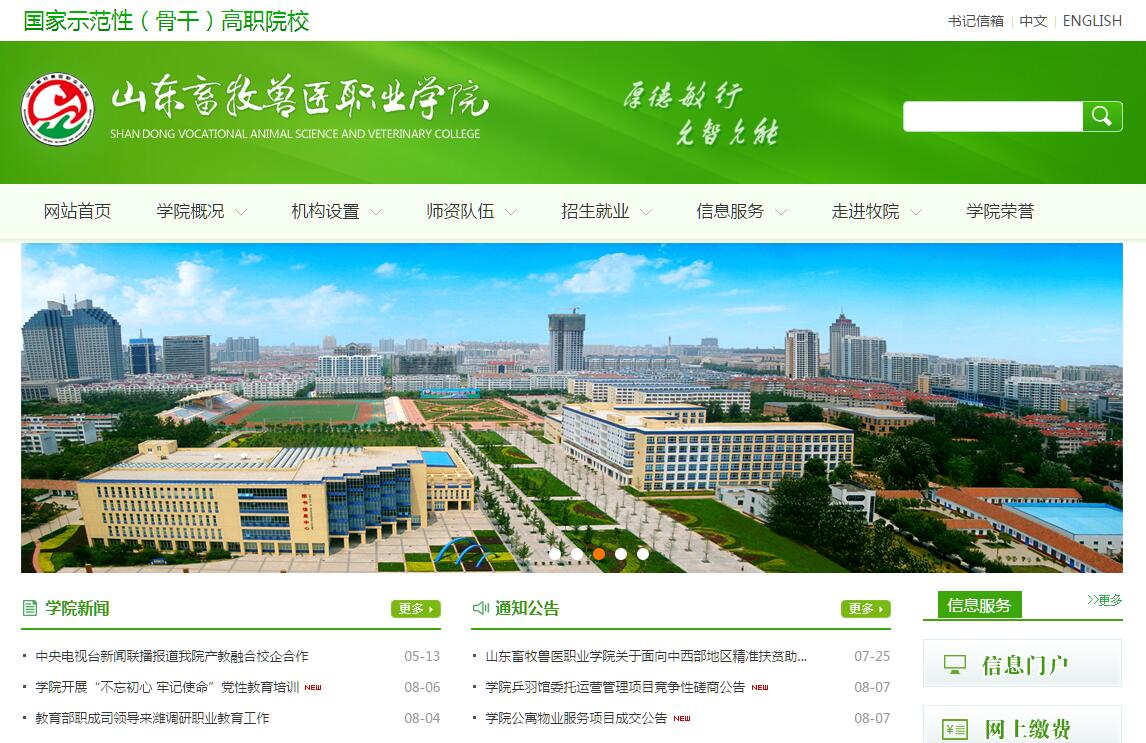 學(xué)院是山東省唯一的國辦畜牧獸醫(yī)類普通高等學(xué)校,1955年建校,為國家骨干高職院校、山東省示范高職院校、第一批山東省優(yōu)質(zhì)高等職業(yè)院校建設(shè)工程立項建設(shè)學(xué)校。全國最大的畜牧獸醫(yī)人才培養(yǎng)基地。學(xué)院座落在美麗的世界風(fēng)箏之都——濰坊市中心,與市委、市政府毗鄰,地理位置優(yōu)越,交通條件便利。占地2800畝,分兩個校區(qū)和兩個獨立設(shè)置的教學(xué)實訓(xùn)區(qū),校園環(huán)境幽雅,人文環(huán)境得天獨厚。面向全國30個省份招生,現(xiàn)有在校生12000余人,留學(xué)生42人,畜牧獸醫(yī)類在校生數(shù)量全國第一,是全國最大的畜牧獸醫(yī)人才培養(yǎng)基地。64年來,在黨和政府、社會各界大力支持下,學(xué)院全面貫徹黨的教育方針,堅持“繼承發(fā)揚、改革創(chuàng)新、科學(xué)發(fā)展、求真務(wù)實”的辦學(xué)理念,秉承“厚德敏行、允智允能”校訓(xùn)和立足山東,面向全國,為現(xiàn)代農(nóng)牧經(jīng)濟發(fā)展提供人才技術(shù)服務(wù),建設(shè)國內(nèi)領(lǐng)先創(chuàng)業(yè)型大學(xué)的辦學(xué)定位,不斷改善辦學(xué)條件,全面加強內(nèi)涵建設(shè),積極深化教育改革,教學(xué)、科研、服務(wù)質(zhì)量和水平顯著提高。建設(shè)創(chuàng)業(yè)型大學(xué)。近年來,學(xué)院堅持“一二三四五”內(nèi)涵發(fā)展思路,實施以普通高職教育為主體,以繼續(xù)教育、校辦產(chǎn)業(yè)為兩翼帶動全局的發(fā)展戰(zhàn)略,夯實師資隊伍、招生就業(yè)、校企合作三個基礎(chǔ),推進國家骨干高職院校項目建設(shè)、教學(xué)質(zhì)量、文化育人、百縣千企萬戶四大工程,強化黨建、思政教育、管理體制機制、人事分配、資金管理五項保障,努力創(chuàng)建辦學(xué)理念先進、育人水平高、服務(wù)能力強、辦學(xué)特色鮮明的優(yōu)秀國家骨干高職院校?!笆濉睍r期,學(xué)院確立了建設(shè)優(yōu)質(zhì)高職院校和國內(nèi)領(lǐng)先創(chuàng)業(yè)型大學(xué)的發(fā)展目標(biāo),著力提升教學(xué)、科研和社會服務(wù)能力,提升校企合作、產(chǎn)教融合檔次,提升現(xiàn)代職業(yè)教育辦學(xué)層次,提升校園文化育人氛圍,提升現(xiàn)代大學(xué)治理水平。師資力量雄厚。擁有教授、副教授120多人,“雙師”素質(zhì)教師比例高。中國科學(xué)院院士、動物生殖學(xué)專家劉以訓(xùn)任學(xué)院名譽院長。國內(nèi)外知名高校和企業(yè)60多位專家、學(xué)者任客座教授。擁有國家級教學(xué)團隊1個,省級教學(xué)團隊9個。有全國高校教學(xué)名師1人,"萬人計劃"教學(xué)名師1人,全國職業(yè)教育先進個人1人,全國優(yōu)秀教師1人,鳶都學(xué)者1人,山東省教學(xué)名師、高職院校教學(xué)名師8人,全省教育先進工作者、優(yōu)秀教師、教學(xué)能手、山東省現(xiàn)代農(nóng)業(yè)產(chǎn)業(yè)技術(shù)體系創(chuàng)新團隊崗位專家、山東高校十大師德標(biāo)兵、全國農(nóng)業(yè)職業(yè)教育教學(xué)名師、山東省高端會計人才、省職業(yè)教育青年技能名師、濰坊市有突出貢獻中青年專家、濰坊市專業(yè)技術(shù)拔尖人才、濰坊市先進工作者等30多人。近3年榮獲國家、省市級獎勵202人次。北京大北農(nóng)集團設(shè)立“獎教金”。專業(yè)特色鮮明。設(shè)有動物科技系、動物醫(yī)學(xué)系、動物營養(yǎng)與水產(chǎn)系、寵物科技系、食品與藥品科技系、經(jīng)濟貿(mào)易系、人文與社會科學(xué)部等六系一部。開設(shè)畜牧獸醫(yī)、動物醫(yī)學(xué)、動物防疫與檢疫、畜牧工程技術(shù)、寵物養(yǎng)護與馴導(dǎo)、野生動物資源保護與利用、飼料與動物營養(yǎng)、水產(chǎn)養(yǎng)殖技術(shù)、食品檢測技術(shù)、食品加工技術(shù)、藥品生物技術(shù)、藥品質(zhì)量與安全、動物藥學(xué)、機電一體化技術(shù)、會計、電子商務(wù)、物流管理、經(jīng)濟信息管理等專業(yè)。專業(yè)設(shè)置科學(xué),行業(yè)特色鮮明。4個專業(yè)舉辦“3+2”專本科貫通培養(yǎng)班。現(xiàn)有國家重點建設(shè)專業(yè)6個、中央財政支持品牌專業(yè)群2個,省級重點建設(shè)專業(yè)2個,有畜牧獸醫(yī)、獸醫(yī)、動物防疫與檢疫、寵物養(yǎng)護與疫病防治、飼料與動物營養(yǎng)、獸藥生產(chǎn)與營銷專業(yè)等8個省級品牌和特色專業(yè)。形成了以畜牧獸醫(yī)為優(yōu)勢、以現(xiàn)代農(nóng)業(yè)為特色、以經(jīng)濟貿(mào)易等為新增長點的專業(yè)結(jié)構(gòu)。建有《動物微生物》《獸醫(yī)臨床診斷學(xué)》《動物病理》《動物藥理與毒理》《動物營養(yǎng)與飼料加工》《動物繁殖》《牛羊病防治》等27門國家級精品課程、國家級精品資源共享課、省級精品課程和省級成人高等教育特色課程。2014年,兩項成果榮獲國家級教學(xué)成果獎二等獎。教學(xué)、實訓(xùn)條件完備、設(shè)施先進。擁有教育技術(shù)中心、計算機網(wǎng)絡(luò)中心、語音室和全塑膠標(biāo)準田徑場等教學(xué)設(shè)施,圖書館館藏圖書近80萬冊;建有各專業(yè)學(xué)科實驗實訓(xùn)室130多個,山東省高等學(xué)校工程技術(shù)研發(fā)中心2個、山東省高等職業(yè)教育名師工作室2個、山東省職業(yè)
