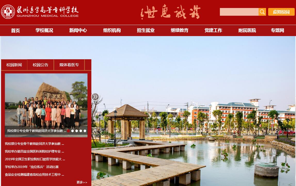 泉州醫(yī)學(xué)高等??茖W(xué)校,坐落于東亞文化之都、著名僑鄉(xiāng)、歷史文化名城泉州市洛陽江畔,是一所全日制公辦的國家示范性(骨干)醫(yī)藥衛(wèi)生類高職院校。在80余年的辦學(xué)歷程中,學(xué)校凝煉了“精誠惠世”的校訓(xùn)精神,確立了“志誠業(yè)精、尚德崇醫(yī)、技以載道、濟(jì)世惠民”的辦學(xué)理念,為社會(huì)培養(yǎng)、輸送了4萬多名大、中專實(shí)用型各類專業(yè)衛(wèi)生技術(shù)人才。學(xué)校創(chuàng)建于1934年,初名惠世高級(jí)護(hù)校。幾經(jīng)更名于1986年改為泉州衛(wèi)生學(xué)校。2004年5月經(jīng)國家教育部批準(zhǔn)升格為泉州醫(yī)學(xué)高等??茖W(xué)校;2008年國家教育部高職高專院校人才培養(yǎng)工作水平評(píng)估獲優(yōu)秀等級(jí);2009年被確定為福建省示范性高等職業(yè)院校;2014年通過國家骨干高職院校項(xiàng)目驗(yàn)收,成為全國第三所、福建省唯一一所國家示范性(骨干)醫(yī)藥衛(wèi)生類高職院校;2015年順利通過高等職業(yè)院校第二輪人才培養(yǎng)工作評(píng)估;2016年加入福建省示范性現(xiàn)代職業(yè)院校建設(shè)被確立為項(xiàng)目培育院校之一。學(xué)校有洛江、清源、北門街等三個(gè)校區(qū),占地面積490.18畝,建筑面積203797.26平方米。校內(nèi)實(shí)訓(xùn)基地總面積58620.11平方米,教學(xué)、科研儀器設(shè)備總值9591.2萬元,館藏圖書總量53.45萬冊。擁有7所附屬醫(yī)院及分布在全省各地的教學(xué)實(shí)習(xí)醫(yī)院、實(shí)習(xí)藥企共217家。現(xiàn)有教職員工512人,專任教師363人,其中副高以上職稱120人,享受國務(wù)院特殊津貼專家1名,省級(jí)高校教學(xué)名師2名,泉州市“桐江學(xué)者”特聘教授1名。“雙師型”教師占專業(yè)教師總數(shù)75.95%。學(xué)校設(shè)有臨床醫(yī)學(xué)院、護(hù)理學(xué)院、藥學(xué)院、檢驗(yàn)預(yù)防學(xué)院、口腔醫(yī)學(xué)院、基礎(chǔ)醫(yī)學(xué)部、社科公共部、繼續(xù)教育學(xué)院、高職發(fā)展研究所、科研信息中心和圖書館等11個(gè)教學(xué)教輔院部、中心、館。專業(yè)設(shè)置有臨床醫(yī)學(xué)、口腔醫(yī)學(xué)、中醫(yī)學(xué)、康復(fù)治療技術(shù)、針灸推拿、醫(yī)學(xué)影像技術(shù)、護(hù)理、助產(chǎn)、藥學(xué)、中藥學(xué)、藥品生產(chǎn)技術(shù)、藥品經(jīng)營與管理、藥品質(zhì)量與安全、公共衛(wèi)生管理、醫(yī)學(xué)檢驗(yàn)技術(shù)、衛(wèi)生檢驗(yàn)與檢疫技術(shù)、預(yù)防醫(yī)學(xué)等17個(gè)專業(yè)。面向全國招生,文理兼收,目前有全日制大專在校生7775人。成人教育設(shè)置臨床醫(yī)學(xué)、中醫(yī)學(xué)、護(hù)理、藥學(xué)、醫(yī)學(xué)檢驗(yàn)技術(shù)、醫(yī)學(xué)影像技術(shù)、公共衛(wèi)生管理、醫(yī)藥營銷、康復(fù)治療技術(shù)、中藥學(xué)等10個(gè)專業(yè),與福建醫(yī)科大學(xué)、福建中醫(yī)藥大學(xué)聯(lián)合舉辦護(hù)理學(xué)、藥學(xué)、中醫(yī)學(xué)、中藥學(xué)、康復(fù)治療學(xué)等5個(gè)專升本專業(yè),在學(xué)函授學(xué)生1652人。學(xué)校堅(jiān)持以質(zhì)量為核心的內(nèi)涵發(fā)展,創(chuàng)新發(fā)展現(xiàn)代高等職業(yè)教育,打造技術(shù)技能人才培養(yǎng)高地。目前擁有1個(gè)教育部、衛(wèi)生部“第一批卓越醫(yī)生教育培養(yǎng)計(jì)劃”試點(diǎn)項(xiàng)目,2個(gè)教育部、財(cái)政部“高等職業(yè)學(xué)校專業(yè)服務(wù)產(chǎn)業(yè)發(fā)展能力”項(xiàng)目,3個(gè)福建省高職教育現(xiàn)代學(xué)徒制、二元制辦學(xué)項(xiàng)目。1個(gè)國家級(jí)教學(xué)團(tuán)隊(duì),2個(gè)省級(jí)優(yōu)秀教學(xué)團(tuán)隊(duì)。1個(gè)全國健康服務(wù)類示范專業(yè),1個(gè)省級(jí)產(chǎn)教融合示范專業(yè)點(diǎn)A類培育項(xiàng)目,2個(gè)省級(jí)服務(wù)產(chǎn)業(yè)特色專業(yè)群,6個(gè)省級(jí)高職精品專業(yè),9個(gè)福建省高等職業(yè)教育示范專業(yè)。13門省級(jí)高職精品課程,3門省級(jí)精品在線開放課程。2個(gè)中央財(cái)政支持國家級(jí)實(shí)訓(xùn)基地,3個(gè)省財(cái)政支持高等職業(yè)教育實(shí)訓(xùn)基地,3個(gè)福建省高等職業(yè)教育生產(chǎn)性實(shí)訓(xùn)基地,1個(gè)省職業(yè)院校專業(yè)群實(shí)訓(xùn)基地A類培育項(xiàng)目。1個(gè)福建省高校應(yīng)用技術(shù)工程中心建設(shè)項(xiàng)目,1個(gè)福建省高職院校應(yīng)用技術(shù)協(xié)同創(chuàng)新中心建設(shè)項(xiàng)目。面向未來,學(xué)校全力推進(jìn)示范性現(xiàn)代職業(yè)院校建設(shè),走內(nèi)涵發(fā)展道路,以務(wù)實(shí)求是的作風(fēng)和敢拼會(huì)贏的精神,努力將泉州醫(yī)學(xué)高等??茖W(xué)校建成海西一流、國家優(yōu)質(zhì)高職醫(yī)學(xué)院校。