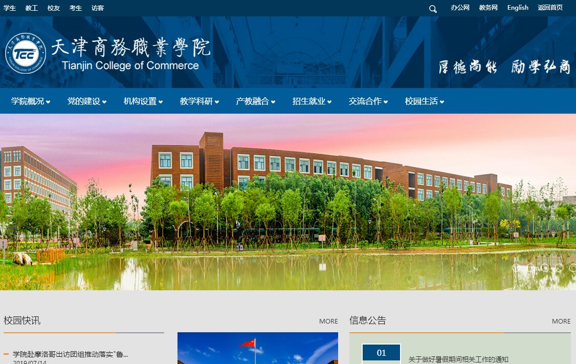 天津商務(wù)職業(yè)學(xué)院是經(jīng)天津市人民政府批準(zhǔn)、國(guó)家教育部備案的全日制普通高等職業(yè)學(xué)校,始建于1955年。建校以來(lái),學(xué)校秉承“厚德尚能,勵(lì)學(xué)弘商”的校訓(xùn),積累了豐富的辦學(xué)經(jīng)驗(yàn),形成了鮮明的辦學(xué)特色,成為一所系統(tǒng)培養(yǎng)現(xiàn)代服務(wù)業(yè)高技能人才的天津市首批高職示范校。迄今為止,已先后為國(guó)家培養(yǎng)了14萬(wàn)余名學(xué)生,很多畢業(yè)生成為企業(yè)骨干,商界精英。學(xué)?,F(xiàn)有海河教育園校區(qū)、河?xùn)|校區(qū)及河西校區(qū)三個(gè)校區(qū),總占地面積50萬(wàn)平方米。學(xué)校設(shè)有6個(gè)二級(jí)學(xué)院和2個(gè)教學(xué)部,分別是國(guó)際貿(mào)易學(xué)院、應(yīng)用外語(yǔ)學(xué)院、營(yíng)銷(xiāo)學(xué)院、會(huì)計(jì)學(xué)院、信息技術(shù)學(xué)院、旅游學(xué)院、體育教學(xué)部、馬列教學(xué)部。在校生8318人,其中全日制高職在校生8139人,成人在校生179人。學(xué)校教職工402人,其中專(zhuān)任教師329人,碩士及以上學(xué)位的教師243人,雙師型教師112人。學(xué)校不斷完善人才培養(yǎng)模式,現(xiàn)有7個(gè)專(zhuān)業(yè)大類(lèi)37個(gè)專(zhuān)業(yè),形成了具有鮮明現(xiàn)代服務(wù)業(yè)特色的專(zhuān)業(yè)體系。學(xué)校建設(shè)了一批國(guó)內(nèi)領(lǐng)先的實(shí)訓(xùn)基地,形成承載多專(zhuān)業(yè)、多崗位、全業(yè)務(wù)流程的綜合實(shí)訓(xùn)平臺(tái),學(xué)生不出校門(mén)就能得到全方位的就業(yè)創(chuàng)業(yè)體驗(yàn)。學(xué)校先后與澳大利亞、英國(guó)、美國(guó)、丹麥、韓國(guó)、烏克蘭、加拿大等十多個(gè)國(guó)家的院校建立了友好合作關(guān)系,定期互派師生開(kāi)展研修交流、教育合作、境外實(shí)習(xí)實(shí)訓(xùn)等活動(dòng)。學(xué)校是全國(guó)第五屆黃炎培職業(yè)教育獎(jiǎng)優(yōu)秀學(xué)校,中國(guó)職業(yè)技術(shù)教育學(xué)會(huì)國(guó)際商務(wù)教育研究會(huì)主任委員校、全國(guó)外經(jīng)貿(mào)行指委副主任委員校、全國(guó)報(bào)關(guān)行指委副主任委員校、教育部職業(yè)院校外語(yǔ)教指委商務(wù)英語(yǔ)分委會(huì)主任委員校、天津商務(wù)行指委主任委員校,海河教育園區(qū)電子商務(wù)行業(yè)產(chǎn)教對(duì)接聯(lián)盟委員會(huì)主席單位。學(xué)校是天津市服務(wù)外包人才培訓(xùn)基地、天津市“一帶一路”建設(shè)境外安全保障基地、濱海新區(qū)緊缺型技能人才培養(yǎng)基地、海河教育園區(qū)大學(xué)生創(chuàng)新創(chuàng)業(yè)商務(wù)服務(wù)基地。學(xué)校以習(xí)近平新時(shí)代中國(guó)特色社會(huì)主義思想為指引,以辦好人民滿(mǎn)意的教育為宗旨,以立德樹(shù)人為根本,不斷深化產(chǎn)教融合和校企合作,努力讓每個(gè)學(xué)生都有人生出彩的機(jī)會(huì)。