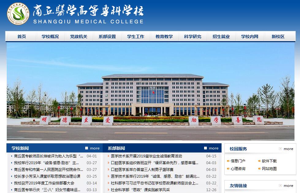 商丘醫(yī)學(xué)高等專科學(xué)校是經(jīng)教育部批準(zhǔn)設(shè)立的公辦全日制普通高等院校,省級(jí)文明單位;河南省“卓越醫(yī)生”培養(yǎng)院校。學(xué)校培養(yǎng)了第33屆南丁格爾獎(jiǎng)獲得者吳靜芳女士和第45屆南丁格爾獎(jiǎng)獲得者宋靜主任,商丘醫(yī)學(xué)高等專科學(xué)校也因此成為全國唯一培養(yǎng)了兩名南丁格爾獎(jiǎng)?wù)芦@得者的醫(yī)學(xué)院校。學(xué)校坐落于中國歷史文化名城、全國優(yōu)秀旅游城---河南省商丘市,毗鄰應(yīng)天公園日月湖景區(qū)。歷史沿革:學(xué)校前身是始建于1921年的“歸德圣保羅醫(yī)院護(hù)士學(xué)?!?,歷經(jīng)“河南省第五護(hù)士學(xué)校”、“商丘地區(qū)衛(wèi)生學(xué)校”等階段,2004年升格為醫(yī)學(xué)高等??茖W(xué)校,是河南省開辦醫(yī)學(xué)專業(yè)最早的學(xué)校之一。學(xué)校新校區(qū)占地面積998畝,建筑面積27.9萬平方米,2018年3月實(shí)現(xiàn)順利整體搬遷并投入使用。基礎(chǔ)設(shè)施建設(shè)實(shí)現(xiàn)了質(zhì)的跨越,極大地拓展了學(xué)校辦學(xué)空間,改善了辦學(xué)條件,為學(xué)校的長遠(yuǎn)發(fā)展奠定了堅(jiān)實(shí)基礎(chǔ)?;厩闆r:學(xué)?,F(xiàn)設(shè)有臨床醫(yī)學(xué)系、護(hù)理系、口腔醫(yī)學(xué)系、醫(yī)學(xué)技術(shù)系和基礎(chǔ)醫(yī)學(xué)部、公共學(xué)科部、社會(huì)科學(xué)部、成人教育部等八個(gè)教學(xué)系(部);開設(shè)臨床醫(yī)學(xué)、口腔醫(yī)學(xué)、護(hù)理、護(hù)理(英語方向)、護(hù)理(日語方向)、護(hù)理(ICU方向)、護(hù)理(康復(fù)及老年護(hù)理方向)、助產(chǎn)、醫(yī)學(xué)檢驗(yàn)技術(shù)、醫(yī)學(xué)影像技術(shù)、口腔醫(yī)學(xué)技術(shù)、康復(fù)治療技術(shù)、衛(wèi)生檢驗(yàn)與檢疫技術(shù)、藥學(xué)、藥品經(jīng)營與管理、醫(yī)學(xué)營養(yǎng)、醫(yī)學(xué)影像技術(shù)(中外合作辦學(xué))、護(hù)理(中外合作辦學(xué))、醫(yī)學(xué)檢驗(yàn)技術(shù)(中外合作辦學(xué))等19個(gè)專業(yè)及專業(yè)方向。面向全國24個(gè)省招生。建有基礎(chǔ)醫(yī)學(xué)、臨床、護(hù)理、醫(yī)用化學(xué)、醫(yī)學(xué)檢驗(yàn)、醫(yī)學(xué)影像、口腔等7個(gè)實(shí)訓(xùn)中心;建有千兆校園網(wǎng)、遠(yuǎn)程教育網(wǎng)站、多媒體教學(xué)評(píng)估系統(tǒng)、圖書自動(dòng)化管理系統(tǒng)、電子閱覽室、計(jì)算機(jī)室等設(shè)施。圖書館藏書84.9088萬冊(cè),中外期刊近千種。學(xué)校在教育部人才培養(yǎng)工作水平評(píng)估中獲得優(yōu)秀格次;在全省普通高等學(xué)校畢業(yè)生就業(yè)工作評(píng)估中獲優(yōu)秀格次。師資隊(duì)伍:學(xué)校擁有結(jié)構(gòu)合理、教學(xué)經(jīng)驗(yàn)豐富的專兼職結(jié)合的師資隊(duì)伍。校本部專兼職教師871人,其中教授、副教授233人。博士生導(dǎo)師1名,博士、碩士學(xué)位142人,9人當(dāng)選省級(jí)學(xué)科研究會(huì)主任和副主任,7人被授予省級(jí)學(xué)術(shù)技術(shù)帶頭人,中青年科技專家8人,此外,學(xué)校還聘請(qǐng)了第三十三屆南丁格爾獎(jiǎng)獲得者吳靜芳主任、美國芝加哥大學(xué)博士生導(dǎo)師王紅衛(wèi)教授、鄭州大學(xué)博士生導(dǎo)師崔留欣教授等國內(nèi)外知名專家、學(xué)者擔(dān)任兼職教授。教學(xué)科研:近年來,我校教師發(fā)表論文1507篇,被SCI、EI、ISTP收錄論文61篇,參編教育部,衛(wèi)生部規(guī)劃教材593部,其中主編117部。承擔(dān)市廳級(jí)以上科研項(xiàng)目452項(xiàng),其中國家自然科學(xué)基金項(xiàng)目4項(xiàng);獲市廳級(jí)以上科研成果獎(jiǎng)434項(xiàng),其中獲中華醫(yī)學(xué)科技進(jìn)步二等獎(jiǎng)1項(xiàng),中華預(yù)防醫(yī)學(xué)會(huì)科技進(jìn)步三等獎(jiǎng)1項(xiàng),河南省科技進(jìn)步一等獎(jiǎng)1項(xiàng)、二等獎(jiǎng)4項(xiàng)、三等獎(jiǎng)3項(xiàng);國家專利25項(xiàng)。質(zhì)量工程建設(shè):學(xué)校堅(jiān)持特色制勝、爭創(chuàng)一流,形成一批優(yōu)勢和特色專業(yè)。護(hù)理專業(yè)實(shí)訓(xùn)基地是中央財(cái)政支持的職業(yè)教育實(shí)訓(xùn)基地;臨床醫(yī)學(xué)、醫(yī)學(xué)檢驗(yàn)技術(shù)專業(yè)評(píng)為中央財(cái)政支持的高等職業(yè)學(xué)校重點(diǎn)建設(shè)專業(yè);臨床醫(yī)學(xué)、醫(yī)學(xué)檢驗(yàn)專業(yè)實(shí)訓(xùn)基地是省級(jí)示范性實(shí)訓(xùn)基地;臨床醫(yī)學(xué)、護(hù)理、口腔醫(yī)學(xué)、醫(yī)學(xué)檢驗(yàn)技術(shù)、醫(yī)學(xué)影像技術(shù)等專業(yè)為省級(jí)特色建設(shè)專業(yè);藥理學(xué)教學(xué)團(tuán)隊(duì)是省級(jí)優(yōu)秀教學(xué)團(tuán)隊(duì);外科學(xué)課程被教育部臨床醫(yī)學(xué)類專業(yè)教學(xué)指導(dǎo)委員會(huì)評(píng)為國家級(jí)精品課程;醫(yī)學(xué)影像檢查技術(shù)、急救護(hù)理技術(shù)、藥理學(xué)、全口義齒工藝技術(shù)課程被評(píng)為省級(jí)精品課程。學(xué)校始終堅(jiān)持黨的教育方針和衛(wèi)生工作方針,秉承“明德、至愛、勵(lì)學(xué)、善思”的辦學(xué)歷史傳統(tǒng),堅(jiān)持面向基層、服務(wù)社會(huì)的辦學(xué)服務(wù)方向,堅(jiān)持