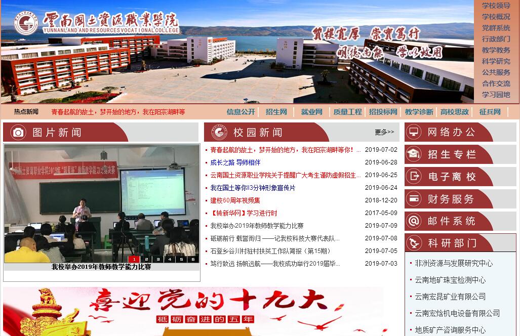 云南國土資源職業(yè)學院是一所獨立設(shè)置的國有公辦高等職業(yè)學院,是云南省首批成立的2所全日制高職院校之一,也是首批重點建設(shè)的2所“省級示范性高等職業(yè)院?!敝?。學校行政關(guān)系隸屬于云南省地質(zhì)礦產(chǎn)勘查開發(fā)局(簡稱地礦局),教育教學業(yè)務(wù)由教育廳主管,國土廳給予一些項目上的支持,財政經(jīng)費由財政廳直撥。學?,F(xiàn)有陽宗海、經(jīng)開區(qū)、小板橋、武定四個校區(qū),占地面積共725528.34平米陽宗海主校區(qū)一、二期建設(shè)全面完工,三期建設(shè)即將啟動;學校資產(chǎn)總額達64553萬元;教學儀器設(shè)備總值達4671萬元;校舍建筑面積達到 269507平方米。學院現(xiàn)有教學用計算機2007臺,多媒體教室122間,實訓(xùn)室207個,建有37個校內(nèi)實訓(xùn)基地,170個校外實訓(xùn)基地;數(shù)字化校校園建設(shè)加快,學校內(nèi)外網(wǎng)絡(luò)、校園一卡通、安防監(jiān)控、中心機房、多媒體教室、校園公共廣播、網(wǎng)絡(luò)安全建設(shè)、數(shù)字化校園應(yīng)用系統(tǒng)建設(shè)等全面展開;成功進入國家“教育信息化建設(shè)試點院?!泵麊?;學校圖書館館藏紙質(zhì)圖書47.08萬冊、電子圖書20萬冊,加入“云南省高校圖書館聯(lián)盟”購置了“萬方學術(shù)服務(wù)平臺”,有效增加數(shù)字資源容量;學校財政撥款逐年增加,籌資融資有所突破,先后獲得國內(nèi)商業(yè)銀行貸款3.5億元,獲得世界銀行支持云南職業(yè)教育發(fā)展項目支持,國外貸款額度為940萬美元,可使用資金總額接近7000萬元人民幣;學校同時獲得德國促進性貸款項目支持,國外貸款額度為2000萬歐元,可使用資金總額達2億元人民幣。這些資金和項目,確保了新校區(qū)建設(shè)的開展,也有力地改善了學校辦學條件?,F(xiàn)有13個教學院,開設(shè)有44個專業(yè),全日制在校首次突破萬人大關(guān),學生總?cè)藬?shù)達10513人,招收首批聯(lián)合培養(yǎng)本科生183人、老撾留學生82人,成人教育學生規(guī)模達到3630人。學校起源于1958年成立的云南省地質(zhì)廳技工學校,2001年4月,在云南省地質(zhì)礦產(chǎn)局技工學校和云南省地質(zhì)礦產(chǎn)局職工大學基礎(chǔ)上合并改制而來。50多年來,學校共培養(yǎng)了3萬多名地質(zhì)類專業(yè)人才,遍布全國20余?。ㄊ小^(qū))、全省129個縣(市、區(qū))國土部門、地礦行業(yè),成為學校的驕傲。經(jīng)過五十多年的教化育人、風雨傳薪,云南國土資源職業(yè)學院形成了較為鮮明的產(chǎn)業(yè)特色、行業(yè)特色、專業(yè)特色、培養(yǎng)特色、“產(chǎn)品”特色和文化特色,學?,F(xiàn)已成為西部地區(qū)國土資源類高素質(zhì)技能型人才主要培養(yǎng)基地。學校是全國百所職業(yè)院校推進實施職業(yè)資格證書制度試點單位,先后獲得了“云南地質(zhì)工作先進單位”、“省級文明單位”、“省級文明學校”、云南省地礦局“五好班子”、云南省教育廳“高校執(zhí)行黨風廉政建設(shè)責任制先進單位”以及“昆明市園林單位”等多項榮譽稱號。2005年以“良好”等級通過教育部高職高專人才培養(yǎng)水平評估,2012年年底順利通過云南省教育廳的特色評估,獲“特色通過”;自2004年以來連續(xù)12年被云南省教育廳評為高校就業(yè)工作先進單位,2012年被云南省教育廳評為“2012—2013年度全省就業(yè)總結(jié)宣傳工作典型經(jīng)驗高校”;2011年11月,學校承辦全國一類賽事“第一屆全國地勘鉆探職業(yè)技能大賽”固體鉆探工比賽及閉幕式,獲“特別貢獻獎”和“全國地勘鉆探技能人才培育突出貢獻獎”;2014年獲“國家技能人才培育突出貢獻獎”。2015年,學校被教育部列為首批現(xiàn)代學徒制試點單位。
