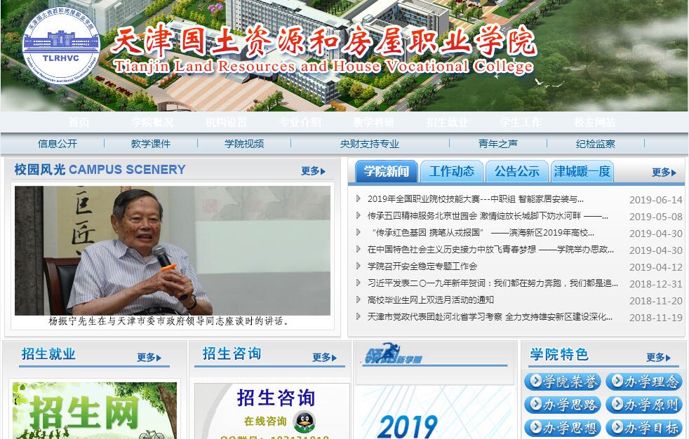 天津國(guó)土資源和房屋職業(yè)學(xué)院是一所經(jīng)天津市人民政府批準(zhǔn)、國(guó)家教育部備案,由天津市住房和城鄉(xiāng)建設(shè)委員會(huì)舉辦的公辦全日制普通高等職業(yè)院校,是全國(guó)房地產(chǎn)行業(yè)培訓(xùn)中心、國(guó)土資源部干部教育培訓(xùn)中心天津基地、天津?yàn)I海新區(qū)干部培訓(xùn)基地、天津全行濱海會(huì)議中心、天津市奧林匹克教育示范校和首批大學(xué)生就業(yè)服務(wù)工作站,為全國(guó)建設(shè)類一級(jí)資質(zhì)培訓(xùn)機(jī)構(gòu),并被評(píng)為“中國(guó)驕傲?第8屆中國(guó)時(shí)代十大誠(chéng)信示范單位”。學(xué)院建有教學(xué)樓、會(huì)議中心、文體館、圖書館、報(bào)告廳、大禮堂、食堂和學(xué)生公寓;其中“建筑技術(shù)綜合實(shí)訓(xùn)基地”為天津市重點(diǎn)建設(shè)實(shí)訓(xùn)基地項(xiàng)目,包括仿真的“樓宇智能化實(shí)訓(xùn)室”及“建筑設(shè)備綜合實(shí)訓(xùn)室”,并建有固定的校外實(shí)訓(xùn)基地。校園網(wǎng)絡(luò)系統(tǒng)覆蓋了各辦公部門、圖書館及實(shí)驗(yàn)、實(shí)訓(xùn)室等。學(xué)院內(nèi)實(shí)訓(xùn)基地“天津全行濱海會(huì)議中心”,是按照星級(jí)標(biāo)準(zhǔn)建設(shè)的集實(shí)訓(xùn)、住宿、餐飲、會(huì)議培訓(xùn)、休閑健身于一體的現(xiàn)代化會(huì)議型酒店,為黨政機(jī)關(guān)出差和會(huì)議定點(diǎn)飯店,內(nèi)設(shè)大中小型會(huì)議室、多功能廳、客房及宴會(huì)廳;文體館配有8×50m國(guó)際標(biāo)準(zhǔn)室內(nèi)溫泉游泳館及籃球館、網(wǎng)球館、乒乓球館等,功能齊全,設(shè)施先進(jìn),可舉辦各種培訓(xùn)及國(guó)內(nèi)外會(huì)議活動(dòng)。學(xué)院師資力量雄厚,擁有一支以“雙師型”教師為主體、資深教授為核心、行業(yè)管理者及知名專家為骨干的專兼職相結(jié)合的教師隊(duì)伍。設(shè)有建筑工程系、房地產(chǎn)經(jīng)濟(jì)管理系、建筑設(shè)備工程系、建筑藝術(shù)系、工商管理系、國(guó)際經(jīng)濟(jì)貿(mào)易系、基礎(chǔ)課部、思想政治理論課教學(xué)部和體育教學(xué)部等教學(xué)實(shí)體。開辦國(guó)土資源、城市建筑、房地產(chǎn)、藝術(shù)設(shè)計(jì)、經(jīng)濟(jì)、管理類等28個(gè)專業(yè)及方向,面向全國(guó)招生,在校生7800余人。學(xué)院具有長(zhǎng)期依托行業(yè)開展職業(yè)教育的辦學(xué)歷史,堅(jiān)持“以服務(wù)為宗旨,以促進(jìn)就業(yè)為導(dǎo)向,以質(zhì)量求生存,以特色求發(fā)展”的辦學(xué)方針,按照“以改革創(chuàng)新促發(fā)展,以內(nèi)涵建設(shè)求生存,以特色教育創(chuàng)品牌”的發(fā)展思路和“適應(yīng)社會(huì)需求,置身時(shí)代發(fā)展,發(fā)揮行業(yè)優(yōu)勢(shì),成為國(guó)土房管行業(yè)和濱海新區(qū)高技能人才培養(yǎng)基地”辦學(xué)定位,秉承“德能兼?zhèn)?、師從百工”的校?xùn),努力形成“學(xué)歷教育與職業(yè)培訓(xùn)并重,專兼教師結(jié)合,培養(yǎng)具有綜合素質(zhì)高、職業(yè)能力強(qiáng)的人才”的辦學(xué)特色,在全國(guó)及天津市首創(chuàng)或率先開辦“房地產(chǎn)經(jīng)濟(jì)與管理”、“房地產(chǎn)開發(fā)”、“物業(yè)管理”、“國(guó)土資源管理”等專業(yè)。40余年來,先后輸送大、中專學(xué)歷教育畢業(yè)生數(shù)萬人,面向全國(guó)30個(gè)省、自治區(qū)、直轄市的300多個(gè)城市開展各級(jí)各類培訓(xùn)近20萬人次,一大批優(yōu)秀人才走上了各級(jí)領(lǐng)導(dǎo)和管理崗位,創(chuàng)出了一條“依法治校、質(zhì)量立校、服務(wù)強(qiáng)校、管理興?!钡奶厣r明的高職教育科學(xué)發(fā)展之路。