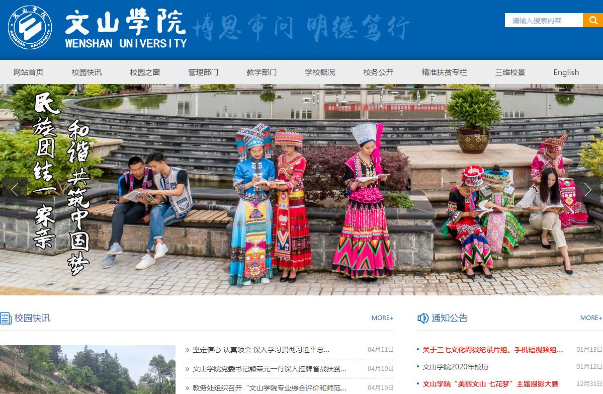 文山學(xué)院位于祖國西南邊陲的文山壯族苗族自治州,辦學(xué)歷史可追溯到1947年由云南昭通南遷至文山的國立西南師范學(xué)校。1955年經(jīng)云南省人民政府批準(zhǔn),在國立西南師范學(xué)?;A(chǔ)上成立云南文山師范學(xué)校。1958年在文山師范學(xué)校內(nèi)開辦文山人民大學(xué),招收師專和醫(yī)專各一個(gè)班。1977年經(jīng)云南省教育廳批準(zhǔn),在文山師范學(xué)校附設(shè)師專班。1984年云南省人民政府批準(zhǔn)成立文山師范??茖W(xué)校,全國人大常委會(huì)原副委員長楚圖南先生為學(xué)校題寫校名。1992年更名為文山師范高等??茖W(xué)校,2009年教育部批準(zhǔn)升格為全日制普通本科院校。文山州是“老、少、邊、山、窮、戰(zhàn)”地區(qū),南與越南社會(huì)主義共和國接壤,邊境線長438公里,是建國后經(jīng)歷戰(zhàn)爭時(shí)間最長的民族自治地區(qū)。20世紀(jì)30年代,鄧小平等老一輩無產(chǎn)階級(jí)革命家在這里創(chuàng)建紅色革命根據(jù)地,文山州8個(gè)縣(市)均屬革命老區(qū)。20世紀(jì)50年代援越抗法、60年代援越抗美、70年代末至90年代初對(duì)越自衛(wèi)還擊和“兩山”防御作戰(zhàn),文山州長期處在支前參戰(zhàn)的前沿,改革開放比全國整整晚了14年,全州8縣(市)均屬國家級(jí)貧困縣。學(xué)校立足“老、少、邊、山、窮、戰(zhàn)”地區(qū)辦學(xué),努力踐行和弘揚(yáng)“艱苦奮斗、無私奉獻(xiàn)”的老山精神和“等不是辦法、干才有希望”的西疇精神,為邊疆少數(shù)民族地區(qū)培養(yǎng)了一大批基礎(chǔ)教育師資和基層工作人才,走出了一條艱苦創(chuàng)業(yè)的發(fā)展之路。尤其是2009年升本以來,學(xué)校依據(jù)自身特點(diǎn)和發(fā)展目標(biāo),轉(zhuǎn)變思想觀念,加快硬件建設(shè),規(guī)范教學(xué)管理,提升人才培養(yǎng)質(zhì)量,努力促進(jìn)??平逃虮究平逃煼督逃蚓C合教育的“兩個(gè)轉(zhuǎn)變”,學(xué)校各項(xiàng)事業(yè)得到了較快發(fā)展。目前,學(xué)校占地面積877.25畝,校舍面積25.76萬平方米;圖書館紙質(zhì)藏書74.17萬冊(cè),電子圖書118.87萬冊(cè);教學(xué)科研儀器設(shè)備總值6458.93萬元;固定資產(chǎn)總值4.12億元。學(xué)?,F(xiàn)有教職工593人,副高級(jí)及以上職稱教師158人(其中正高級(jí)職稱教師31人),擁有碩士及以上學(xué)位教師338人?,F(xiàn)有云南省突出貢獻(xiàn)專家3人,享受省政府特殊津貼專家2人,云南省教學(xué)名師3人,云南省技術(shù)創(chuàng)新人才5人,云嶺產(chǎn)業(yè)技術(shù)領(lǐng)軍人才1人,云南省高校卓越青年教師特殊培養(yǎng)項(xiàng)目對(duì)象3人。學(xué)校設(shè)有11個(gè)教學(xué)部門,48個(gè)本??茖I(yè)(本科專業(yè)36個(gè),??茖I(yè)12個(gè)),涵蓋理學(xué)、工學(xué)、農(nóng)學(xué)、文學(xué)、教育學(xué)、藝術(shù)學(xué)、歷史學(xué)、法學(xué)、管理學(xué)9個(gè)學(xué)科門類?,F(xiàn)有省級(jí)教學(xué)團(tuán)隊(duì)2個(gè)、科技創(chuàng)新團(tuán)隊(duì)2個(gè),云南省高校本科專業(yè)綜合改革試點(diǎn)項(xiàng)目1個(gè),云南省優(yōu)勢特色重點(diǎn)學(xué)科1個(gè),云南省一流學(xué)科(B類高原學(xué)科)1個(gè)。學(xué)校設(shè)有文山三七研究院、文山州生物資源開發(fā)研究中心、文山民族文化傳承與創(chuàng)新研究中心3個(gè)學(xué)術(shù)科研機(jī)構(gòu),建有云南省三七工程技術(shù)研究中心、云南省三七農(nóng)業(yè)工程實(shí)驗(yàn)室、云南省高校特色植物資源開發(fā)利用工程研究中心、云南省高校三七應(yīng)用技術(shù)研究重點(diǎn)實(shí)驗(yàn)室4個(gè)省級(jí)科研平臺(tái)。綜合性學(xué)術(shù)期刊《文山學(xué)院學(xué)報(bào)》面向國內(nèi)外公開發(fā)行,系中國學(xué)術(shù)期刊綜合評(píng)價(jià)數(shù)據(jù)庫(CAJCED)統(tǒng)計(jì)源期刊。升本以來,學(xué)校教師獲各級(jí)各類課題立項(xiàng)304項(xiàng)(其中國家級(jí)7項(xiàng)、省部級(jí)28項(xiàng)),出版學(xué)術(shù)專著32部(其中個(gè)人專著25部、合著7部),主編、參編教材45部,獲國家專利授權(quán)15項(xiàng),獲省部級(jí)科研獎(jiǎng)5項(xiàng)、地廳級(jí)科研獎(jiǎng)26項(xiàng),發(fā)表學(xué)術(shù)論文2870篇,其中核心期刊243篇,SCI、EI、CPCI等收錄59篇。學(xué)?,F(xiàn)有云南省支撐產(chǎn)業(yè)升級(jí)專業(yè)群建設(shè)項(xiàng)目1個(gè)、高等院校提升專業(yè)服務(wù)產(chǎn)業(yè)能力建設(shè)項(xiàng)目1個(gè)、應(yīng)用技術(shù)型高校實(shí)驗(yàn)實(shí)習(xí)實(shí)訓(xùn)基地與技術(shù)創(chuàng)新服務(wù)中心2個(gè)、實(shí)踐育人創(chuàng)新創(chuàng)業(yè)中心1個(gè)、本科高校創(chuàng)新創(chuàng)業(yè)教育改革試點(diǎn)學(xué)院建設(shè)項(xiàng)目1個(gè)、校園創(chuàng)業(yè)平臺(tái)1個(gè)。學(xué)校面向全國22個(gè)?。ㄗ灾螀^(qū)、直轄市)招生,現(xiàn)有全日制本??茖W(xué)生9256人(本科生6868人、??粕?292人、本科預(yù)科生96人)。辦學(xué)以來,已向社會(huì)輸送30000余名全日制本專科畢業(yè)生和10000余名成人本??茖W(xué)生,培訓(xùn)各級(jí)各類學(xué)員40000余人次,為邊疆民族地區(qū)的經(jīng)濟(jì)發(fā)展、社會(huì)進(jìn)步作出了積極貢獻(xiàn)。學(xué)校積極開展國