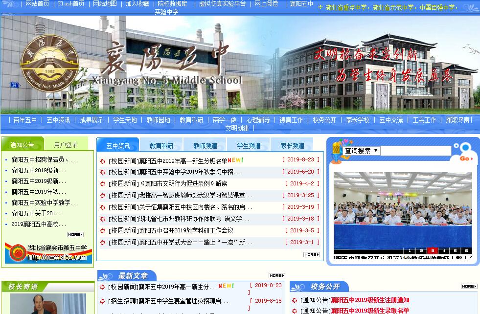 襄陽市第五中學(xué)始建于1902年,名為襄陽府中學(xué)堂,其前身為鹿門書院。從中學(xué)堂起,歷經(jīng)湖北省立十中、省立第五中學(xué)、省立第五高級中學(xué)、省立襄陽中學(xué)、襄樊市第五中學(xué)、襄陽市第五中學(xué)等階段。1953年列入湖北省首批5所重點(diǎn)中學(xué)。2001年被省政府教育督導(dǎo)室、省教育廳命名為湖北省示范高中。建校114年來,一直被譽(yù)為“鄂西北人才的搖籃”。早期共產(chǎn)黨人肖楚女、謝遠(yuǎn)定曾在這里任教并播撒革命的火種;一代又一代五中人在這里辛勤耕耘,6萬多名學(xué)子成才報國,中華人民共和國最高人民檢察院原檢察長黃火青,武漢大學(xué)原校長、著名教育家劉道玉,打破百年物理定律的美國麻省理工學(xué)院機(jī)械工程系首位華裔掌門人、美國工程院院士陳剛,中南大學(xué)博士生導(dǎo)師、中國工程院院士桂衛(wèi)華……均從這里走向全國,走向世界。學(xué)校圖書館藏書130,000余冊,有32個理、化、生國家標(biāo)準(zhǔn)實(shí)驗室,108個多媒體教室、8個網(wǎng)絡(luò)教室、1個電子閱覽室、1個錄播教室和4個通用技術(shù)教室,建立了校園網(wǎng)、電視臺、廣播站,設(shè)有形體訓(xùn)練房、力量訓(xùn)練房、美術(shù)畫室、科技小制作室、書畫室、棋社、藝術(shù)館、狀元橋文學(xué)社等活動室。館、室、場齊全,內(nèi)部裝備配套,能充分滿足教學(xué)和第二課堂需要。學(xué)?,F(xiàn)有93個教學(xué)班,在校學(xué)生人數(shù)6000余人;在崗職工388人,其中專任教師344人。市級以上優(yōu)秀教師、學(xué)科帶頭人、骨干教師140余名,優(yōu)秀奧林匹克教練40多人,具有研究生學(xué)歷的教師100多人,先后涌現(xiàn)出享受國務(wù)院和省政府津貼的專家6人,省特級教師27名,湖北名師3名,全國勞模2名,省勞模3名,高級以上職稱158人;7名青年教師獲優(yōu)質(zhì)課國家一等獎,53名青年教師在優(yōu)質(zhì)課比賽等活動中獲湖北省一等獎,一大批青年教師獲得市優(yōu)質(zhì)課一等獎;近年來,五中教師在省級以上核心刊物公開發(fā)表論文近400篇,“十二五”、“十三五”期間省級、國家級立項課題達(dá)20多項。襄陽五中的辦學(xué)理念是“為學(xué)生的終身發(fā)展奠基”----通過轉(zhuǎn)變育人觀念、完善學(xué)生評價標(biāo)準(zhǔn)、提升教職工素質(zhì)、創(chuàng)新課堂教學(xué)模式、營造育人氛圍、革新教學(xué)手段等途徑,培養(yǎng)品德高尚、全面發(fā)展、樂于實(shí)踐、善于創(chuàng)新的高素質(zhì)人才,讓每個學(xué)生都能在快樂中學(xué)習(xí),在學(xué)習(xí)中成長,為學(xué)生的終身可持續(xù)發(fā)展奠定堅實(shí)的基礎(chǔ)。為了學(xué)生的終身發(fā)展,襄陽五中注重秉承百年歷史,不斷豐富系列文化,凸顯辦學(xué)特色。----治校方略:實(shí)施文化引領(lǐng),構(gòu)建和諧教育。----校 訓(xùn):文明 振奮 求實(shí) 創(chuàng)新。----學(xué) 風(fēng):崇尚禮儀、崇尚科學(xué)、崇尚創(chuàng)造、崇尚一流。----教 風(fēng):敬業(yè)愛生 拼搏奉獻(xiàn)。----辦學(xué)目標(biāo):把襄陽五中建設(shè)成先進(jìn)教育理念的實(shí)驗園、先進(jìn)教學(xué)技術(shù)的示范園、先進(jìn)人才的百花園,推動學(xué)校從優(yōu)秀到卓越的跨越,實(shí)現(xiàn)“百年五中,中華名?!钡膽?zhàn)略目標(biāo)。----學(xué)生文化:營造“三高文化”(即高境界地做人,高效率地學(xué)習(xí),高品位地生活),培育“四種品質(zhì)”(即“忠、雅、誠、健”)。----校園特色:古樸典雅,布局合理。高起點(diǎn)規(guī)劃、高標(biāo)準(zhǔn)建設(shè)、高要求配置;整體風(fēng)格彰顯出高中學(xué)校之大氣、地域文化之大風(fēng)、襄陽教育之大成。是教書育人的“世外桃源”、讀書成才的絕妙佳境。在“為學(xué)生終身發(fā)展奠基”辦學(xué)理念和“實(shí)施文化引領(lǐng), 追求和諧教育”的治校方略指引下,在教育、教學(xué)及管理等方面不斷創(chuàng)造新的輝煌。截止2016年3月先后共有132人在全國數(shù)、理、化、生、信息學(xué)奧林匹克競賽中獲全國一等獎(占全大市獲全國一等獎的學(xué)生總數(shù)的近70%),成為全省奧賽名校。2002—2015年14年(五中新的百年征程)中,五中培養(yǎng)出24名省市狀元,為清華、北大輸送了270多名高素質(zhì)人才,占全襄陽市本階段上清華、北大總數(shù)的近70%。學(xué)校遷建后取得“五年八狀元,新校五連勝”的成果:2011--2015年新校區(qū)5屆高考,摘取5個省狀元,3個市狀元(包括4個理科狀元、4個文科狀元);2013、2015年兩次包攬全省文理科狀元(此外,還奪取2013年省理科第二名,2014年省文科第二名,2015年省文科第二名和理科第三名),創(chuàng)湖北省高考?xì)v史紀(jì)錄;北大清華實(shí)際錄取人數(shù)分別為15人、22人、36人、22人、22人,均為全市第一,全省前三(近幾年香港院校、飛行員錄取人數(shù)也均居全省前列);重點(diǎn)大學(xué)上線人數(shù)分別為1027人、1093人、1290人、1467人、1559人(均為全省第一),續(xù)寫了連續(xù)14年高考“全市第一”的輝煌。學(xué)校多次榮獲全市高中教學(xué)質(zhì)量綜合評估最高獎項一等獎的第一名、全市高考特殊貢獻(xiàn)獎和市政府即時記功獎,連續(xù)三次以高質(zhì)量的辦學(xué)水平入選“中國百強(qiáng)中學(x