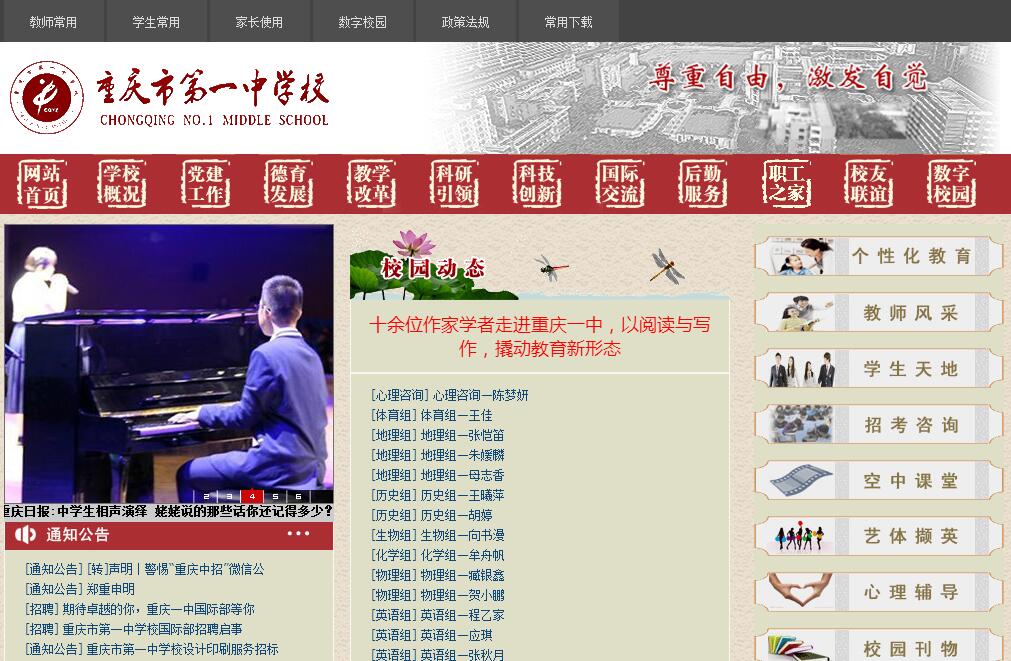 重慶市第一中學(xué)校建校于1931年,是重慶市教委首批重點中學(xué),位于重慶市沙坪壩區(qū)沙南街2號。自1997年重慶直轄以來,學(xué)校榮獲全國示范性中學(xué)、全國語言文字工作先進(jìn)集體、全國藝術(shù)教育工作先進(jìn)集體、全國體育衛(wèi)生工作先進(jìn)集體、全國現(xiàn)代教育實驗學(xué)校、全國學(xué)校對口支援工作先進(jìn)單位、全國模范職工之家、全國精神文明建設(shè)先進(jìn)集體、全國后勤管理先進(jìn)單位、全國教育系統(tǒng)先進(jìn)集體、中國百強中學(xué)、全國百強特色校、全國特色教學(xué)示范中學(xué)、首批全國中小學(xué)中華優(yōu)秀文化藝術(shù)傳承學(xué)校、全國百佳藝術(shù)教育單位、重慶市文明單位、重慶市十佳園林單位、重慶依法治校示范學(xué)校、重慶市德育示范學(xué)校、“書香重慶·和諧教育”示范學(xué)校、重慶市引進(jìn)國外智力示范單位、影響重慶教育十大品牌中學(xué)、新中國成立60年重慶教育功勛著名中學(xué)等榮譽稱號。學(xué)校有校本部以及參與舉辦或幫扶合作的重慶一中寄宿學(xué)校(初中渝北校區(qū)、高中大學(xué)城校區(qū))、重慶皇冠實驗中學(xué)、重慶史迪威外語學(xué)校、重慶第一雙語學(xué)校等民辦學(xué)校。共有231個教學(xué)班,在校學(xué)生12759人,在冊在編教職工647人。校本部為公辦學(xué)校,占地面積440000m2,校舍建筑總面積302707m2,圖書館藏書近22萬冊,教學(xué)用計算機1000余臺。有6幢教學(xué)樓,184間教室,1個教職工食堂和2個可供1500人同時就餐的學(xué)生食堂。校內(nèi)有設(shè)施一流的室內(nèi)外籃球場、排球場、羽毛球場,有標(biāo)準(zhǔn)田徑運動場、體育館、游泳池和可容納1200人的大禮堂。在84年的辦學(xué)歷程中,學(xué)校形成了“明禮崇德、求知求真”的校訓(xùn)、“愛國愛校、尊師愛生,樸實勤奮,改革創(chuàng)新”的校風(fēng)、“崇德、敬業(yè)、博學(xué)、嚴(yán)謹(jǐn)”的教風(fēng)、“勵志、篤學(xué)、樂群、力行”的學(xué)風(fēng)、“學(xué)校的一切為學(xué)生的發(fā)展而存在”的辦學(xué)理念和“讓每一個學(xué)生發(fā)展得更好”的辦學(xué)思想。學(xué)校名師薈萃,現(xiàn)有享受國務(wù)院政府津貼專家3人,四川省有突出貢獻(xiàn)的中青年專家1人,重慶市名師3人、學(xué)科名師4人,重慶市學(xué)術(shù)帶頭人1人、學(xué)科帶頭人2人,重慶市優(yōu)秀專業(yè)技術(shù)人才2人,高校碩士生導(dǎo)師、兼職教授4人,中學(xué)研究員21人,特級教師18人,高級教師279人,碩士以上學(xué)歷教師95人,市級骨干教師43人,外籍教師13人。有80%的教師接受過研究生碩士課程培訓(xùn)。有27名中青年教師被選派到美國、英國、日本、加拿大等國留學(xué)進(jìn)修。有168名教職員工分別獲得全國、省市勞動模范和先進(jìn)個人榮譽稱號。教師在市級以上刊物發(fā)表文章上萬篇,獲獎上千個,出版著述上百本。學(xué)校全面實施素質(zhì)教育,形成了鮮明的辦學(xué)特色:以紅巖精神和“四·二一”精神為主線的革命傳統(tǒng)德育;以數(shù)理化生信息學(xué)等國家奧賽為主要內(nèi)容的高層次人才培養(yǎng);以科技“四小活動”為主要形式的創(chuàng)新研究性學(xué)習(xí);以培養(yǎng)國家藝術(shù)、體育高水平素質(zhì)為主要目標(biāo)的校園文化;以國際部為主要途徑的國際型人才教學(xué)模式。在教學(xué)管理上,學(xué)校注重以人為本,按照部頒標(biāo)準(zhǔn)進(jìn)行教學(xué),并根據(jù)課程教學(xué)大綱的要求確定所用教材。除必修課外,還設(shè)有選修課、競賽課、活動課、研究性學(xué)習(xí)課、綜合實踐課、國際基礎(chǔ)課程等。其中綜合實踐活動課程尊重學(xué)生的興趣、愛好,注重發(fā)揮學(xué)生的自主性。在課程模式上,采取了“三?三”模式,即三大課題(人與自然、人與社會、人與自我)、三種課堂(班級小課堂、學(xué)校中課堂、社會大課堂)、三個平臺(講臺、展臺、舞臺)。在實施進(jìn)程中,實行“班級調(diào)動、年級協(xié)作、學(xué)校協(xié)調(diào)”三步走。校本課程有時事政治、信息技術(shù)與日常生活、科技小論文寫作、廚房里的化學(xué)、天象觀測、環(huán)境監(jiān)測、朗誦與演講、雄辯術(shù)、古典詩詞鑒賞、影視評論、詩歌寫作、采訪與新聞、英語會話、歷史劇表演、服裝設(shè)計、園藝栽培、機器人設(shè)計、生活小百科、圍棋等152門。改革開放以來,學(xué)校先后產(chǎn)生省級狀元11人,重慶市狀元14人。學(xué)校每年有130多名學(xué)生考入清華、北大、香港、新加坡、英國、澳大利亞等世界一流大學(xué)。有80%的學(xué)生考入國內(nèi)重點大學(xué)。學(xué)生體育節(jié)、藝術(shù)節(jié)、文化節(jié)、科技節(jié)、課外興趣小組、68個學(xué)生社團(tuán)為學(xué)子展示才華構(gòu)建了平臺,提供了廣闊的天地。學(xué)校是重慶市教委重點中學(xué)。1994年學(xué)校承辦了全國中學(xué)生田徑運動會,男子籃球隊多次獲得全國冠軍、世界第八名的好成績。學(xué)校舞蹈團(tuán)舞蹈《山野小曲》、《竹韻》、《春蠶》、《燭光》連續(xù)四屆獲得文化部“群星獎”金獎。學(xué)生在科技、藝術(shù)、體育等各級各類比賽中獲獎達(dá)上萬人次,在