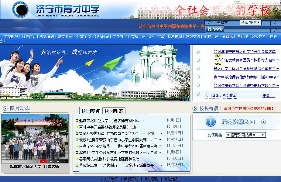 沐孔孟儒風(fēng),仰運(yùn)河文化。在濟(jì)寧這方古老而神奇的文化沃土上,濟(jì)寧市育才中學(xué)放飛著昌明盛達(dá)的教育夢想。濟(jì)寧市育才中學(xué)由濟(jì)寧市人民政府于1995年設(shè)立興建,是濟(jì)寧市教育局直屬的國辦高級中學(xué)。1999年被評為山東省規(guī)范化學(xué)校,2006年被評為山東省首批高中教學(xué)示范學(xué)校。學(xué)校占地面積140畝,教學(xué)班74個,在校學(xué)生4100名,教職工364名。正高級教師1名,高級教師176名,省市特級教師6名,杏壇名師、突貢專家8名;全國、省優(yōu)秀教師14名,市級以上教學(xué)能手、模范班主任等106名,碩士以上研究生127名。近年來,育才中學(xué)堅持“執(zhí)行黨的教育方針、遵循教育規(guī)律、回歸教育本質(zhì)、引領(lǐng)社會進(jìn)步、守護(hù)社會良知”的辦學(xué)思想,以“辦令全社會尊重的學(xué)?!睘榭傮w愿景,堅守“普育英才”的核心育人理念,秉承“養(yǎng)浩然正氣 成經(jīng)緯之才”的校訓(xùn),形成了“辦學(xué)規(guī)范、管理嚴(yán)格、校風(fēng)純正、教師敬業(yè)、校園安全、環(huán)境優(yōu)美、質(zhì)量優(yōu)異、特色鮮明”的教育品牌,成為濟(jì)寧市窗口學(xué)校。育才中學(xué)遵循“依法辦學(xué)、自主管理、民主監(jiān)督、社會參與”的現(xiàn)代學(xué)校管理制度,采用“低重心運(yùn)行、高效率工作、規(guī)范式管理、近距離服務(wù)”的管理思想,按照“縮小管理單元、下移管理重心、激活管理活力、提高管理效能”的思路,建立“學(xué)校統(tǒng)一領(lǐng)導(dǎo)、級部直接管理、處室協(xié)調(diào)服務(wù)、學(xué)生自主發(fā)展”的工作格局,形成了“議事與決策系統(tǒng)(包括三會——黨委及校長聯(lián)席會、教代會、行政辦公會)、指揮與實施系統(tǒng)(包括六部——六個業(yè)務(wù)教學(xué)部門)、服務(wù)與協(xié)調(diào)系統(tǒng)(包括九處——九個中層處室)”三層次管理系統(tǒng),簡稱為“三會六部九處”。年級部實行一級兩部管理。重點(diǎn)加強(qiáng)了干部隊伍、班主任隊伍、教研組長隊伍、青年教師隊伍四支隊伍建設(shè),制定、實施了校長接待日制度和校長與學(xué)生共進(jìn)午餐制度。育才中學(xué)堅持質(zhì)量立校理念,堅持用實力說話的原則,做到“相同基礎(chǔ)的學(xué)生在育才發(fā)展得最好”,不斷譜寫“低進(jìn)高出、高進(jìn)優(yōu)出”的新輝煌。二十年共培養(yǎng)了十六屆兩萬余名合格畢業(yè)生,考出了恢復(fù)高考后濟(jì)寧地區(qū)第一個省狀元;有38名同學(xué)被清華大學(xué)和北京大學(xué)錄取,其中有6名同學(xué)先后成為省市高考狀元。近年來本科錄取率、高分人數(shù)比率、各類考生錄取比率逐年上升,本科錄取率達(dá)到70%。學(xué)校連續(xù)十余年被評為濟(jì)寧市“優(yōu)秀學(xué)生培養(yǎng)”先進(jìn)學(xué)校和濟(jì)寧市高中教學(xué)工作先進(jìn)學(xué)校,連續(xù)多年被市政府授予“群眾滿意單位”。經(jīng)過二十年積淀,育才中學(xué)推進(jìn)培養(yǎng)模式多樣化,滿足不同潛質(zhì)學(xué)生的發(fā)展需要,為學(xué)生提供更多選擇性、個性化、多樣化發(fā)展空間,探索發(fā)現(xiàn)和培養(yǎng)創(chuàng)新人才途徑,辦學(xué)特色日益鮮明:構(gòu)建育才獨(dú)特的核心文化,提煉核心理念;建設(shè)學(xué)校課程體系,形成特色課程;逐步優(yōu)化構(gòu)建大德育課程體系;完善“音樂、美術(shù)、體育、亞藝術(shù)、少數(shù)民族學(xué)生培養(yǎng)、國際教育”特類人才培養(yǎng)機(jī)制;建立了34個學(xué)生社團(tuán);完善家委會制度。目前形成了名家進(jìn)校園活動、重大節(jié)日活動、重大主題活動、學(xué)生社團(tuán)活動、少數(shù)民族學(xué)生培養(yǎng)和國際教育等六大特色課程體系。其中學(xué)生社團(tuán)、國際教育已成為育才中學(xué)的教育亮點(diǎn)。建校二十年來,育才人用堅毅的行動、執(zhí)著的追求,構(gòu)筑著美好的教育夢想,辦學(xué)水平不斷提高,社會美譽(yù)度連年提升。育才中學(xué)先后獲得全國校園文化建設(shè)先進(jìn)學(xué)校、全國創(chuàng)新教育名校聯(lián)盟百強(qiáng)學(xué)校、全國奧林匹克競賽十佳學(xué)校、全國中學(xué)外語教改實驗學(xué)校、山東省素質(zhì)教育工作先進(jìn)單位、山東省文明單位、山東省高考第一名培養(yǎng)學(xué)校、市級飛行員培養(yǎng)學(xué)校等市級以上榮譽(yù)100余項。北京大學(xué)、清華大學(xué)等34所全國名牌重點(diǎn)高校授予我校為優(yōu)秀生源基地,山東大學(xué)等八所高校確立我校為中學(xué)校長實名推薦制學(xué)校,山東省首個中央電視臺中學(xué)生頻道“教學(xué)實驗基地”、山東省教育廳留學(xué)中心“國際教育基地”落戶我校。