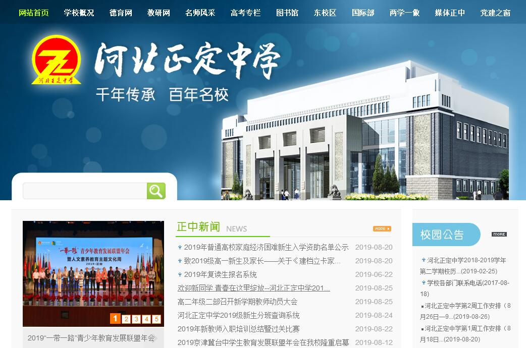| 網(wǎng)站簡(jiǎn)介: 河北省河北正定中學(xué)定位“千年傳承,百年名校”,是一所石家莊市教育局直接管理的河北省重點(diǎn)中學(xué),分設(shè)校本部、東校區(qū),均設(shè)于國(guó)家歷史文化名城正定城內(nèi)。校本部校址為原清代貢院,今府西街80號(hào);東校區(qū)位于正定恒山東路190號(hào),是一所全新建成的學(xué)校。河北正定中學(xué)是一所具有千年文化教育傳承的百年名校,1902年(清光緒二十八年),具有近兩千年歷史的正定府學(xué)、恒陽(yáng)書院合并改建為官立正定府中學(xué)堂,是直隸省(時(shí)含今北京、天津,1928年6月改稱河北省)最早建立的七所普通中學(xué)之一,開正定府地區(qū)(今石家莊市轄區(qū)大部及阜平縣)近代新式教育先河。一百多年來(lái),校名更改20多次,其主要曾用校名,民國(guó)時(shí)期,七七事變前,多年先后稱直隸省-河北省立第七中學(xué)校、河北省立正定中學(xué)校,抗日戰(zhàn)爭(zhēng)時(shí)期與兄弟學(xué)校在河南省淅川聯(lián)合創(chuàng)辦國(guó)立第一中學(xué),1946年教育復(fù)員,仍稱河北省立正定中學(xué)校;全國(guó)解放戰(zhàn)爭(zhēng)時(shí)期,正定解放后的學(xué)校曾先后稱晉察冀邊區(qū)正定聯(lián)合中學(xué)、晉察冀邊區(qū)第四中學(xué)、北岳區(qū)正定中學(xué)、察哈爾省立正定中學(xué);新中國(guó)成立前夕再次復(fù)稱河北省立正定中學(xué),1956年改稱河北正定第一中學(xué),1979年9月恢復(fù)河北正定中學(xué)校名。校名的沿革,印證正中歷來(lái)是省立或省、大行政區(qū)重點(diǎn)中學(xué)。改革開放以來(lái),在全面深化改革創(chuàng)新跨越發(fā)展中,河北正定中學(xué)建設(shè)成為擁有一流專家學(xué)者型學(xué)校領(lǐng)導(dǎo)班子和中層干部隊(duì)伍、一流教師隊(duì)伍、一流現(xiàn)代化校舍、一流現(xiàn)代化教學(xué)設(shè)施、一流人文科學(xué)管理、一流學(xué)校文化的譽(yù)滿全國(guó)百年名校。全校10多位校級(jí)領(lǐng)導(dǎo)干部,學(xué)歷均為大學(xué)本科畢業(yè),其中二人獲碩士學(xué)位;其專業(yè)技術(shù)職務(wù),均為中學(xué)高級(jí)教師,其中一人為河北師范大學(xué)碩士研究生導(dǎo)師,三人為中學(xué)特級(jí)教師;教育教學(xué)、教育科研和學(xué)校管理業(yè)務(wù)水平,絕大多數(shù)為國(guó)家、全省名師、骨干教師、優(yōu)秀教師或省、市骨干校長(zhǎng),多人自編主編或參編多部教育科學(xué)著述,四人評(píng)為河北省“三三三人才工程”第三層次人才,一人評(píng)為第二層次人才,多人評(píng)為石家莊市拔尖人才,校長(zhǎng)周慶、書記鄭軍平雙雙評(píng)為河北省骨干校長(zhǎng),校長(zhǎng)周慶還評(píng)為石家莊市中小學(xué)十大知名校長(zhǎng)、2015年全國(guó)教書育人楷模人選,榮任河北省政協(xié)教科文衛(wèi)委員會(huì)委員。全校干部隊(duì)伍中獲得各級(jí)骨干教師、優(yōu)秀教師、學(xué)科名師,以及受到市和市級(jí)以上表彰獎(jiǎng)勵(lì)的超過(guò)80%,近年來(lái)每年都有十多位中層以上干部應(yīng)邀到全國(guó)各地講學(xué)。全校有教職工500多名,均具有大學(xué)本科畢業(yè)學(xué)歷,其中8人碩士研究生畢業(yè),3人具有博士學(xué)位。全校教師來(lái)自全國(guó)25個(gè)省、自治區(qū)、直轄市,慕名河北正定中學(xué)是一所“千年傳承,百年名?!睉?yīng)聘而來(lái),絕大多是教育部直屬高等師范院校、國(guó)家重點(diǎn)辦好的百所高校優(yōu)秀畢業(yè)生。在學(xué)校廣泛深入開展教育教學(xué)科學(xué)研究創(chuàng)新實(shí)踐中,實(shí)現(xiàn)了教師隊(duì)伍“全員發(fā)展、造就骨干、打造名師”三大目標(biāo),其中在校本部238名專任教師中,擁有一大批國(guó)家、省、市教育教學(xué)專家、名師、骨干教師,其中現(xiàn)有國(guó)家、省學(xué)科名師3人,中學(xué)特級(jí)教師15人,省骨干教師15人,市學(xué)科名師19人,市骨干教師34人;專業(yè)技術(shù)職務(wù)評(píng)定,有高級(jí)教師96人。東校區(qū)也擁有一支全國(guó)一流的教師隊(duì)伍,并且兩校區(qū)教師相互交流,通盤任課。在校本部和東校區(qū),國(guó)家、省、市級(jí)骨干教師、學(xué)科名師、優(yōu)秀教師、教學(xué)能手占全校教師總數(shù)的28%以上,設(shè)有4個(gè)名師工作室;全校教師專業(yè)技術(shù)職務(wù)評(píng)聘,高級(jí)教師占37.1%,一級(jí)教師占57.1%,兩項(xiàng)合計(jì)占94.2%;多年來(lái),教師在全國(guó)、省、市教育教學(xué)業(yè)務(wù)評(píng)比獲獎(jiǎng)名列全省前茅,承擔(dān)和完成國(guó)家、省、市各級(jí)教育教學(xué)科學(xué)研究課題之多位居全省之冠。河北正定中學(xué)是一所寄宿制優(yōu)質(zhì)高級(jí)中學(xué),現(xiàn)分為校本部、東校區(qū)兩個(gè)校園。兩校區(qū)都是現(xiàn)代化的安全、精品、生態(tài)、美麗校園,全部建筑達(dá)到國(guó)家8級(jí)抗震標(biāo)準(zhǔn),各大建筑錯(cuò)落有致,綠化美化匠心獨(dú)具,得天獨(dú)厚而寶貴豐富的校史人文景觀棋布其間,學(xué)校是宜學(xué)宜教宜居的文教殿堂。校本部,占地160畝,建筑面積10萬(wàn)平方米,早在2004年即評(píng)為市、省“花園式單位”,經(jīng)過(guò)近幾年實(shí)施“校安工程”,學(xué)校建成突出正中“千年傳承,百