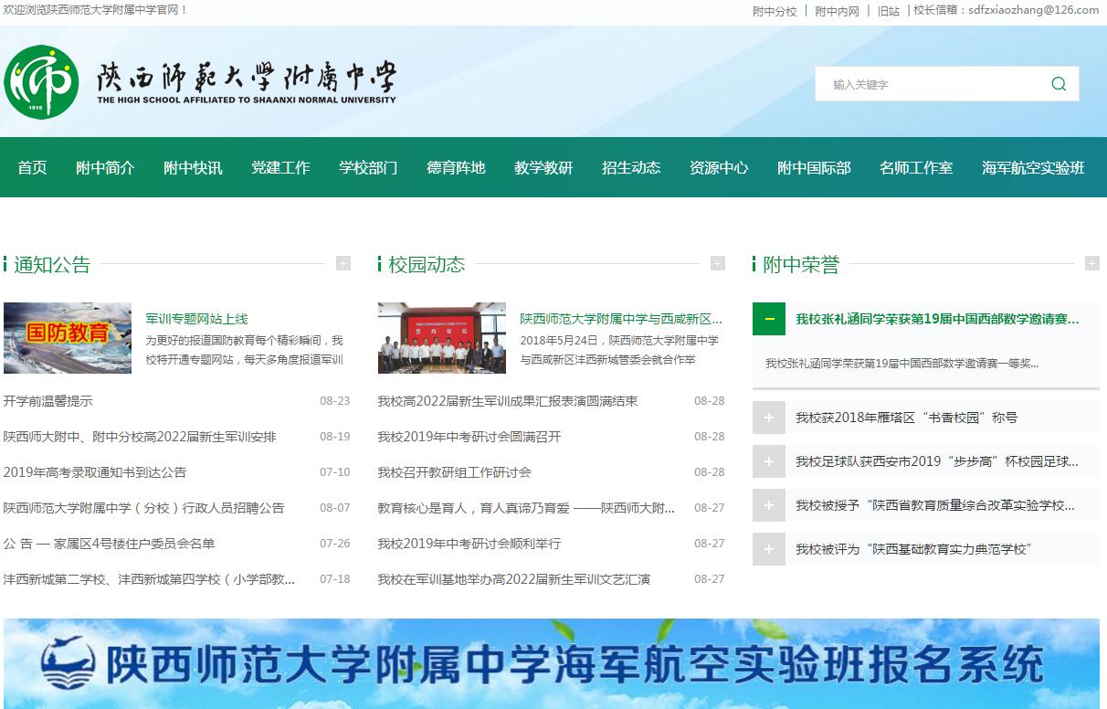 陜西師范大學附屬中學始建于1910年,有著百年的辦學歷史和優(yōu)良的教育教學傳統(tǒng),人才輩出,桃李天下。中華文化和革命傳統(tǒng)的精華鑄就了她的風骨,三秦大地的輝煌歷史和醇厚民風凝成了她的精神。她的聲譽在社會上風行遠揚,被譽為“三秦教育之星,萬千良才搖籃”。近年來,高考升學率連年攀高,被多所高校授予“生源基地”的美譽,學科競賽更是枝繁葉茂,碩果累累,在全省名列前茅。近年來,學校獲得的榮譽主要有:2008年12月被省教育廳首批命名為陜西省示范高中;2012年3月成為國家教育改革項目學科基地;2012年11月被教育部列為首批信息化試點單位;2014年1月被省委、省政府評為“文明校園”;2014年12月被西安市教育局評為“316工程”先進學校;2016年7月被推舉為陜西省校園足球聯(lián)盟盟主;2017年11月獲“西安市雁塔區(qū)2017年中小學目標管理考核”一等獎;被西安市評為2017年“全市教育信息化工作先進單位”;被陜西省委、省政府評為陜西省“未成年人思想道德建設(shè)先進單位”;被教育部列為“全國中小學心理健康教育特色學?!保挥蓳碛腥珖?0萬精英校長群體的校長會發(fā)布的《2017年中國最具影響力中小學百強榜》,附中位于全國中學第47名、西安市第2名。陜西師大附中位于古城南郊,地處曲江新區(qū),緊鄰馳名中外的大雁塔,與大唐芙蓉園隔路相望,是人文南郊的基礎(chǔ)教育中心。厚重的文化氛圍中,緊隨著最現(xiàn)代化的浪潮。校園環(huán)境優(yōu)美,綠樹成蔭。登高遠眺,整個校園掩映在一片森森秀林之中,與千年古剎大雁塔所在的慈恩寺和諧統(tǒng)一,成為美麗的曲江新區(qū)的一道亮麗風景線。漫步校園,撲面而來的生態(tài)人文氣息,高處樹林陰翳,光影參差;低處綠畦滿園,花草競芳。校園景物整體布局合理、錯落有致,先后被陜西省、西安市人民政府授予“園林單位”和“綠色校園”稱號。陜西師大附中背靠陜西師范大學,有著得天獨厚的師資來源。絕大部分教師由是陜西師范大學各院系嚴格考察后選留的優(yōu)秀畢業(yè)生構(gòu)成。教師年齡結(jié)構(gòu)合理,以中青年教師為主體,高、中級職稱教師占90%以上,其中高級職稱教師超過63%。陜西師大附中始終堅持花大力氣培養(yǎng)教師創(chuàng)新能力,提高教師素質(zhì),在學校長期的努力下,涌現(xiàn)出了一批在省市有影響的知名教師和學科帶頭人。學校現(xiàn)有教師217人,其中特級教師9人,博士6人,取得碩士學位152人,國家、省、市級骨干教師30人,學科帶頭人7人,省、市級教學能手58人,省、市、區(qū)名師工作室(坊)19個。2017年附中多名教師在各級各類評選活動中獲獎:李濤老師獲評“陜西省教學名師”,宋芝君老師獲評“省級學科帶頭人”,李娜、王芳、薛琪3位老師獲評“省級教學能手”,江志勇、李紅艷老師被評為“雁塔區(qū)名師工作室主持人”,董翼等12位老師被評為“西安市教學能手”;楊蓉等5位老師被評為“區(qū)級骨干教師或教學能手”;李偉萍等21位老師在各級各類賽教中獲得一等獎。學校占地110畝,設(shè)施齊全一流,布局有序。校園整體形成了以教學科研為中心的建筑群落,由北向南,依次為運動區(qū)、教學區(qū)、辦公區(qū)、學生公寓4大板塊。配有設(shè)備完善的理、化、生實驗室,計算機專用教室,語音專用教室,音樂專用教室,美術(shù)專用教室。每個教室都配備了先進的無塵板和多媒體觸控一體機教學設(shè)備。行政辦公室、實驗室、圖書館均實現(xiàn)了辦公自動化和計算機系統(tǒng)管理。每個教室都實現(xiàn)了冬有暖氣夏有空調(diào)的目標,配有柜式飲水機,教室全部裝配了網(wǎng)絡(luò)化多媒體教學系統(tǒng),實現(xiàn)了網(wǎng)絡(luò)化、信息化教學。學校校園網(wǎng)建設(shè)更是走在全國前列,為學生提供了更為廣闊的學習空間。學生閱覽室每年訂有350種雜志和110種報紙,每天中午和下午為學生免費開放,供學生借閱,并配有專職老師組織管理。圖書館近幾年新購圖書10萬多冊,實現(xiàn)了電子查詢、借閱系統(tǒng)管理。學生公寓寬敞明亮,均裝有空調(diào)、電話。校園有標準的400米環(huán)形跑道,寬闊的足球、籃球、排球、羽毛球和乒乓球場地。校園綠化面積超過80%,處處綠樹成蔭,青翠依依,校園里一草一木、一磚一瓦都包含著文化元素,處處凸顯環(huán)境育人的理念。陜西師大附中長期的辦學實踐中,思考教育、追求真理,最終確立了 “以人為本,愉悅學習,張揚個性,鼓勵成才”的 “為學生可持續(xù)發(fā)展奠基”辦學理念。在這一理念的指引下,著重培養(yǎng)學生的“三種能力”,即自學能力、自主能力、創(chuàng)新能力;張揚學生個性,為學生創(chuàng)設(shè)愉悅的學習氛圍;注重學生良好習慣的養(yǎng)成與可持續(xù)發(fā)展能力的培養(yǎng);關(guān)注學生的身心健康,創(chuàng)設(shè)人文情懷的環(huán)境,不僅為學生開設(shè)了有利于個性發(fā)展的、內(nèi)容豐富的選修課程,還配備了具有專業(yè)資質(zhì)的心理咨詢老師,呵護學生心理的健康,助他們安全、健康地成長,給學生個性發(fā)揮創(chuàng)設(shè)廣闊的平臺。2010年“春筍計劃”實施以來,附中投資50萬元建設(shè)了供學生自主生物探究性實驗的專門實驗室,這一項目的設(shè)立在我國西部地區(qū)中學尚屬首例。參加“春筍計劃”的學生在