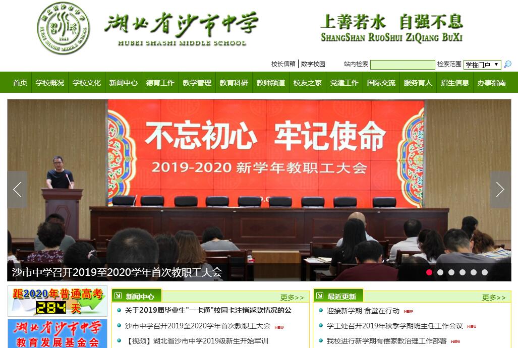 | 網(wǎng)站簡(jiǎn)介: 湖北省沙市中學(xué)(原“湖北省沙市三中”)創(chuàng)辦于1941年11月,1956年更名為“湖北省沙市第三中學(xué)”,1999年9月恢復(fù)校名為“湖北省沙市中學(xué)”。1941年11月,學(xué)校始立校于童家花園(現(xiàn)沙市區(qū)北京東路269號(hào)),其后輾轉(zhuǎn)于松滋街河市、宜昌長(zhǎng)陽(yáng)等地辦學(xué);新中國(guó)成立后回遷童家花園。2017年8月,學(xué)校整體搬遷至沙北新校區(qū)(工農(nóng)路78號(hào))。學(xué)校占地200畝,建筑面積7萬(wàn)多方,綠化覆蓋率達(dá)到50%。學(xué)校配有語(yǔ)音室、計(jì)算機(jī)教室、多媒體報(bào)告廳、微格教室、數(shù)字化實(shí)驗(yàn)室、普通理化生實(shí)驗(yàn)室、地理教室、心理輔導(dǎo)中心等,裝備有現(xiàn)代化的校園智能廣播系統(tǒng)、網(wǎng)上閱卷系統(tǒng),教室均裝備有智能交互平板一體機(jī)。學(xué)校圖書(shū)館紙介質(zhì)藏書(shū)達(dá)10多萬(wàn)冊(cè),報(bào)刊年訂數(shù)600多種,電子圖書(shū)20萬(wàn)冊(cè)。學(xué)校數(shù)字化校園的應(yīng)用涵蓋教師備課、上課、反思和評(píng)課的各個(gè)教學(xué)環(huán)節(jié),開(kāi)通了電子圖書(shū)閱覽室、電子期刊閱覽室,實(shí)現(xiàn)了校園教學(xué)管理的智能化和信息化。多年來(lái),學(xué)校堅(jiān)持全面貫徹黨的教育方針,不斷弘揚(yáng)以“上善若水”為內(nèi)核的習(xí)坎精神,贏得了諸多榮譽(yù):全國(guó)第一批重點(diǎn)中學(xué)、全國(guó)五講四美為人師表先進(jìn)集體、全國(guó)教育系統(tǒng)先進(jìn)集體、第一所湖北省普通中學(xué)示范學(xué)校、湖北省科研示范學(xué)校等。學(xué)校曾2次受到國(guó)務(wù)院嘉獎(jiǎng),7次受到部委表彰,7次被評(píng)為湖北省文明單位。2015年,學(xué)校被評(píng)為湖北省“文化建設(shè)百?gòu)?qiáng)?!?、 被共青團(tuán)中央授予“全國(guó)五四紅旗團(tuán)委”稱號(hào)。學(xué)校堅(jiān)持以習(xí)坎文化引領(lǐng)發(fā)展,經(jīng)過(guò)多年的挖掘、討論、整理,形成了“上善若水、自強(qiáng)不息”的校訓(xùn),“一切為了師生的全面、充分、主動(dòng)、和諧發(fā)展”的辦學(xué)理念,“創(chuàng)建和諧校園,打造全省一流重點(diǎn)高中”的辦學(xué)目標(biāo),“辦人民滿意學(xué)校,育國(guó)家需要英才”的辦學(xué)宗旨,“文明、和諧、自主、創(chuàng)新”的校風(fēng),“敬業(yè)樂(lè)群、愛(ài)生善教”的教風(fēng),“自信堅(jiān)毅、樂(lè)學(xué)善思”的學(xué)風(fēng)。通過(guò)對(duì)習(xí)坎文化的傳承弘揚(yáng),學(xué)校已形成和衷共濟(jì)、內(nèi)和外順、協(xié)調(diào)發(fā)展的教育模式,并不斷以獨(dú)特的學(xué)校文化體系輻射周邊。學(xué)校積極打造智慧校園,建設(shè)名師工程。學(xué)校擁有一支師德高尚、愛(ài)生樂(lè)教、業(yè)務(wù)精湛、勇于創(chuàng)新的高水平教師隊(duì)伍。學(xué)?,F(xiàn)有教職工200多人,其中特級(jí)教師6人、中學(xué)正高教師1名、高級(jí)教師120人,多人獲得“國(guó)務(wù)院特殊津貼獲得者”、“全國(guó)模范教師”、“全國(guó)優(yōu)秀教師”、“湖北省勞模”、“湖北省優(yōu)秀德育工作者”、“ 楚天園丁獎(jiǎng)”、“湖北名師”等榮譽(yù)稱號(hào)。這支團(tuán)結(jié)優(yōu)秀的團(tuán)隊(duì),以文化名校的辦學(xué)傳統(tǒng)為滋養(yǎng),以科學(xué)合理的管理制度為準(zhǔn)繩,為全體學(xué)生的蓬勃發(fā)展提供堅(jiān)實(shí)的保障。學(xué)校堅(jiān)持高舉素質(zhì)教育大旗,為學(xué)生的終身發(fā)展奠基。學(xué)校不斷實(shí)現(xiàn)以“和善行信”為核心的育人和諧,通過(guò)德育活動(dòng)序列化、社團(tuán)活動(dòng)陣地化、隊(duì)伍建設(shè)專業(yè)化,形成了全面素質(zhì)教育體系,包括愛(ài)國(guó)主義教育、傳統(tǒng)文化教育、道德法制教育、獨(dú)立人格教育、大志理想教育、科技創(chuàng)新教育、體育健康教育等一整套體系?!度嗣窠逃贰ⅰ豆饷魅?qǐng)?bào)》、《德育報(bào)》、《中國(guó)教育報(bào)》、《中國(guó)教師報(bào)》等曾分別報(bào)道了學(xué)校德育改革經(jīng)驗(yàn)。學(xué)校堅(jiān)持以教學(xué)為中心,實(shí)現(xiàn)以高效課堂為核心的教學(xué)和諧,通過(guò)遵循“以學(xué)定教、先學(xué)后教、訓(xùn)練主線、反思提升”的十六字教學(xué)原則和同課異構(gòu)、教學(xué)共同體等教研平臺(tái),打造智慧師資,深化教學(xué)改革,辦學(xué)成績(jī)突出。至2017年,學(xué)校先后培養(yǎng)了包括5名兩院院士、7名省級(jí)高考狀元、3名將軍、2名國(guó)際奧賽金銀牌得主在內(nèi)的4萬(wàn)多名各類優(yōu)秀人才,他們中有學(xué)界翹楚、商界精英、政界英才、影視明星、海外名流……近年來(lái),學(xué)校高考本科上線率、高分層人數(shù)均居全省同類重點(diǎn)中學(xué)前列,尤其是一本上線人數(shù)逐年攀升,競(jìng)賽成績(jī)?cè)谇G州市首屈一指,實(shí)現(xiàn)了“辦人民滿意學(xué)?!钡那f嚴(yán)承諾。走國(guó)際化教育之路,育國(guó)際視野的英才,是學(xué)校教育國(guó)際化的目標(biāo)。2006年,經(jīng)省教育廳審批,學(xué)校與加拿大阿爾伯塔省金山教育分局合作,開(kāi)辦了“沙市中學(xué)中加國(guó