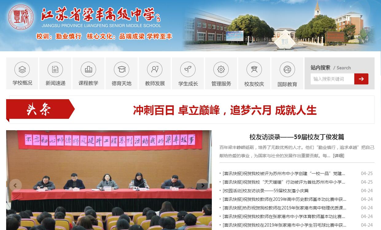 江蘇省梁豐高級中學其前身是創(chuàng)辦于清光緒年間(1894年)的梁豐書院,已有123年的辦學歷史。1997年學校首批通過國家級示范性普通高中的省級驗收,2004年被確認為江蘇省首批四星級普通高中。學校秉承“勤業(yè)、慎行”百年校訓,弘揚“品端成梁、學粹至豐”教育理念,教育教學質(zhì)量長期穩(wěn)定在一個較高的水平上。學校設施設備先進,環(huán)境優(yōu)美。學校占地面積193畝,建有國際標準的田徑場和設施齊全的體育館、藝術中心、會議中心和報告廳,有藏書10萬多冊的圖書館和設備先進的理化生實驗室、信息中心;學校環(huán)境優(yōu)雅,學生宿舍空調(diào)、熱水器等生活設施配套齊全,是江蘇省首批書香校園建設示范點,全市美麗學校示范校。學校文化底蘊深厚,名師薈萃。學?,F(xiàn)有江蘇省首批教授級中學高級教師2名,江蘇省特級教師6名,蘇州市名教師7名,蘇州市學科教改帶頭人14名,張家港市學科教改帶頭人、教學能手和教壇新秀近70名,碩士研究生53名;學校還擁有一批經(jīng)驗豐富、敬業(yè)愛崗的學科競賽指導老師和金牌教練,為學生的個性發(fā)展、特長發(fā)揮提供有益的指導。學校教育質(zhì)量卓著,成績輝煌。歷年高考成績在蘇州市、江蘇省名列前茅,年級平均總分、高分段人數(shù)和本一、本二達線率等各項指標穩(wěn)居蘇州市重點中學前列。先后有24名學生高考獲得“李政道獎學金”。2000年以來,學校有60名學生錄取清華、北大。2017年,學校高考再攀新高,有83名學生錄取錄取985高校,198名學生錄取211高校,其中朱志軒同學錄取清華大學,蘇州地區(qū)總共錄取6人。高二年級有9名同學提前參加高考,7人錄取中國科學技術大學。學校每年都有一大批學生獲得一流名牌高校的保送和自主招生錄取資格,每年均為清華大學、北京大學、南京大學、浙江大學、中科大等國內(nèi)著名重點大學輸送大量的優(yōu)秀生源。學校注重素質(zhì)教育,碩果累累。每年都有一大批特長學生在數(shù)、理、化、生和信息學等各學科競賽中獲得高層次獎項。近幾年來,學生榮獲國際中學生物理和生物學奧林匹克競賽金牌2枚,全國金牌20多枚,每年都有200多人次獲得了江蘇省級以上學科競賽獎項。籃球、足球、健美操、演講、書法、繪畫、作文、民樂、科技創(chuàng)新、機器人大賽以及中學生辯論賽等活動都取得了優(yōu)異的成績,是江蘇省普通高中課程基地學校、全國青少年校園足球特色學校。學校國際課程豐富,成果顯著。我校國際部是美國大學理事會(College Board)在張家港最早授權的AP國際教學中心,與美國威斯康辛州的簡斯維爾學區(qū)、馬斯菲爾學區(qū)、華沙學區(qū)、瑞本學區(qū)、瑞普茲學區(qū)和密歇根州的羅切斯特學區(qū)等諸多全美知名公立學區(qū)締結了友好合作、聯(lián)合辦學的關系。國際部引進美國公立高中部分原版課程,為學生提供“2+1”、“2+2”等多元化進入美國高中和大學就讀的渠道。2017年梁豐高中國際部美國大學錄取工作再上新臺階,“2+1”留學模式優(yōu)勢凸顯,取得巨大成功。港城4名被美國頂尖公立常春藤名校威斯康辛大學麥迪遜分校錄取的學生花落梁豐。有1名學生被著名的紐約大學破格錄取,50%以上的學生進入世界排名前50的綜合性大學或者文理學院。在被錄取的學生中,學生獲得的個人獎學金最高達10萬美金。時代催發(fā)青春的綠葉,奮發(fā)向上攀登的氣概。梁豐高中正踐行“勤業(yè)、慎行”百年校訓,堅守“品端成梁、學粹至豐”教育理念,努力建辦一所有信仰、有勇氣、有擔當?shù)囊杂藶槭姑母咂焚|(zhì)示范高中。