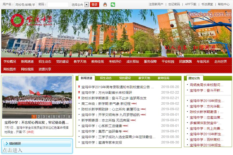 寶雞中學始創(chuàng)于1940年,現(xiàn)為寶雞市教育局直屬的省級示范高中。由于辦學歷史悠久,文化積淀深厚,歷代英才輩出,辦學業(yè)績卓著,成為全市基礎(chǔ)教育的一面旗幟,素有“三秦明珠,人才搖籃”美譽。學校坐落于寶雞市東開發(fā)區(qū),校園占地200畝,建筑面積13萬平方米。教育教學設(shè)施領(lǐng)先齊全,建有VR教室、3D打印及“創(chuàng)客”實驗室,圖書館(讀書吧)、學生社團場地充裕,建有標準化的足球場和田徑場地,運動配套設(shè)施齊備。本著凈化先行、綠化為主、亮化增色、美化提升的思路,建成以梅為主、松竹為輔的景觀園林五塊,校園四季花香,常年郁翠,人文奮爭。學?,F(xiàn)有87個教學班,在校學生5400多名。在職教職工403人,其中正高級教師3人,中高級職稱教師198人,全國優(yōu)秀教師2人,陜西省特級教師6人,省市級學科帶頭人12人,省市級教學能手93人,市級拔尖人才6人。近三年來教師發(fā)表文章500余篇,出版專著、校本教材30余部。學校全面貫徹黨的教育方針,鎖定“創(chuàng)建中華名?!睉?zhàn)略,秉承“培育走向世界的現(xiàn)代中國人”培養(yǎng)目標,深化“以人為本,和諧共進”的辦學理念,厚植“教師和質(zhì)量兩個至上,成績和成果兩個導向”的學校特色文化,堅持“理念引領(lǐng)、目標激勵、課堂提質(zhì)、教研強師、制度保障、特色發(fā)展”的辦學思路,傾力創(chuàng)設(shè)敢為人先、追求卓越的精神圣地。學業(yè)水平和高考成績保持高位攀升,每年有1000余名學生在全國各類競賽中頻獲佳績。學校實行理事會領(lǐng)導下的校長負責制,設(shè)有黨政辦公室、教務(wù)處、教師發(fā)展處、學生發(fā)展處、考核評價處、總務(wù)處、保衛(wèi)處、團委、三個年級部和國際部。立足大規(guī)模辦學實際,學校推行年級部負責制,落實“四服務(wù)”遵循(領(lǐng)導服務(wù)教師,教師服務(wù)學生,部門服務(wù)年級,全校服務(wù)教學),全力營造讓每個寶中人都能出彩的寬松環(huán)境。學校連續(xù)多年榮獲市教育局目標任務(wù)和綜合治理考評“雙第一”,成功躋身全國特色學校和全國百強中學,在各級各類創(chuàng)評活動中屢獲殊榮。