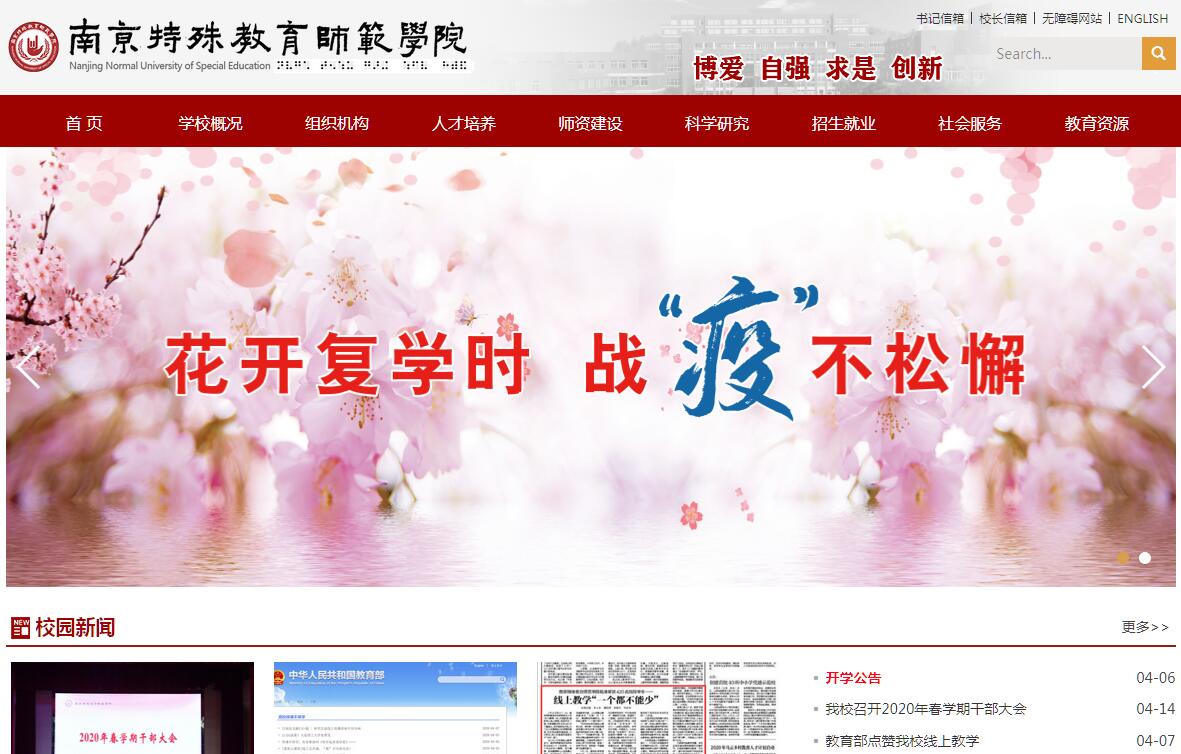 南京特殊教育師范學(xué)院坐落于“博愛之都”南京,是全國唯一一所獨立設(shè)置,以培養(yǎng)特殊教育師資為主,兼及殘疾人高等教育與殘疾人事業(yè)管理與服務(wù)專門人才培養(yǎng)的普通本科高校。學(xué)校前身是1982年教育部創(chuàng)辦的新中國第一所特殊教育師范學(xué)校---南京特殊教育師范學(xué)校,為我國政府與聯(lián)合國兒童基金會的合作項目單位,隸屬教育部管理。1997年學(xué)校劃歸江蘇省人民政府管理,同年開始培養(yǎng)五年制大專生。2002年升格為南京特殊教育職業(yè)技術(shù)學(xué)院,招收三年制應(yīng)屆高中畢業(yè)生。2009年成為中國殘疾人聯(lián)合會和江蘇省人民政府共建單位。2013年經(jīng)教育部批準,學(xué)?;I建“南京特殊教育師范學(xué)院”。2015年學(xué)校正式升格為普通本科高校,開啟本科辦學(xué)。學(xué)校是“江蘇省特殊教育師資培訓(xùn)中心”、“全國殘疾人職業(yè)教育師資培訓(xùn)基地”和全國卓越特殊教育教師培養(yǎng)改革項目單位。學(xué)校先后榮獲“全國特殊教育先進單位”、“全國語言文字規(guī)范化示范?!?、“江蘇省文明單位”、“江蘇省精神文明建設(shè)先進單位”、“江蘇省高校先進基層黨組織”和“江蘇省高等學(xué)校和諧校園”等多項榮譽稱號。學(xué)?,F(xiàn)有燕子磯主校區(qū)和江寧分校區(qū),占地面積502.8畝。主校區(qū)南望巍巍鐘山,北瀕滔滔長江,西接壯麗幕府,東連秀美棲霞。院內(nèi)芳草碧樹廣樓連宇,紅墻白壁短崗靜池,環(huán)境優(yōu)美設(shè)施齊備,人文蔚起博愛塑魂。校舍建筑總面積16.152萬平方米,教學(xué)科研儀器設(shè)備總值4457萬元。圖書館館舍面積11862.7平方米,館藏紙質(zhì)圖書65萬余冊,數(shù)字資源數(shù)據(jù)庫12個,收藏電子圖書140萬余冊,館藏結(jié)構(gòu)以特殊教育與殘疾人事業(yè)類、師范人文類為主,其中盲文書籍館藏量為全國高校第一。學(xué)校建有校內(nèi)實驗(訓(xùn))室61個,在全國建有實習(xí)(訓(xùn))基地129個。特殊兒童康復(fù)實踐教育中心和特殊教育教師實踐教育中心為省級實驗教學(xué)與實踐教育中心。特殊兒童障礙與干預(yù)技術(shù)為省級重點建設(shè)實驗室。建有國內(nèi)第一所教育類專題性歷史博物館——中國特殊教育博物館,館藏特教類實物與文獻2300余件,建有通史館、文獻館、技術(shù)館、體驗館、影視廳。中國殘疾人事業(yè)博物館、集郵館正在籌建中。學(xué)校設(shè)有特殊教育學(xué)院、學(xué)前教育學(xué)院、康復(fù)科學(xué)學(xué)院、音樂學(xué)院、語言學(xué)院、數(shù)學(xué)與信息科學(xué)學(xué)院、管理學(xué)院(殘疾人事業(yè)管理學(xué)院)、美術(shù)學(xué)院/陽光學(xué)院、繼續(xù)教育學(xué)院(省師資培訓(xùn)中心辦公室)、馬克思主義學(xué)院和體育學(xué)院等11個學(xué)院,共開設(shè)38個本、??茖I(yè),涉及教育學(xué)、文學(xué)、管理學(xué)、法學(xué)、理學(xué)、工學(xué)、農(nóng)學(xué)、醫(yī)學(xué)、藝術(shù)學(xué)等九大學(xué)科門類。擁有高等教育教學(xué)成果獎國家級二等獎1項、省級教學(xué)成果獎7項。擁有中央財政支持重點建設(shè)專業(yè)2個,已建成省級品牌、特色專業(yè)4個,特殊教育專業(yè)為江蘇高校品牌專業(yè)建設(shè)工程一期建設(shè)項目。擁有國家級精品資源共享課2門、省級精品課程4門、省級在線開放課程立項課程2門。國家級精品教材2本,省級重點教材5本,省級精品教材7本,省級教學(xué)團隊1個。近5年來,學(xué)校教師出版專著(教材)107部,在中文核心刊物上發(fā)表論文354篇,CSSCI收錄221篇,SSCI、EI論文十余篇。學(xué)校擁有教育學(xué)、公共管理學(xué)2個“十三五”省級重點建設(shè)學(xué)科,1個江蘇高校重點建設(shè)實驗室、1個江蘇高校哲社科校外研究基地、1個江蘇高校哲社科重點研究團隊。學(xué)校與南京師范大學(xué)、南京郵電大學(xué)聯(lián)合開展研究生培養(yǎng)工作。學(xué)校近年來承擔(dān)國家自科基金、國家社科基金、教育部人文社科基金以及教育規(guī)劃重點課題等20余項,承擔(dān)并完成教育部、國家語委、中殘聯(lián)等部委重大、重點課題30余項,作為主要完成單位研制了《義務(wù)教育聾校課程標準 》、《特殊教育教師專業(yè)標準》等國家標準;獲部省級科研成果獎5項,廳局級優(yōu)秀成果獎29項,多項研究成果為中國社科院、中殘聯(lián)等單位批示采納。學(xué)?,F(xiàn)有全日制在校生6172人(其中殘障大學(xué)生488人)。專任教師中具有高級專業(yè)技術(shù)職務(wù)的達56.1%,具有碩士以上學(xué)位的達77.6%。有享受國務(wù)院政府特殊津貼1人,新世紀百千萬人才工程國家級人選1人,第二批國家“萬人計劃”領(lǐng)軍人才1人,中央宣傳部文化名家暨“四個一批”人才1人,教育部新世紀優(yōu)秀人才支持計劃人選1人,省部級有突出貢獻中青年專家3名,省優(yōu)秀教學(xué)團隊2個,省教學(xué)名師2名,省優(yōu)秀教育工作者5名,省“六大人才高峰”高層次人才培養(yǎng)對象4名,省“333高層次人才培養(yǎng)工程”第二、第三層次培養(yǎng)對象18名,省“青藍工程”中青年學(xué)術(shù)帶頭人培養(yǎng)對象11名,省“青藍工程”優(yōu)秀青年骨干教師培養(yǎng)對象26人。建校36年來,