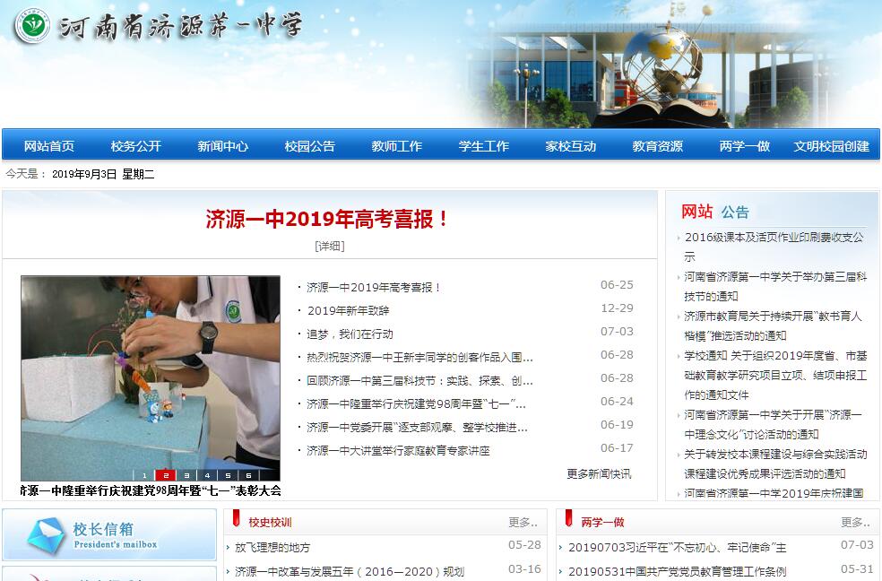 濟源一中始建于1926年,坐落于全國優(yōu)秀旅游城市——濟源市的政治、文化中心地帶,是河南省首批示范性高中、“清華大學新百年領(lǐng)軍計劃優(yōu)質(zhì)生源基地”與“北京大學校長實名推薦制”學校。新校區(qū)總投資3億元,占地515畝,建筑面積26萬平方米,分為教學、運動、生活、行政四區(qū),設(shè)計新穎,氣勢恢宏,造型別致,獨具特色。郭沫若先生親題的校名、范曾先生題寫的校訓熠熠生輝,令人矚目。滄海桑田,歲月飛逝。歷經(jīng)90余年的光輝歷程,濟源一中已發(fā)展成為一所擁有108個教學班、500余名教職工、6000余名學生的現(xiàn)代化新型高中。學校先后投資建成了閉路電視系統(tǒng)、校園網(wǎng)絡(luò)系統(tǒng)、教學錄播系統(tǒng),所有教室都安裝了多媒體教學系統(tǒng),擁有一流的體育、藝術(shù)設(shè)施,28個高標準物理、化學、生物實驗室,7個多功能會議廳,6個計算機教室。圖書館藏書量達20余萬冊,報刊雜志600余種,開架借書,微機管理,全天候服務(wù)。濟源一中游泳館作為全國最大的太陽能供熱項目,目前已經(jīng)投入使用,又為這所濟源基礎(chǔ)教育的“航母”增添了許多魅力。濟源一中光榮的傳統(tǒng)和長期的文化積淀使她在省內(nèi)外享有盛譽。幾十年來,濟源一中為國家培養(yǎng)了數(shù)以萬計的優(yōu)秀人才。李長春、李鐵映、韓啟德等領(lǐng)導(dǎo)同志先后蒞臨視察,并給予高度評價。近年來,濟源一中堅持走“以生為本,以師為先,質(zhì)量為上”的內(nèi)涵發(fā)展之路,強化學科特色,優(yōu)化教師隊伍,創(chuàng)新教學模式,正逐步彰顯出一所名校的特質(zhì)。學校現(xiàn)有教職工500余人,其中特級教師7人,高級教師120余人,100余人獲得研究生課程,70多名青年教師在省優(yōu)質(zhì)課及教學技能大賽中獲一等獎,居全省同類學校之首,其中6人代表河南省參加全國優(yōu)質(zhì)課大賽獲一等獎。“8+1”工作室已成為全國知名班主任研修團隊,被評為“河南省最具智慧力班主任優(yōu)秀團隊”“全國名班主任工作室”,榮登《班主任之友》雜志封面,被《人民日報》《教育時報》等多家國家級、省級媒體連續(xù)報道。學校體育藝術(shù)蓬勃發(fā)展。體育健兒在歷屆全省中學生田徑運動會及全省傳統(tǒng)項目學校等比賽中,摘金奪銀,屢創(chuàng)佳績,競技水平始終在全省處于第一軍團的行列。濟源一中先后成功承辦了全國CUBA大學生籃球夏令營、第四屆全國CSBA中學生籃球錦標賽、第十屆“藝林杯”全國國標舞公開賽等大型賽事。2014年暑期,在河南省第十二屆運動會暨首屆健身大會中學生組“晨光”體育夏令營中,校男子乒乓球隊榮獲團體第二名,女子排球隊榮獲第四名;在中學生組田徑比賽中,男子田徑隊獲一金兩銀兩銅,女子田徑隊獲一金兩銀兩銅。在河南省體育傳統(tǒng)項目學校比賽中,校女子籃球隊榮獲高中組第二名;校田徑隊獲團體總分第二名,其中女子田徑獲得兩金三銀,榮獲女子團體第一名,男子田徑隊獲得一銀一銅;男子排球隊榮獲第四名,女子排球隊榮獲第四名;男子乒乓球隊獲得團體第四名。在全國啦啦操聯(lián)賽暨中國啦啦之星爭霸賽鄭州站比賽中,校啦啦操隊榮獲中學組規(guī)定動作花球第一名,中學組街舞規(guī)定動作第一名。學校藝術(shù)團在歷屆全國校園春節(jié)聯(lián)歡晚會中,《朝霞》、《陽光網(wǎng)絡(luò)》、《且吟春雨》等舞蹈獲得金獎,先后應(yīng)邀赴新加坡、馬來西亞、香港訪問演出,取得圓滿成功。在河南省歷屆中小學生藝術(shù)展演活動中,舞蹈《夢開始的地方》、《校園情懷》等節(jié)目均獲一等獎,2013年合唱《水母雞》、舞蹈《悠悠香蘭》在全國第四屆中小學生藝術(shù)展演中分獲一、二等獎,濟源一中成為河南省唯一連續(xù)四屆參加全國展演的學校。學校以學生的終生發(fā)展和培養(yǎng)高素質(zhì)創(chuàng)新人才為目標,教育教學質(zhì)量逐年提升。2016年高考再創(chuàng)輝煌,本科上線率達91.8%,8名學子被清華、北大、香港中文大學錄取,6名學生被國外名校錄取,學校先后獲得“全國未成年人思想道德建設(shè)先進單位”“全國群眾體育先進單位”“全國學校藝術(shù)教育工作先進單位”“全國五四紅旗團委”“省級文明單位”“ 河南省教育系統(tǒng)先進集體”等60余項省級以上榮譽,2014年被省教育廳確定為“河南省綜合創(chuàng)新高中”“河南省信息技術(shù)與學科深度融合實驗?!?,辦學效益逐年提高,社會美譽度日益提升,贏得了社會各界和全市人民的充分肯定與廣泛贊譽。