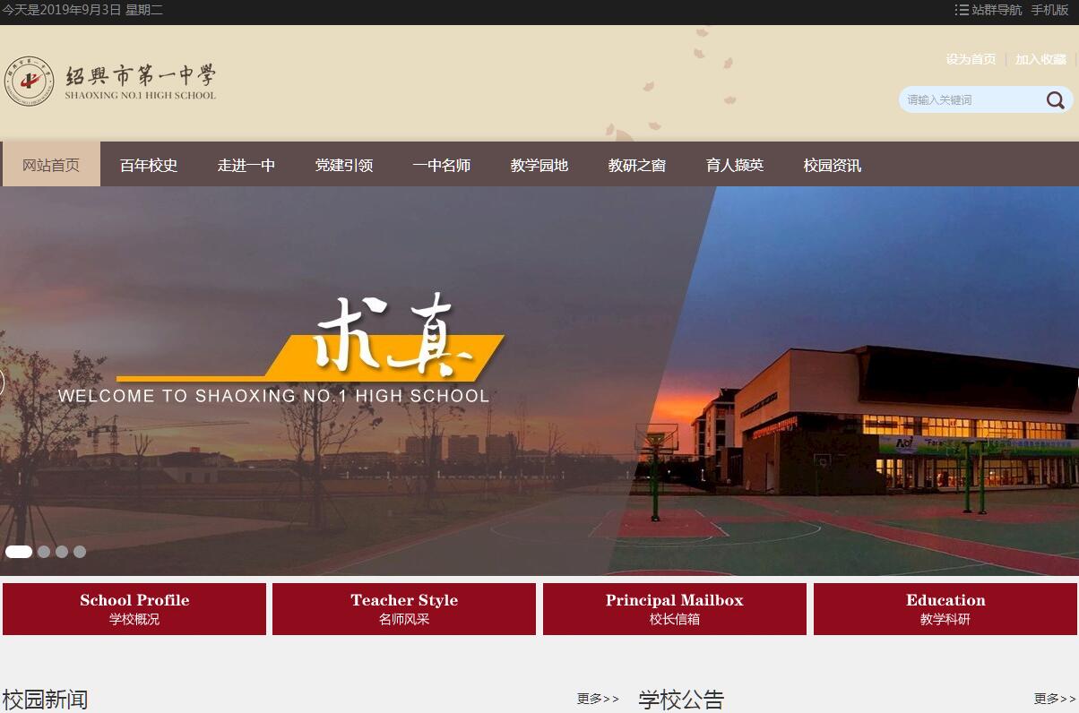紹興市第一中學(xué)創(chuàng)辦于1897年,前身為山陰鄉(xiāng)紳、維新人士徐樹蘭捐銀籌款創(chuàng)辦的“紹郡中西學(xué)堂”,是當(dāng)時國內(nèi)最早的新式學(xué)堂之一。至今橫跨三個世紀(jì),已有一百二十年的悠久歷史。蔡元培、魯迅、杜亞泉、劉大白、斯霞等教育名家曾先后在我校探索教育的改革實踐,書寫了昔日領(lǐng)教育改革風(fēng)氣之先的篇章,也構(gòu)成了今日紹興一中頭頂燦爛的星辰。在漫長的辦學(xué)歷程中,學(xué)校全面秉承“求真”校訓(xùn),堅守“存古開新、兼容并包”的辦學(xué)理念,堅持“文化治?!钡陌l(fā)展方略,大力實施“求真視野下走向‘博雅’的生本教育”,努力培育具有“抱定宗旨、砥礪德行、博雅通達”完全人格的未來世界精英。積淀了豐厚的歷史文化,形成了鮮明的辦學(xué)特色,取得了顯著的教育業(yè)績。學(xué)校位于紹興大城市核心區(qū)塊——鏡湖新區(qū),占地201畝,總建筑面積7.92萬平方米,現(xiàn)有教學(xué)班51個,總投資3.5億元,是一所“書卷氣、厚重感、園林式、特色化”的現(xiàn)代化學(xué)校。學(xué)校是紹興地區(qū)歷史最悠久、影響力最大的學(xué)校。早在1954年,學(xué)校就被認定為浙江省級重點中學(xué),1981年進入浙江省首批辦好的十八所重點中學(xué)行列,1995年成為浙江省首批十三所一級重點中學(xué)之一。學(xué)校先后獲得省文明單位、先進學(xué)校、綠色學(xué)校、現(xiàn)代教育技術(shù)實驗學(xué)校等榮譽稱號,是全國信息學(xué)奧林匹克競賽特色學(xué)校,也是北大、清華等一流名校的實名推薦學(xué)校和優(yōu)秀生源基地學(xué)校。學(xué)校師資優(yōu)質(zhì),名師輩出。蔡元培曾任校長,魯迅曾任教務(wù)主任,杜亞泉、劉大白、斯霞等教育名家曾先后在我校探索教育改革實踐,書寫了昔日領(lǐng)教育改革風(fēng)氣之先的篇章。目前,學(xué)校有專任教師204人,其中特級教師4人,正高級教師4人,高級職稱101人。學(xué)校有國際金牌教練1人,享受國務(wù)院特殊津貼專家1人,全國優(yōu)秀教師1人,全國和浙江省優(yōu)質(zhì)課一等獎獲得者13人,省功勛教師、勞動模范、優(yōu)秀教師、名師培養(yǎng)對象、教壇新秀等12人,紹興市勞動模范、模范教師、師德楷模、高級專家、領(lǐng)軍人才、專業(yè)技術(shù)拔尖人才、學(xué)科帶頭人、名師名校長培養(yǎng)對象、教壇新秀、“三十佳”教師等60人。學(xué)校在學(xué)科建設(shè)方面成績突出,現(xiàn)有十門學(xué)科的紹興市名師工作室,是浙江省普通高中生物學(xué)科培育基地學(xué)校,紹興市普通高中信息學(xué)、物理重點特色學(xué)科學(xué)校和物理、數(shù)學(xué)、英語學(xué)科培育基地學(xué)校。學(xué)校高考和學(xué)科競賽成績?nèi)☆I(lǐng)先,對外交流、國際化教育成果明顯。近年來,有50余人進入浙江省文、理科前100名,有140多人進入清華、北大,學(xué)生高考一本上線人數(shù)穩(wěn)定在600人以上。學(xué)校與安生美國課程中心合作開辦了國際班,為學(xué)生打開了就讀國際名校的大門。在學(xué)科競賽方面,形成了“以信息學(xué)為特色,多學(xué)科百花齊放”的格局。截止目前,學(xué)校累計獲得國際獎牌60余枚,其中物理、生物、天文國際金牌各1枚,信息學(xué)國際金牌6枚,國際金牌數(shù)居浙江省第二位。辦學(xué)至今,學(xué)校為社會培養(yǎng)了四萬余名德才兼?zhèn)涞膬?yōu)秀畢業(yè)生,其中包括十九位中外院士;走出了二位北大校長(蔣夢麟),還有著名教育家、文學(xué)家夏丏尊,中國公共衛(wèi)生事業(yè)的先驅(qū)金寶善,著名歷史地理學(xué)家陳橋驛等杰出人士。目前,學(xué)校借浙江省新課程、新高考改革和新一中建設(shè)之東風(fēng),實施新一輪品質(zhì)發(fā)展和特色發(fā)展戰(zhàn)略,進一步提高自身的辦學(xué)水平和辦學(xué)品位。紹興一中正朝著以“‘存古開新、兼容并包’為特質(zhì)的全國一流江南名?!钡哪繕?biāo)而奮力前進。