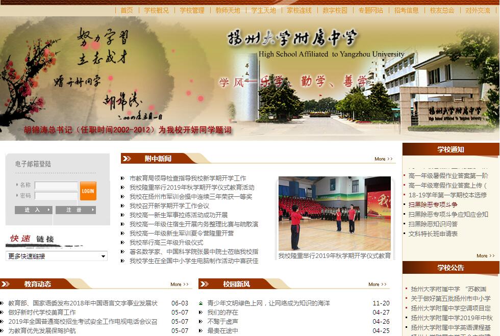 揚大附中是首批辦好的省重點中學(xué)。揚大附中師資力量雄厚,可謂高手云集,明星薈萃,其中有享受國務(wù)院特殊津貼的專家2人、全國優(yōu)秀教師4人、全國模范教師3人、全國優(yōu)秀音樂教師2人、省特級教師14人、江蘇省首批名教師2人、省中青年專家1人,有突出貢獻的中青年專家6人、市級特級教師9人、揚州市中青年專家6人,市級以上骨干教師90人,在揚州市首屈一指;揚州大學(xué)兼職碩士生導(dǎo)師6名,赴國外進修、交流教師、學(xué)者30多名,碩士層次人才66名。他們擔(dān)負著學(xué)校、揚州市乃至江蘇省教育教學(xué)以及教科研領(lǐng)域的引領(lǐng)、示范重任。在揚州市教育局組織的年度綜合考評中,我校以精致的管理、驕人的業(yè)績、跨越式的發(fā)展獲得高分,2006-2010年連續(xù)五年獲得“教育工作先進單位”。我校教師在各類教學(xué)競賽中獲獎累累,近年來,四十多名教師在全國、省、市教學(xué)競賽中獲特等獎、一等獎。教師每年發(fā)表論文論著計百篇(部),不少論文論著獲國家、省、市優(yōu)秀論文、成果獎;每年均有近百名學(xué)生在全國及省級奧林匹克數(shù)、理、化、生競賽中獲一、二、三等獎。學(xué)校積極實施體育健康標(biāo)準和藝術(shù)課程標(biāo)準,確保學(xué)生每天參加體育活動的時間一小時以上,極大滿足了學(xué)生全面發(fā)展和學(xué)校傳統(tǒng)項目發(fā)展的要求。學(xué)校積極開展校園藝術(shù)文化建設(shè),設(shè)立了曲水合唱團、形體舞蹈、器樂、美術(shù)等藝術(shù)社團,每年舉辦1-2屆校園文化藝術(shù)節(jié),深受學(xué)生歡迎。學(xué)校與美國、英國、新加坡等國多所學(xué)校結(jié)為友好交流學(xué)校,先后組織教師、學(xué)生赴美國、英國、日本、澳大利亞、新加坡等國進行交流訪問,同時也多次接待美國、英國、日本、澳大利亞、新加坡等國的教育專家、學(xué)者以及學(xué)生來訪與交流。