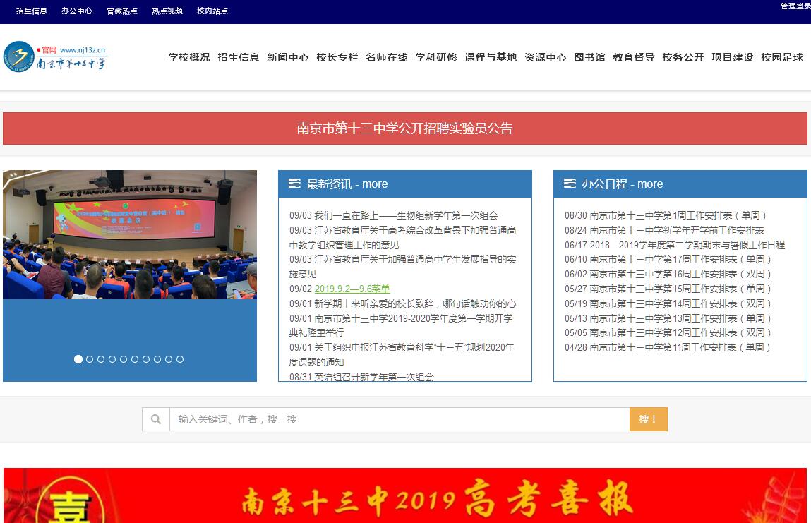 南京市第十三中學坐落于六朝文化古都之中心地帶,位于玄武湖畔、鼓樓東側、北極閣麓、臺城腳下,毗鄰南京市政府、東南大學、雞鳴古寺等。作為南京市十佳景觀校園,環(huán)境優(yōu)美,校園典雅,綠樹成蔭,四季飄香,辦學設施一流,教學設備先進、功能配套齊全,蘊含著深厚的文化積存,洋溢著濃郁的人文氣息,是南京中心城區(qū)中名符其實的讀書的好地方。學校建于1955年,是南京解放后黨和人民政府創(chuàng)辦的第一所完全中學。1959年被確定為南京市六所重點中學之一,1960年江蘇省委確定為省18所重點學校之一,1996年被江蘇省教委再次確認為省級重點中學,2000年以當年全省總分第一的考核成績被江蘇省教育廳確定為國家級示范性高中,2004年被江蘇省教育廳轉評為江蘇省首批四星級學校,2011年、2017年均以免于現(xiàn)場評審通過四星級學校復審。學校始終秉承“以學生為中心,提升師生的生命質量”的辦學理念,將“得天下英才而育之”作為自己的使命和責任,不斷傳承和弘揚優(yōu)良文化傳統(tǒng),崇尚科學與人文精神,高質量立校,寬視野辦學,形成了以校訓“志遠行近”和校風“務實求高”為核心的十三中精神。十三中始終秉持“以學生為中心,提升師生生命質量”的辦學理念,堅守“成人與成才齊頭并進,素質與分數(shù)相得益彰,今天和明天不偏不廢”的辦學主張,高起點立校、高品位辦學、高品質行動,逐漸發(fā)展為一所特色鮮明、成績卓著的國家級示范性高中,在學校課程、隊伍建設、質量推進、教育科研、特色建設等方面居于全省、全市領先位置,有效地形成了現(xiàn)代化、研究型、個性化、人文型的辦學特色。學校被評為全國青少年思想政治工作先進集體、全國貫徹體衛(wèi)工作條例優(yōu)秀學校、中國體育優(yōu)秀實驗學校、全國體育傳統(tǒng)學校先進集體、江蘇省文明單位、江蘇省文明校園、江蘇省德育先進學校、江蘇省現(xiàn)代化示范學校、江蘇省綠色學校、江蘇省教科研先進學校、江蘇省首批教師發(fā)展示范基地學校、南京市教育發(fā)展先進單位等,成為南京市首批高中校長培訓基地學校、南京市首批教師培訓基地。學校輝煌的辦學業(yè)績,源于一支結構合理、實力雄厚、群星璀璨的師資隊伍的強有力支撐。學校教師素以“勇于擔當,勤于超越,樂于奉獻”的工作精神和業(yè)績享譽市內外,其特有的進取意識、敬業(yè)品格、踏實作風詮釋了優(yōu)秀教師團隊的師德師能。目前學校高中部教職員工185人,其中在職特級教師6人,教授級高級教師5人,高級教師82人;全國優(yōu)秀教師1人,省市優(yōu)秀教育工作者、勞動模范、“陶行知獎”獲得者、“斯霞式人民教師”15人,市學科帶頭人11人,市優(yōu)秀青年教師23人,市學科中心組成員24人;區(qū)學科帶頭人、區(qū)優(yōu)秀青年教師37人;具有碩士學位104人,博士1人,出國研修101人;省市級以上教學大賽一等獎20余人,南京市名師工作室4個,學校成為全國教育碩士專業(yè)學位研究生聯(lián)合培養(yǎng)示范基地。學?,F(xiàn)有普通高中42個班、國際高中9個班,聘用專職外籍教師20人擔任外教工作。教師們牢固樹立“問題即課題”、“教學即研究”的思想,堅持“兩把工程”(把我們的行動拿出來研究,把研究的成果付諸于行動),形成了獨特的教學風格,成為兼具學科教學理論與實踐的行家里手;教師們以“愛滿天下”的人民教育家陶行知先生和胸懷“童心母愛”的斯霞老師為楷模,敢于擔當,愛生如子,勤懇耕耘,卓越奉獻,奠定了十三中光輝業(yè)績的基礎。學校文化的核心價值觀呈現(xiàn)了“內圖個性之發(fā)展,外圖貢獻于其群”的特征,為此學校把學生的健康成長與進步奉為辦學的價值取向,在教育教學管理、課程實施上謀求學生的自主、主動、和諧的發(fā)展,形成了獨有的教育特色和優(yōu)勢。學校的管理特色,在于堅持目標引領,倡導勤奮求實,教會自主學習。目標引領,在于引導學生仰望理想的天空,心中有追求;勤奮求實,在于引導學生踏實走好人生的每一步;自主學習,在于引導學生追求“學會”到“會學”,增添發(fā)展的后勁;優(yōu)良習慣,在于引導學生有意志、有方法。管理重在強調嚴格要求與積極服務相結合,讓學校管理更加高效;傳授知識與激發(fā)潛能相結合,讓教師育人更加科學;當下功利與長遠利益相結合,讓學生成長更加自主。全面引導激勵學生勇于擔當和發(fā)展領導力,具備“精英意識,平民情懷”,牢固樹立優(yōu)秀意識,培育優(yōu)秀品質,形成優(yōu)秀行為。學校的教學特色,在于以培養(yǎng)基礎寬厚、全面發(fā)展的學生為基本目標,有效融合國內外先進經(jīng)驗,積極探索優(yōu)秀人才的培養(yǎng)規(guī)律和模式,全方位進行學校課程綜合改革,堅持精致管理和有效教學,全面推進多樣化、特色化學校建設。教師研究“錯題糾得準”、“作業(yè)做的準”和“學習學的準”,通過Pad技術支撐教學和“智學網(wǎng)大數(shù)據(jù)”實現(xiàn)學生的個性化學習,推進學生的個性化成長。學校通過“人人開設公開課”、“師徒結對幫學課”、“同課異構研究課”、“行知杯大獎賽”等深度教學研討活動,以“百尺竿頭、更進一步”的擔當,保持教育教學質量的高位持續(xù)增長。學校高考文化類考生本科達線率達99.5%,一本以上達線率80%以上,每