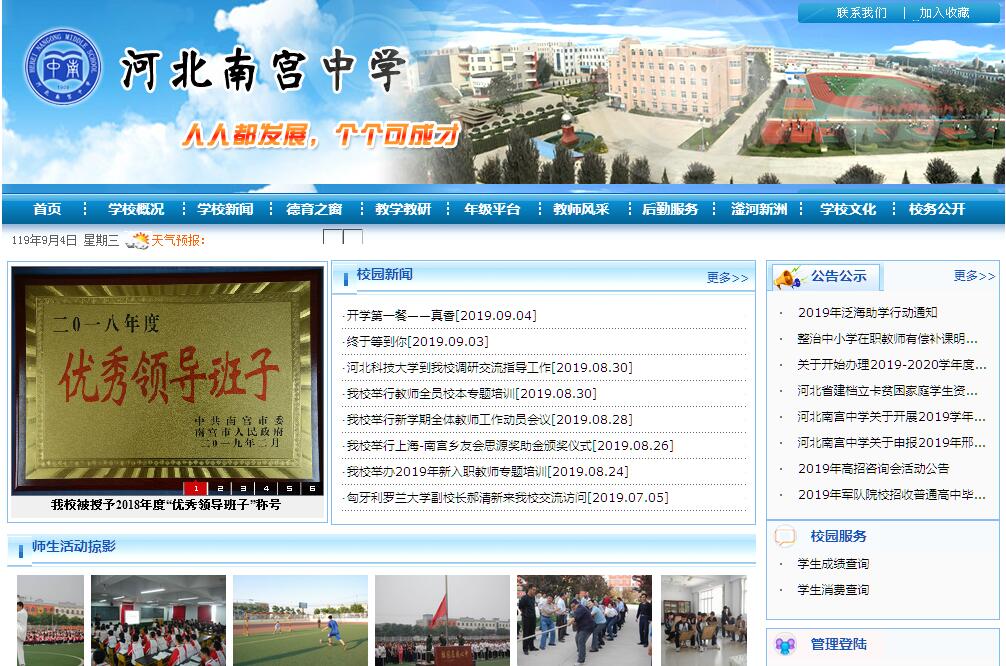 河北南宮中學(xué),位于歷史名城、冀南紅都南宮市,發(fā)軔于明成化十七年,成立于1909年,是冀南地區(qū)創(chuàng)辦最早的中學(xué)。1984年被省教育廳批準(zhǔn)為首批辦好重點(diǎn)中學(xué),2001年被省教育廳命名為省級(jí)示范性高中,是“中華百年名?!薄叭珖偎罹咛厣袑W(xué)”。河北南宮中學(xué)歷經(jīng)百年滄桑,孕育和積淀了厚重的校園文化。校園內(nèi)的重修南宮縣學(xué)記碑由清代桐城派學(xué)者、著名教育家、書法家張?jiān)a撟牟?。其文興國圖強(qiáng)之意溢表,遠(yuǎn)見卓識(shí)啟今遞世。其書入古出新,創(chuàng)一代書體。學(xué)校創(chuàng)始人齊福丕先生“茍欲竟存世界,釋教育無可為”的思想至今熠熠生輝。河北南宮中學(xué)的發(fā)展史是一部自強(qiáng)不息、艱苦卓絕的奮斗史。南中人始終堅(jiān)守對(duì)民族的責(zé)任,對(duì)文明的追求,不忘初心,薪火相傳,創(chuàng)造了學(xué)校發(fā)展史上一個(gè)個(gè)嘆為觀止的奇跡。學(xué)校現(xiàn)已發(fā)展成為一所擁有兩個(gè)校區(qū),占地16.3萬平方米,建筑面積10.5萬平方米,兩個(gè)學(xué)部,161個(gè)教學(xué)班,776名教職工,1萬余名在校生的現(xiàn)代化中學(xué)。河北南宮中學(xué)以治學(xué)嚴(yán)謹(jǐn)、管理規(guī)范而著稱,以“制度+規(guī)范”規(guī)范行為,以“評(píng)估+激勵(lì)”保證落實(shí),在嚴(yán)謹(jǐn)?shù)倪^程控制中創(chuàng)造完美,在規(guī)范的管理過程中實(shí)現(xiàn)目標(biāo),創(chuàng)造了獨(dú)特的管理思想和管理模式。特別是近年來,學(xué)校在“為學(xué)生終身發(fā)展奠基,為教師職業(yè)幸福服務(wù),為民族和諧進(jìn)步育人”教育理念的引領(lǐng)下,確立了“名校有突破、重點(diǎn)有增長、小科有發(fā)展、整體有提高”的辦學(xué)目標(biāo),實(shí)行多元啟智、階梯引領(lǐng)、自主發(fā)展、優(yōu)長育人,堅(jiān)持常規(guī)管理出效益、創(chuàng)新促發(fā)展,實(shí)現(xiàn)了低進(jìn)優(yōu)出、優(yōu)進(jìn)精出,教育教學(xué)質(zhì)量逐年攀升,高考成績連續(xù)二十多年在邢臺(tái)市名列前茅,受到同行的廣泛關(guān)注和各級(jí)各界的普遍贊譽(yù)。2017年高考,本一上線1348人,上線率41.94%;本科二批以上上線2937人,上線率91.38%,上線人數(shù)和上線率均名列邢臺(tái)各縣市重點(diǎn)中學(xué)第一名;有3名同學(xué)成績躋身全市理工類前10名;繼2016年劉青之后,師博再次榮獲邢臺(tái)市理科狀元,并被清華大學(xué)錄取。目前,學(xué)校正以科學(xué)發(fā)展觀為指導(dǎo),繼往開來,固本開新,為建設(shè)現(xiàn)代化、高水平、有特色的示范性高中而努力奮斗。