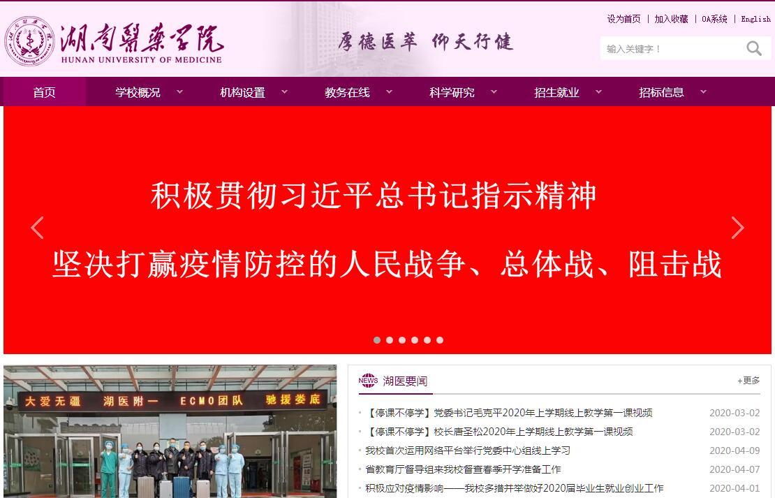 湖南醫(yī)藥學(xué)院是一所國家公辦的全日制普通醫(yī)學(xué)本科院校。學(xué)校肇始于1912年,前身為留美歸國華僑、著名醫(yī)學(xué)教育家顏福慶先生創(chuàng)立的長沙紅十字會(huì)看護(hù)訓(xùn)練所,1924年正式建立長沙仁術(shù)護(hù)病學(xué)校。1961年從長沙遷到安江建立黔陽地區(qū)衛(wèi)生學(xué)校,1984年搬遷至懷化并更名為懷化地區(qū)衛(wèi)生學(xué)校。2000年3月,升格為懷化醫(yī)學(xué)高等??茖W(xué)校。2014年5月,經(jīng)教育部批準(zhǔn)升格并更名為湖南醫(yī)藥學(xué)院。學(xué)校占地面積1418畝,校舍建筑面積26.8萬平方米,在校全日制大學(xué)生8995人,其中本科生4381人,面向全國26個(gè)?。ㄊ?、自治區(qū))招生。現(xiàn)有教學(xué)科研儀器設(shè)備總值6453.0萬元,圖書館館藏紙質(zhì)圖書72.5萬冊,中外文紙質(zhì)期刊708種,電子期刊70萬冊。學(xué)校設(shè)有醫(yī)學(xué)院、口腔醫(yī)學(xué)院、護(hù)理學(xué)院、藥學(xué)院、檢驗(yàn)醫(yī)學(xué)院、康復(fù)醫(yī)學(xué)與保健學(xué)院、馬克思主義學(xué)院(人文社科與管理學(xué)院)、繼續(xù)教育學(xué)院、第一臨床學(xué)院和公共課部等二級(jí)教育教學(xué)機(jī)構(gòu)10個(gè),有臨床技能實(shí)訓(xùn)中心、藥學(xué)實(shí)驗(yàn)中心、醫(yī)學(xué)檢驗(yàn)實(shí)驗(yàn)中心、口腔實(shí)訓(xùn)中心、影像實(shí)訓(xùn)中心、針灸推拿康復(fù)實(shí)訓(xùn)中心、美容實(shí)訓(xùn)中心、人體機(jī)能實(shí)驗(yàn)室、醫(yī)學(xué)形態(tài)實(shí)驗(yàn)室、理化實(shí)驗(yàn)中心、計(jì)算機(jī)實(shí)驗(yàn)中心等實(shí)驗(yàn)實(shí)訓(xùn)平臺(tái)11個(gè)。學(xué)校是國家執(zhí)業(yè)醫(yī)師臨床類別實(shí)踐技能考試基地,有國家三級(jí)甲等綜合性直屬型附屬醫(yī)院(臨床學(xué)院)1所、非直屬附屬醫(yī)院(臨床學(xué)院)7所、實(shí)習(xí)基地96個(gè)。直屬型附屬醫(yī)院占地面積17.9萬平方米,編制病床1200張,有心血管內(nèi)科、呼吸內(nèi)科、護(hù)理學(xué)等三個(gè)省級(jí)臨床重建設(shè)點(diǎn)??疲菄宜幬锱R床試驗(yàn)基地和湖南省慢阻肺同質(zhì)化培訓(xùn)基地。非直屬附屬醫(yī)院包括國家三級(jí)甲等綜合醫(yī)院5所、國家三級(jí)甲等中醫(yī)醫(yī)院1所和國家三級(jí)??漆t(yī)院1所,編制床位10400張。學(xué)校有湖南省重點(diǎn)實(shí)驗(yàn)室(侗醫(yī)藥研究)1個(gè),懷化市重點(diǎn)實(shí)驗(yàn)室5個(gè)(呼吸疾病研究、中醫(yī)康復(fù)技術(shù)研究、武陵山道地藥材前藥篩選與應(yīng)用、腦與神經(jīng)內(nèi)分泌和侗醫(yī)藥研究),有校級(jí)科研機(jī)構(gòu)和平臺(tái)5個(gè)(生物醫(yī)學(xué)研究中心、民族醫(yī)藥研究中心、骨科研究所、呼吸與危重癥研究所和微創(chuàng)外科中心)。學(xué)?,F(xiàn)有教師603人,其中專任教師553人。有教授等正高職稱教師70人,有副教授等副高級(jí)職稱教師173人,具有博士、碩士學(xué)位教師295人,其中博士30人;享受政府特殊津貼專家2人,博士生導(dǎo)師1人、碩士生導(dǎo)師5人,省級(jí)教學(xué)團(tuán)隊(duì)1個(gè)、省級(jí)學(xué)科帶頭人1人、省級(jí)教學(xué)名師1人、省級(jí)青年骨干教師17人,省級(jí)教學(xué)奉獻(xiàn)獎(jiǎng)獲得者1人、省級(jí)優(yōu)秀教師1人。學(xué)?,F(xiàn)有醫(yī)學(xué)、管理學(xué)2個(gè)學(xué)科門類,開設(shè)臨床醫(yī)學(xué)、護(hù)理學(xué)、藥學(xué)、醫(yī)學(xué)檢驗(yàn)技術(shù)、醫(yī)學(xué)影像技術(shù)、針灸推拿學(xué)等12個(gè)本科專業(yè)。有省級(jí)重點(diǎn)專業(yè)1個(gè),省級(jí)特色專業(yè)2個(gè),省級(jí)專業(yè)綜合改革試點(diǎn)專業(yè)2個(gè),國家資源共享(精品)課程1門,省級(jí)精品課程5門。辦學(xué)94年來,學(xué)校為懷化周邊及武陵山片區(qū)縣鄉(xiāng)基層醫(yī)療機(jī)構(gòu)培養(yǎng)了近4萬名下得去、留得住、用得好的應(yīng)用型高素質(zhì)醫(yī)衛(wèi)人才。近年來,學(xué)校先后獲得“全國衛(wèi)生系統(tǒng)先進(jìn)單位”“全國學(xué)籍管理先進(jìn)單位”“全國五四紅旗團(tuán)委”“湖南省文明標(biāo)兵單位”“湖南省就業(yè)創(chuàng)業(yè)示范?!薄昂鲜?shí)踐教學(xué)管理先進(jìn)單位”等榮譽(yù)。