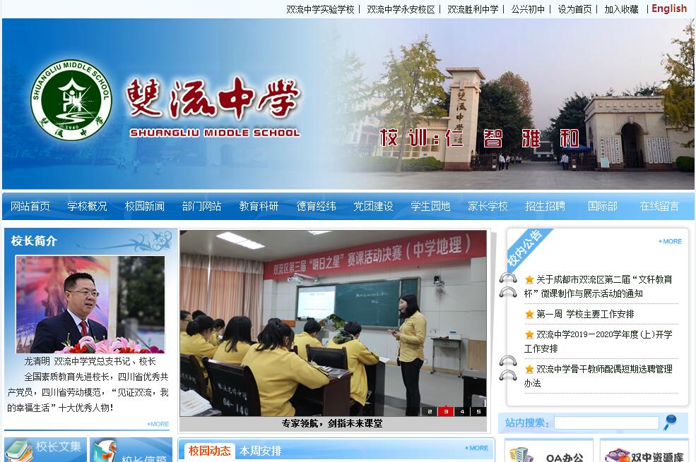 四川省雙流中學(xué)具有悠久的辦學(xué)歷史、豐富的辦學(xué)經(jīng)驗(yàn)。1940年由時(shí)任四川省監(jiān)理主席蔣中正先生批建,國民黨元老于右任先生題寫校名;原國民黨軍事委員會(huì)副委員長、愛國將領(lǐng)馮玉祥曾在此作抗日動(dòng)員演講,并向青年學(xué)生面贈(zèng)《學(xué)生救國問答》一書。1996年成為省級(jí)重點(diǎn)中學(xué),2002年成為國家級(jí)示范校,2009年,“四川省雙流中學(xué)教育集團(tuán)”成立。2013年,成為首批“四川省一級(jí)示范性普通高中”。2016年,成為成都市首批領(lǐng)航高中項(xiàng)目學(xué)校。四川省雙流中學(xué)有優(yōu)異的辦學(xué)業(yè)績。近年來,雙中共為國內(nèi)外高校輸送合格新生20000余名,其中為清華、北大、復(fù)旦、人大等一流學(xué)府輸送新生1800余名,上本科線人數(shù)年年超過千人,位居成都市同類學(xué)校前茅,培養(yǎng)出省、市、縣高考冠軍17名。四川省雙流中學(xué)具有優(yōu)美的校園環(huán)境、溫馨高雅的校園文化、現(xiàn)代化的教學(xué)設(shè)施。目前,學(xué)校占地130余畝,建筑面積79587.6平方米,8跑道400米塑膠運(yùn)動(dòng)場1個(gè),圖書館面積1192 平方米,藏書126132冊,多功能活動(dòng)廳2992 平方米,實(shí)驗(yàn)室及功能室面積6000余平方米。教室80間,每間教室均配備電子白板及多媒體系統(tǒng),有高規(guī)格的學(xué)生公寓和學(xué)生食堂。四川省雙流中學(xué)現(xiàn)有在校學(xué)生3500人,70余個(gè)教學(xué)班,在職教職工381人,其中:全國優(yōu)秀教師1人,省優(yōu)秀教師4 人,特級(jí)教師(校長)7人,高級(jí)教師200多人,各級(jí)各類名師200余人。根據(jù)學(xué)校文化頂層設(shè)計(jì),為實(shí)現(xiàn)育人目標(biāo),學(xué)校提出打造“精英教育”特色品牌,建設(shè)符合雙中育人目標(biāo)的“一個(gè)目標(biāo)、二元導(dǎo)學(xué)、三分課堂、四類課程”特色課程體系?!耙粋€(gè)目標(biāo)”,讓課程更好地服務(wù)于學(xué)生成長。通過國家課程校本化,校本課程多元化,培養(yǎng)學(xué)生的精英意識(shí),讓學(xué)生最終成長為具有意志力、領(lǐng)導(dǎo)力、記憶力、領(lǐng)悟力、想象力和創(chuàng)造力的社會(huì)精英?!岸獙?dǎo)學(xué)”,以課堂為陣地,提高教師教學(xué)針對性——目標(biāo)、活動(dòng)、評價(jià),增強(qiáng)學(xué)生學(xué)習(xí)參與度——預(yù)習(xí)、互動(dòng)、訓(xùn)練。學(xué)生不但學(xué)有目標(biāo),學(xué)有路徑,學(xué)有方法,學(xué)有信心,而且最終實(shí)現(xiàn)老師“魚漁雙授”,學(xué)生“魚漁雙收”的目的?!叭终n堂”,分層設(shè)班、分類走班、分疑網(wǎng)班。全校各年級(jí)實(shí)施走班制教學(xué)(分層設(shè)班和分類走班);構(gòu)建好分疑網(wǎng)班平臺(tái)(學(xué)校自主開發(fā),現(xiàn)已上傳300多個(gè)微課課件),真正做到提高教師教學(xué)的針對性,增強(qiáng)學(xué)生學(xué)習(xí)的參與度?!八念愓n程”,統(tǒng)籌國家、地方、學(xué)校三級(jí)課程,構(gòu)建學(xué)校以“修身立德(仁)”“認(rèn)知素養(yǎng)(智)”“氣質(zhì)涵養(yǎng)(雅)”“和諧共融(和)”為中心的課程體系。學(xué)校可供學(xué)生選擇的校本課程有100多門。學(xué)校還將繼續(xù)開發(fā)優(yōu)秀校本課程,通過專家審核,確定為校本必修課程??傊?,通過國家課程校本化,校本課程多元化,培養(yǎng)學(xué)生的精英意識(shí),讓學(xué)生最終成長為具有意志力、領(lǐng)導(dǎo)力、記憶力、領(lǐng)悟力、想象力和創(chuàng)造力的社會(huì)精英。憑借扎實(shí)的教學(xué)功底、穩(wěn)健的教學(xué)風(fēng)格和突出的教學(xué)成績,四川省雙流中學(xué)獲得了家長的肯定和各級(jí)教育部門的高度認(rèn)可。四川省雙流中學(xué)先后榮獲中國百強(qiáng)中學(xué)、全國基礎(chǔ)教育名校、國家級(jí)體育傳統(tǒng)項(xiàng)目學(xué)校、建國六十周年四川省十大名牌院校、中國師德建設(shè)示范單位、21世紀(jì)中國素質(zhì)教育先進(jìn)示范學(xué)校、全國學(xué)校文化建設(shè)金獎(jiǎng)單位、中國西部名校、全國巾幗文明崗、全國群眾體育先進(jìn)單位、全國優(yōu)秀傳統(tǒng)文化進(jìn)校園項(xiàng)目試點(diǎn)學(xué)校、四川省校本研修示范學(xué)校、成都市教師發(fā)展基地學(xué)校等殊榮。由于在普通高中教育教學(xué)工作中成績突出,連續(xù)幾年被成都市教育局評為“優(yōu)秀學(xué)?!?。在校訓(xùn)“仁”、“智”、“雅”、“和”的引領(lǐng)下,四川省雙流中學(xué)實(shí)行“二元導(dǎo)學(xué)”,致力于“雙商教育”。同時(shí),根據(jù)國家要求、雙中特色和學(xué)生需求穩(wěn)步推進(jìn)新課改,不斷地加強(qiáng)課程建設(shè)。為了讓每一個(gè)孩子更全面地發(fā)展,四川省雙流中學(xué)先后開設(shè)了“職業(yè)生涯規(guī)劃”、“日語”、“小吃制作”、“《紅樓夢》欣賞”、“茶藝”、“笛簫吹奏”等上百門精品選修課程,同時(shí)還組織了舞蹈社、話劇社、漢服社、動(dòng)漫社等各具特色的社團(tuán)。近年來,四川省雙流中學(xué)本科上線率、一本上線率節(jié)節(jié)攀升,同時(shí)藝體教育齊頭并進(jìn)。為了實(shí)現(xiàn)德智體美全面發(fā)展的育人目標(biāo),四川省雙流