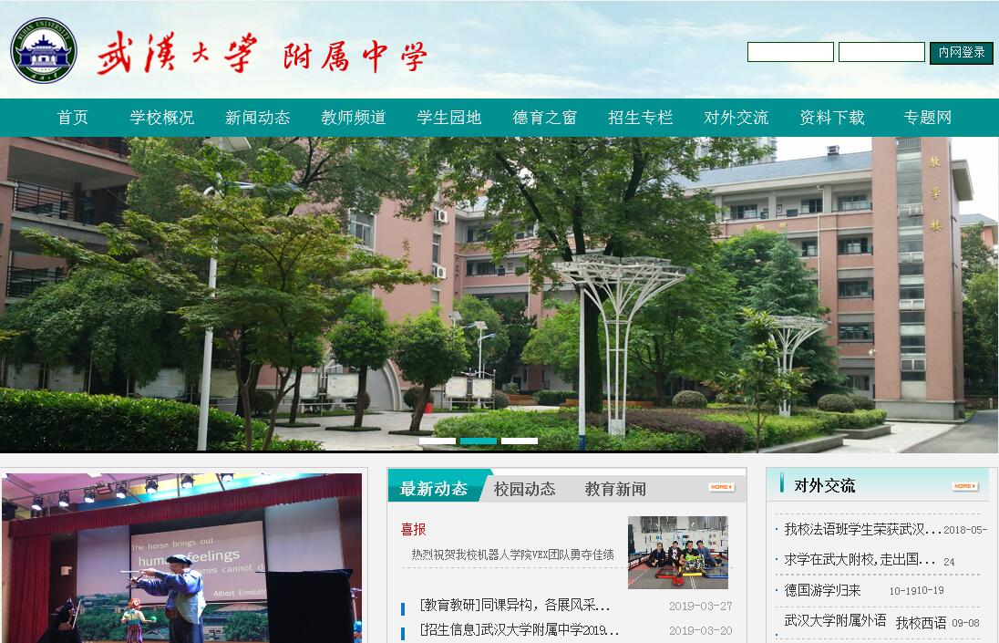 武漢大學(xué)附屬中學(xué)的校址在武漢市武昌區(qū)風(fēng)景秀麗的珞珈山南麓,在中外聞名、歷史悠久的高等學(xué)府——武漢大學(xué)校園內(nèi)。武大附中的前身是1916年4月建立的國立武昌高師附中。據(jù)《武漢大學(xué)校史一覽》記載:“民國五年四月,國立武昌高師始設(shè)附中,校址在武昌南路小學(xué)?!蔽洳下芳次洳几?,南路小學(xué)校址即今武昌區(qū)潭秋中學(xué)。1918年2月,附中校舍發(fā)生火災(zāi)。以后附中校址幾經(jīng)變遷,最后搬到武昌曹家巷(現(xiàn)武昌彭劉楊路7435工廠廠區(qū)內(nèi))。1923年9月,武昌高師附中改名為國立武昌師范大學(xué)附中,1924年9月,改名為國立武昌大學(xué)附中,1926年12月改名為國立武昌中山大學(xué)附中。1932年國立武漢大學(xué)從武昌閱馬廠東廠口遷到珞珈山后,于1935年7月在珞珈山南麓的“庚子烈士紀(jì)念館”(即現(xiàn)在的武大附小舊樓)創(chuàng)辦了新的武大附中,取名為私立武昌東湖中學(xué),董事長為武漢大學(xué)校長周鯁生先生。1938年春天,日寇逼進(jìn)武漢,武漢大學(xué)西遷四川樂山。1941年秋,武大在四川樂山銅河碥續(xù)辦武大附中,校名改為國立武漢大學(xué)附設(shè)珞嘉中學(xué)。1946年10月,武大附中隨武大遷回武昌,原樂山的武大珞嘉中學(xué)由武大畢業(yè)的樂山籍教師接辦。武大附中遷回武昌珞珈山后,仍用原"武昌東湖中學(xué)"的校名,于1947年秋季恢復(fù)上課,校址先在武大工學(xué)院(今武大行政大樓右側(cè)),后搬回東湖中學(xué)舊址(今武大附?。?。東湖中學(xué)仍冠名“私立”二字,董事長為張難先先生。武漢解放后,武大附中仍叫武昌東湖中學(xué),一直辦到1951年年底,1952年與武昌博文中學(xué)合并,改為省立武昌二中(今武漢市第15中學(xué))。1958年7月,由武漢大學(xué)數(shù)學(xué)系團(tuán)總支倡議,經(jīng)武漢大學(xué)黨委批準(zhǔn),恢復(fù)武大附中,取名為武漢大學(xué)附屬共青團(tuán)中學(xué)。1959年8月,經(jīng)武漢大學(xué)與武漢市教育局協(xié)商,武漢大學(xué)附屬共青團(tuán)中學(xué)與武漢市第14中學(xué)合并,定名為武漢大學(xué)附屬中學(xué),校址在武昌曇華林。武漢大學(xué)校長李達(dá)、副校長何定華等均參加了兩校合并成立新的武大附中的隆重典禮,并發(fā)表了講話。1963年7月,因貫徹“調(diào)整、鞏固、充實、提高”的八字方針,武大附中的歸屬由武漢大學(xué)劃歸武漢市,武大附中又改名為武漢市第14中學(xué)。1970年2月,武大決定在武大附小的基礎(chǔ)上設(shè)立武大附小初中班。1972年5月,武大附小及武大附小初中班改為武漢大學(xué)附屬學(xué)校,分設(shè)小學(xué)部、中學(xué)部。寧錦元任武大附校革委會主任,后革委會撤消,葉欽桂任武大附校校長。1980年4月,武大附校的中、小學(xué)部分開設(shè)立,中學(xué)部改為武漢大學(xué)附屬中學(xué),葉欽桂任校長。1993年5月,經(jīng)武漢市教委批準(zhǔn),武大附中與武漢大學(xué)外語學(xué)院聯(lián)合創(chuàng)辦武漢大學(xué)附屬外語學(xué)校該校與武大附中合署辦公,實行一套班子,兩塊牌子。武大外語學(xué)校從1993年起初中單獨(dú)招生,高中招生參加全市統(tǒng)一考試。2000年8月,武漢大學(xué)與武漢水電大學(xué)、武漢測繪科技大學(xué)、湖北醫(yī)科大學(xué)合并,組建了新的武漢大學(xué)。因此,2001年2月,武大附中與原武漢水電大附中、原武漢測繪附中合并,組建了新的武大附中。武大附中不僅歷史悠久,而且富有光榮的革命傳統(tǒng)。董必武、陳潭秋等老一輩無產(chǎn)階級革命家都曾在這所學(xué)校里開展革命活動。陳潭秋的夫人徐全直烈士(1927年在南京雨花臺被害)曾兼任武昌師大附中、附小的校長。伍修權(quán)于1924年至1925年在武昌師大附中讀書,然后從這里投身革命。1924年9月,武昌師大附中建立社會主義青年團(tuán)支部,伍修權(quán)任團(tuán)支部書記。武大附中在80余年的漫長歲月中,積累了豐富的辦學(xué)經(jīng)驗,為國家培養(yǎng)了大批人才。著名的軍事家、外交家伍修權(quán)(武昌師大附中學(xué)生),著名的化學(xué)家、中科院院士、武大化學(xué)學(xué)院博士導(dǎo)師查全性教授(抗戰(zhàn)初期東湖中學(xué)學(xué)生),著名的物理學(xué)家、中科院院士、中科院物理所博士導(dǎo)師李林研究員(李四光之女、東湖中學(xué)學(xué)生),著名的核物理專家、中科院院士、秦山核電站總工程師歐陽予教授(樂山武大附中學(xué)生),著名的物理學(xué)家、中科院院士、武大生命科學(xué)院博士導(dǎo)師楊弘遠(yuǎn)教授(新中國成立前后東湖中學(xué)學(xué)生),是武大附中老校友中的杰出代表。