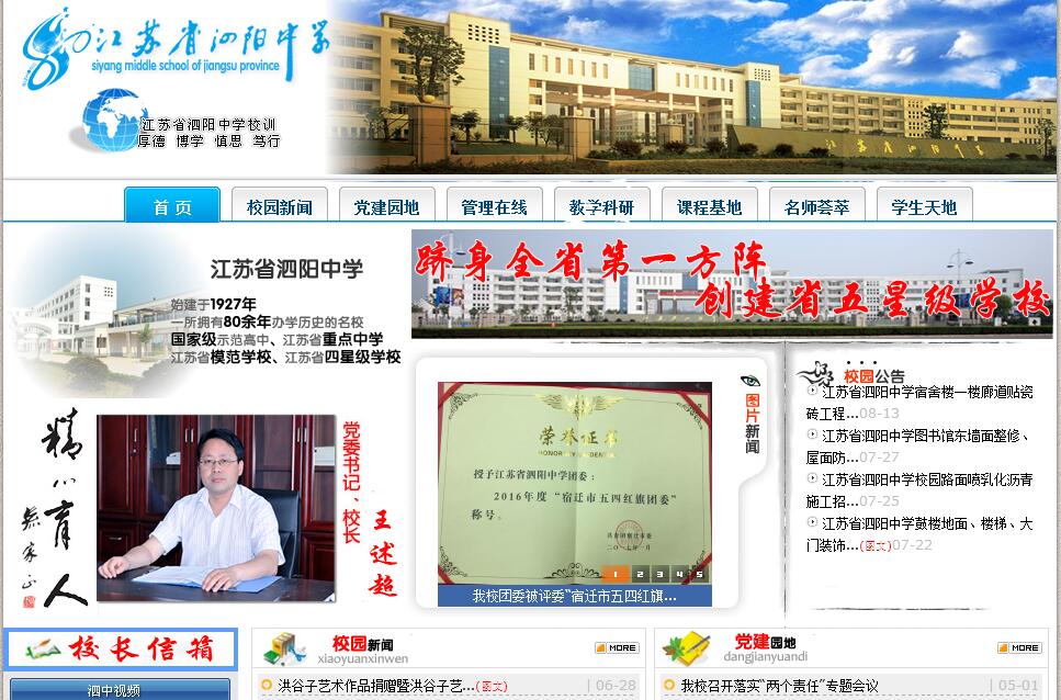 | 網站簡介: 江蘇省泗陽中學(Siyang High School)創(chuàng)建于1927年,該校是江蘇省重點中學、江蘇省模范中學、全國先進體育傳統(tǒng)基礎學校。1999年1月,經省教委批準,更名為“江蘇省泗陽中學”。1999年7月,與南京師范大學簽訂聯(lián)合辦學協(xié)議,成為“南京師范大學泗陽實驗中學”;2001年4月,順利通過國家級示范高中驗收;2004年,被省教育廳轉評為江蘇省首批四星級中學;2014年,順利通過江蘇省四星級中學復審。 |