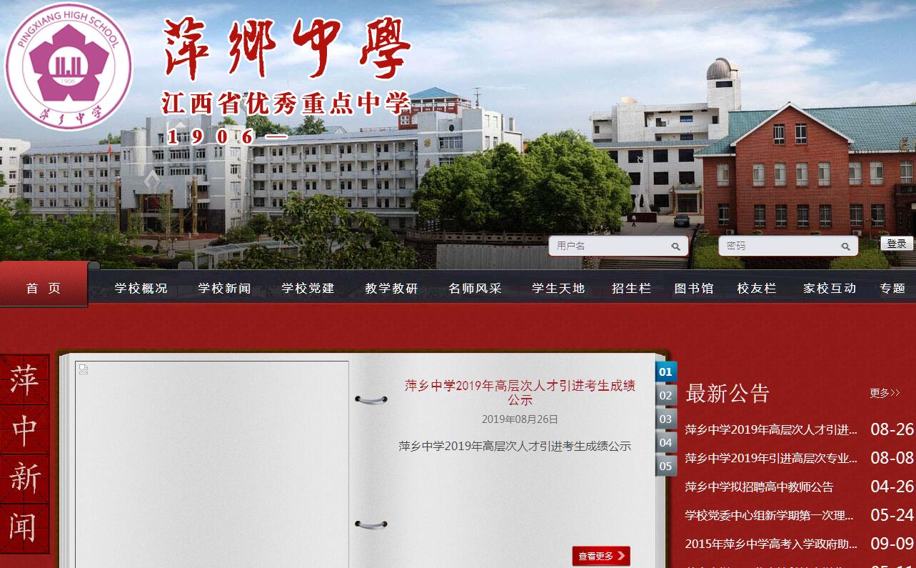 萍鄉(xiāng)中學(xué),江西省優(yōu)秀重點(diǎn)中學(xué),前身為明萬歷年間的鰲洲書院,1902年興新學(xué),由清末翰林文廷式倡導(dǎo),改制為“萍鄉(xiāng)學(xué)堂”,1906年更名為“萍鄉(xiāng)中學(xué)堂”,系我國創(chuàng)辦最早的現(xiàn)代公立學(xué)校之一,也是全國最早的具有保送資格的九所中學(xué)之一。她歷史悠久,積淀深厚,素有“贛西文化保壘,淥水知識搖籃”之美譽(yù),1963年列為江西省首批重點(diǎn)中學(xué),1991年錄入《中國中學(xué)名?!?,1995年被授予江西省“優(yōu)秀重點(diǎn)中學(xué)”稱號。學(xué)校先后獲得“全國現(xiàn)代教育技術(shù)實(shí)驗(yàn)學(xué)?!薄ⅰ叭珖瀼貙W(xué)校體育工作條例優(yōu)秀學(xué)?!?、“國家體育傳統(tǒng)項(xiàng)目學(xué)校”、“江西省文明單位”、“江西省現(xiàn)代教育技術(shù)示范學(xué)?!薄ⅰ敖鹘逃蒲谢亍?、“江西省綠色學(xué)?!?、“江西省安全文明學(xué)?!?、“江西省中小學(xué)和諧校園”等60多項(xiàng)省級以上榮譽(yù)。百年來,學(xué)校培養(yǎng)出了包括4名兩院院士和36名具有少將以上軍銜的將軍在內(nèi)的五萬余名優(yōu)秀學(xué)子,他們遍布五洲四海、大江兩岸。期中,有彪炳青史的革命志士:黃鐘杰、羅運(yùn)磷、鄧貞謙、張國庶、王麓水等;有在中國現(xiàn)代史上頗有影響的張國燾、陳洪時、蔡孟堅等;有科學(xué)界精英:著名物理化學(xué)家、學(xué)部委員(院士)吳學(xué)周,自然地理學(xué)、地圖學(xué)、遙感應(yīng)用和地理信息系統(tǒng)專家、院士陳述彭,光纖通訊專家、院士簡水生,中國工程院院士、水稻專家顏龍安,新中國第一代航天科學(xué)家李宜敏,核工業(yè)建筑專家李日余,小麥育種專家彭啟良,生命科學(xué)領(lǐng)域成績斐然的年青博導(dǎo)昌增益等;有政績卓然的黨政軍領(lǐng)導(dǎo):原中宣部副部長凱豐,新中國第一任海關(guān)總署署長、原中央調(diào)查部部長孔原,原農(nóng)墾部副部長劉型,原國家教委副主任、總督學(xué)柳斌,原昆明陸軍學(xué)院院長、少將鄧福全等;有新中國高教事業(yè)的開拓者:彭康、喻德淵、孫德倫以及知名高校的校級領(lǐng)導(dǎo)林增平、胡國根、楊展如等;有教育、文化、藝術(shù)、體育等領(lǐng)域的杰出人物:心理學(xué)專家、博導(dǎo)楊鑫輝,詩學(xué)專家、博導(dǎo)陳良運(yùn),作家、劇作家中杰英,二胡演奏家、作曲家黃海懷,音樂家、教授劉天浪,美術(shù)家、博導(dǎo)鐘涵,運(yùn)動健將李大培、肖志蕓、王達(dá)人、歐陽固等。學(xué)校現(xiàn)占地320畝,環(huán)境優(yōu)雅,布局合理,規(guī)劃科學(xué)。文化景觀錯落有致,古樟翠柏遮天蔽日,處處曲徑通幽,四季鳥語花香,人文校園、生態(tài)校園的理念隨處可見?,F(xiàn)有56個教學(xué)班,學(xué)生3000余人,在職教職員工282人,其中,特級教師4人,高級教師112人,省部級勞模5人,省級學(xué)科帶頭人8人,國家級骨干教師5人,省級骨干教師35人,研究生66人。學(xué)校設(shè)施完備,已經(jīng)達(dá)到國家高級中學(xué)一類裝備標(biāo)準(zhǔn),現(xiàn)代教育技術(shù)已廣泛使用。有裝備一流的教學(xué)大樓,高標(biāo)準(zhǔn)的實(shí)驗(yàn)室,也有集電教、信息、圖書閱覽于一體科技館,還有一流的多功能報告廳、電子備課室、電子閱覽室、全數(shù)字語音室、塑膠田徑場,還有獨(dú)立的美術(shù)、音樂大樓、體藝館。天文觀測臺,校園信息中心、電化教學(xué)雙向控制系統(tǒng)等現(xiàn)代化設(shè)備也應(yīng)有盡有,這些一流的軟硬件設(shè)備為學(xué)生的騰飛提供了可靠的保障。百年萍中始終堅持正確的辦學(xué)方向,全面貫徹教育方針,全面實(shí)施素質(zhì)教育,大力倡導(dǎo)教育科研,堅持不懈地開展教育改革,教育質(zhì)量和辦學(xué)水平不斷提高。學(xué)校高考成績長盛不衰,歷年來穩(wěn)居全市第一,全省前茅,培養(yǎng)了眾多北大、清華學(xué)子及少年大學(xué)生,2009年馬毅鵬同學(xué)被保送到清華大學(xué),2010年熊緯佳同學(xué)以649分榮奪全市理科狀元并被清華大學(xué)錄取。近幾年來,通過改革選拔培養(yǎng)辦法、聘請外地專家講座、組織學(xué)生進(jìn)清華北大實(shí)驗(yàn)室、赴日訪問交流等,學(xué)校學(xué)科競賽碩果累累,在各類國家奧林匹克競賽中屢有斬獲,現(xiàn)已有180多名學(xué)生獲國家三等獎以上獎勵。僅2009年,學(xué)校就有楊正偉等34名學(xué)生獲高中應(yīng)用物理競賽、理化生及信息學(xué)奧賽國家一、二、三等獎;熊緯佳等30名同學(xué)在全國英語能力、聽力競賽中獲一、二、三等獎;韓穎、胡濱洋、張?zhí)燹葏⒓咏魇∮⒄Z聽說能力電視大獎賽,獲團(tuán)體一等獎。尤其是青少年信息學(xué)已成為省內(nèi)領(lǐng)先學(xué)科,繼2006年2名同學(xué)、2007年3名同學(xué)獲全國一等獎后,2008年有馬毅鵬、盧震鵬、王天一、李毅堅四位同學(xué)獲全國信息學(xué)奧林匹克競賽一等獎;2009年又有盧震鵬、楊雙睿同學(xué)獲全國信息學(xué)奧林匹克競賽國家級(賽區(qū))一等獎,其中盧震鵬同學(xué)還入選了信息學(xué)奧林匹克競賽國家冬令營……學(xué)校特色活動獨(dú)樹一幟,率先在江西中小學(xué)中開展無線電測向運(yùn)動,成為北京市外唯一一所“青少年科技俱樂部基地”的學(xué)?!@里的學(xué)生,在世界