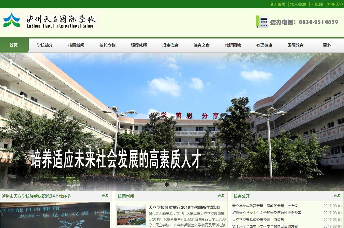 瀘州市天立學(xué)校創(chuàng)辦于2002年,地處瀘州市城北新區(qū),集初中、高中為一體,屬股份制民辦學(xué)校,實行董事會領(lǐng)導(dǎo)下的校長負責(zé)制。瀘州天立學(xué)校是瀘州市教育局直屬學(xué)校,受瀘州市龍馬潭區(qū)政府委托管理瀘州十六中,是龍馬潭區(qū)教育局直屬學(xué)校。辦學(xué)十三年以來,學(xué)校深入踐行“涵養(yǎng)個性,立己達人”的辦學(xué)理念和“四個學(xué)會”的育人理念,致力于培養(yǎng)具有國際視野和創(chuàng)造能力的現(xiàn)代人,搭建了“一體兩翼”的個性化發(fā)展新架構(gòu)(“一體”是以高初中課程為主體,為培養(yǎng)拔尖創(chuàng)新人才夯實基礎(chǔ)?!皟梢怼笔窃诟咧虚_設(shè)國際課程,舉辦出國留學(xué)直通班;開設(shè)藝體教育課程,促進學(xué)生多元化發(fā)展),高中重本升學(xué)率突破60%,初中國示高中率突破70%(中考成績達到省一級示范性普通高中比例),20名學(xué)生直接考入北京大學(xué)、清華大學(xué)、香港大學(xué)和香港中文大學(xué),每年有20余名藝體尖子考入中央美術(shù)學(xué)院、北京電影學(xué)院、中國傳媒大學(xué)、上海戲劇學(xué)院等名校,近年來近百名學(xué)生進入歐美及澳洲名校深造。學(xué)校高度重視文化建設(shè),孕育了“海納百川,追求卓越”的校訓(xùn)、“向善向上,惟精惟一”的校風(fēng)、“創(chuàng)造、求真、奉獻”的教風(fēng)和“樂學(xué)、善思、分享”的學(xué)風(fēng),先后獲得全國民辦教育先進集體、首屆中國當(dāng)代特色學(xué)校、全國特色教育示范單位、全國傳統(tǒng)體育項目示范學(xué)校、全國家長學(xué)校實驗基地、中國基礎(chǔ)英語教育實驗示范基地、意大利藝術(shù)留學(xué)預(yù)科研究優(yōu)質(zhì)生源基地、四川省陽光體育示范學(xué)校、四川省合格高完中、四川省藝術(shù)教育特色學(xué)校、四川省實驗教學(xué)示范學(xué)校、四川省現(xiàn)代教育示范學(xué)校、四川省青少年科技教育示范學(xué)校、四川省示范家長學(xué)校、四川省消防教育示范學(xué)校、四川省示范性標(biāo)準(zhǔn)化學(xué)生食堂、瀘州市建設(shè)川滇黔渝結(jié)合部教育培訓(xùn)中心骨干學(xué)校、瀘州市中小學(xué)教學(xué)結(jié)構(gòu)改革先進學(xué)校稱號,連續(xù)十年榮獲瀘州市普通高中素質(zhì)教育綜合評價一等獎。瀘州市天立學(xué)校在深化課程設(shè)置、改革辦學(xué)體制、建立評價體系、創(chuàng)新人才培養(yǎng)方式、立德樹人等方面形成了鮮明的辦學(xué)特色,促成了神州天立教育集團的誕生,天立教育正向全川乃至全國快速輻射。面向未來,瀘州市天立學(xué)校正以“三課一評”(課程、課堂、課題和激勵評價機制)為戰(zhàn)略主題,以“三創(chuàng)一培”(創(chuàng)建、創(chuàng)業(yè)、創(chuàng)新和培尖)搶抓發(fā)展機遇,迎接挑戰(zhàn),苦練內(nèi)功,高位求進,書寫更加燦爛的個性化教育華章!