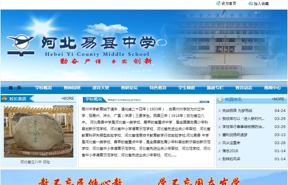 河北易縣中學是河北省一類學校、最早的省重點中學,是全國首批青少年科普創(chuàng)新示范學校、河北省中小學德育示范學校、河北省先進業(yè)余少年軍校、河北省安全防范先進單位、河北省教育科研先導型實驗學校、河北省信息技術教育教學行動實驗學校、河北省示范性高級中學。學校位于河北省易縣城內中心地帶,坐落在狼牙山下、易水河畔、燕下都旁,西接紫荊關、清西陵、荊軻塔,北傍112國道,人杰地靈,交通便利。校園門庭氣派大方,求知花園和生態(tài)園樹木蔥蘢、花草茂美、凳架相連、環(huán)境優(yōu)雅。校區(qū)占地150畝,分三院八區(qū)(南院學生生活區(qū),北院教學區(qū)、辦公區(qū)、閱覽區(qū)、電教實驗區(qū)、體育運動區(qū)、教工住宅區(qū),西院藝術教育小區(qū))。校舍建筑面積42000平方米,有教學樓2棟,可容納100個教學班;有電教實驗樓2棟、圖書館樓1棟、影劇院1座、綜合辦公樓1棟、總務辦公樓1棟、學生公 寓樓4棟、餐廳1座、學生浴池1座、教師住宅樓3棟。學校為全日制20軌制,現有高中三個年級64個教學班,在校生4700余人。從清光緒二十九年(1903年)成立的易州州立中學堂,到民國三年(1914年)改為河北省立第八中學,再到現在,學校已經走過了百年歷程。八中肇始,易縣中學的學生就遍及定興、徐水、新城、滿城、完縣、曲陽、涿縣、房山、束鹿、安平、定縣、新安等地;建國初期,易縣中學更是保定地區(qū)西北四縣的第一所中學。20世紀50年代學校喊出的“寧掉十斤肉,寧減十年壽,全專爭第一,全省爭上游”豪邁誓言,曾經響震全省?,F在,學?;A設施齊全。綜合樓、教學樓、電教實驗樓、圖書館、影劇院、學生公寓、食堂、餐廳、浴室等一應俱全,全塑膠田徑球類運動場有400米塑膠跑道8道、標準籃球場9塊、排球場4塊、羽毛球場10塊,乒乓球館有高標準乒乓球臺8張,臺球館有臺球桌5張,健身房有健身器械20臺件,另有醫(yī)院分診部和學校醫(yī)務室。學生生活、學習、運動、娛樂等設施完善。學校師資力量雄厚。具有一支學歷、職稱、年齡結構合理,素質優(yōu)良的教學管理隊伍。學?,F有專任教師217名,學歷達標率100%,中高級教師占60%,有外籍教師2名、特級教師2名,有國家、省、市三級骨干教師18名,有省市名師、模范班主任和先進德育工作者。縣高中九科兼職教研員全在我校。學校教學設施先進,現代化教學手段已得到廣泛應用。學校建有獨立網站和千兆數據校園網、校園閉路電視網,達到處室有電腦,教室有電視。有學生微機教室和電子閱覽室、多媒體語音教室,有容納2300人的學術報告廳1個、容納400人的多媒體報告廳1個,有電子備課室3個、高標準理化生實驗室10個、多媒體教室35個,圖書館藏書15萬冊。學校還出版??瘍煞N(《易中教改》和《易中團報》),為學生構建了現代化的發(fā)展平臺。學校堅持“以人為本”的教育理念和“從嚴治校、以德育人”的原則,對住校生實行“封閉式”管理,早出操、午自習、晚輔導,班主任全天候陪同學生,檢查午休晚休,指導衛(wèi)生紀律,學生一月集中休息一次,有迅捷良好的交通工具接送他們離返校;對高一新生實行“軍訓”制度和“軍事化”管理,走正步、練軍姿,錘煉他們的意志品質,假期給新生補課,彌補他們的知識缺陷;執(zhí)行年級組長和班主任負責制,在教室前釘掛班主任名牌,便于師生互相監(jiān)督和學生的自我鞭策;開辦學生業(yè)余黨校,發(fā)展學生黨員,為學生的思想進步提供動力;實行學生“值周”制度,組織學生檢查食堂衛(wèi)生、檢查校門出入人員、檢查宿舍衛(wèi)生區(qū)況,進行班級評比,評議先進宿舍和模范班集體,定期公布掛牌。學生參與學校管理,真正實現“全員管理”和“全員育人”。學校校風正,教風嚴,學風濃。教學成績逐年提高,科研興校初見成效。近幾年,學校的教學科研成果獲國家級獎勵17個,省級37個,市級17個;輔導學生參加競賽獲國家級獎勵27個,省級10個,市級20個;學校申報省市教科研課題15個,結題1個,預備結題2個。高考上線率2004年達99%,本科上線率81%。學校先后為國家培養(yǎng)數萬名合格畢業(yè)生,為清華大學、北京大學、復旦大學、浙江大學、中國人民大學、南開大學、北京航天大學等名牌重點大學輸送了大批優(yōu)秀人才。學生在各級競賽中多次獲獎。學校設有完備的獎學助學制度,有優(yōu)秀學生獎學金、特困學生助學金、校友基金,有英才特別獎、校長特別獎,受獎助面高達45%。學校還努力做到為特困學生減免學雜費,并幫助他們聯系希望工程救助和提供勤工助學機會。河北易縣中學一直受到各級領導和專家的關愛。楊成武老將軍和省市領導多次來校視察。著名書法家劉炳森先生為我校學生親筆題寫了“向科學進軍”的匾額,并題寫了校名;著名書法家、被國內外人士譽為硬筆書法第一人的龐中華先生高興地受聘為學校名譽校長,并親筆題寫了“勤奮、嚴謹、務實、創(chuàng)新”的校訓。每年都有許多專家來校講學。著名探險家王邁來校考察講學后揮毫寫下:“燕趙多壯士,易中育英才。”易縣的父老鄉(xiāng)親也稱譽易中為:“棟梁的基地,人才的搖籃。”學校向社會各界鄭重承諾:全校教職員工堅決以羅元發(fā)老將軍題寫的“辦好千秋萬代事,贏得天下父母心”為宗旨,教不忘民傾心教,學不忘國奮發(fā)學,勤奮、嚴謹、務