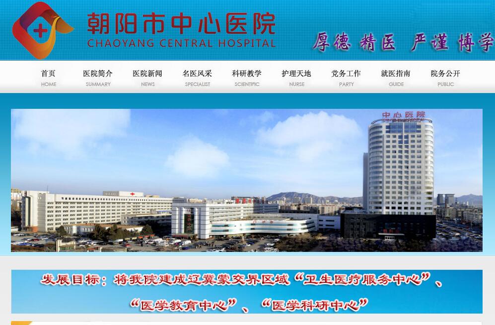 醫(yī)院的前身是1937年成立的土默特右旗醫(yī)院,床位30張;1946年更名為朝陽衛(wèi)生院;解放后更名為朝陽縣衛(wèi)生院;1959年更名為朝陽市醫(yī)院,床位200張;1964年更名為朝陽專區(qū)人民醫(yī)院;1970年更名為朝陽市人民醫(yī)院,床位400張;1974年更名為朝陽地區(qū)人民醫(yī)院,1984年更名為朝陽市第一人民醫(yī)院,床位500張;1993年更名為朝陽市中心醫(yī)院,床位703張;1997年晉升為三級甲等醫(yī)院;2013年床位增至1408張。醫(yī)院連續(xù)三年位列遼寧省三甲醫(yī)院運行與管理排行榜前十名(2014年第10名 2013年第6名 2012年第10名)。2017年,中心醫(yī)院在全省28家市屬三甲醫(yī)院綜合績效考核排名第二位。2018年,中心醫(yī)院在全省29家市屬三甲醫(yī)院綜合績效考核排名第三位。醫(yī)院是國家衛(wèi)健委腦卒中篩查與防治基地和高級卒中中心、國家藥品不良反應(yīng)監(jiān)測哨點醫(yī)院、國家級醫(yī)療器械不良事件監(jiān)測工作哨點單位、國家愛嬰醫(yī)院、國家醫(yī)師資格考試實踐技能(臨床類別)考試基地、國家衛(wèi)健委2015-2017年“進一步改善醫(yī)療服務(wù)行動計劃”改善住院流程示范醫(yī)院、2016改善醫(yī)療服務(wù)示范醫(yī)院、中國醫(yī)師協(xié)會人文愛心醫(yī)院、美國微笑列車定點醫(yī)院、省乳腺癌篩查定點醫(yī)院、朝陽市紅十字會醫(yī)院、朝陽市急救中心、朝陽市牙病防治中心、朝陽市性病防治中心、朝陽市產(chǎn)前篩查診斷中心。同時也是國家級和省級住院醫(yī)師規(guī)范化培訓(xùn)基地、中國醫(yī)科大學(xué)教學(xué)醫(yī)院、中國醫(yī)科大學(xué)省內(nèi)唯一的成人教育教學(xué)基地、錦州醫(yī)科大學(xué)教學(xué)醫(yī)院、承德醫(yī)學(xué)院教學(xué)基地及研究生培養(yǎng)基地、基層衛(wèi)生人員培訓(xùn)基地。醫(yī)院占地面積46000㎡,建筑面積132849㎡。人員編制數(shù)1777,在職職工2127人,其中正高職稱138人、副高職稱274人、中級職稱416人、碩士研究生學(xué)歷354人,博士在讀5人。國家級學(xué)會委員26人、省級副主任委員8人、省級常委41人、省級學(xué)會委員195人。中國醫(yī)科大學(xué)特聘教授8人、承德醫(yī)學(xué)院碩士生導(dǎo)師10人、錦州醫(yī)科大學(xué)碩士生校外指導(dǎo)教師11人、省二級教授2人、享受國務(wù)院政府津貼專家2人。醫(yī)院設(shè)行政科室28個,臨床科室32個,醫(yī)技科室21個。心內(nèi)科、普外科、重癥醫(yī)學(xué)科、急診科、麻醉科、結(jié)直腸肛門外科為省級臨床重點??平ㄔO(shè)項目。骨外科、消化內(nèi)科等19個臨床醫(yī)技科室被評為市一級重點??啤at(yī)療技術(shù)水平是醫(yī)院發(fā)展的關(guān)鍵,醫(yī)院先后開展的冠狀動脈內(nèi)支架置入術(shù)、射頻消融術(shù)、腦血管瘤栓塞術(shù)、心臟外科手術(shù)、頸動脈內(nèi)膜剝脫術(shù)、腹主動脈瘤手術(shù)、夫精人工授精技術(shù)項目、人工耳蝸植入術(shù)、SPECT/CT全身骨掃描、3D腹腔鏡下膽囊切除膽道探查術(shù)、完全腹腔鏡下胃癌根治術(shù)、腹腔鏡肝段切除術(shù)、宮腔鏡聯(lián)合腹腔鏡手術(shù)、急性缺血性腦卒中靜脈溶栓療法、急性期腦動脈閉塞機械取栓術(shù)、完全腹腔鏡下胃癌根治術(shù)、腹腔鏡肝段切除術(shù)等多項新技術(shù)填補了我市空白。醫(yī)院積極鼓勵醫(yī)務(wù)人員開展科研工作,醫(yī)療科研水平得到提升,年均發(fā)表論文260余篇。參與《中國農(nóng)村高血壓控制項目》、《遼寧地區(qū)心腦血管疾病一級預(yù)防項目》、《中國北方城鄉(xiāng)居民缺血性腦卒中危險因素調(diào)查研究》等國家級和省級科研項目7項。與中國科學(xué)院大連化學(xué)物理研究所聯(lián)合成立臨床質(zhì)譜朝陽中心,開展血液氨基酸、同型半胱氨酸代謝通路四種物質(zhì)、腎上腺素和去甲腎上腺素及維生素A、D、E六項檢測,完成靶向脂質(zhì)、靶向氨基酸、靶向膽汁酸、靶向脂肪酸科研平臺建設(shè)。醫(yī)院的多方努力得到了社會的一致認(rèn)可,取得了良好的社會效益,贏得了百姓的高度信任。先后獲得了國家節(jié)約型公共機構(gòu)示范單位、國家腦卒中篩查與防治一級預(yù)防先進單位、中國醫(yī)療機構(gòu)公信力示范單位、全國婚育新風(fēng)進萬家先進單位、青海省醫(yī)療衛(wèi)生對口支援工作先進集體、省文明單位、省警民共建先進單位、省先進基層黨組織、省“五一勞動獎狀”、省“三八紅旗集體”、省健康教育示范基地等榮譽稱號。
