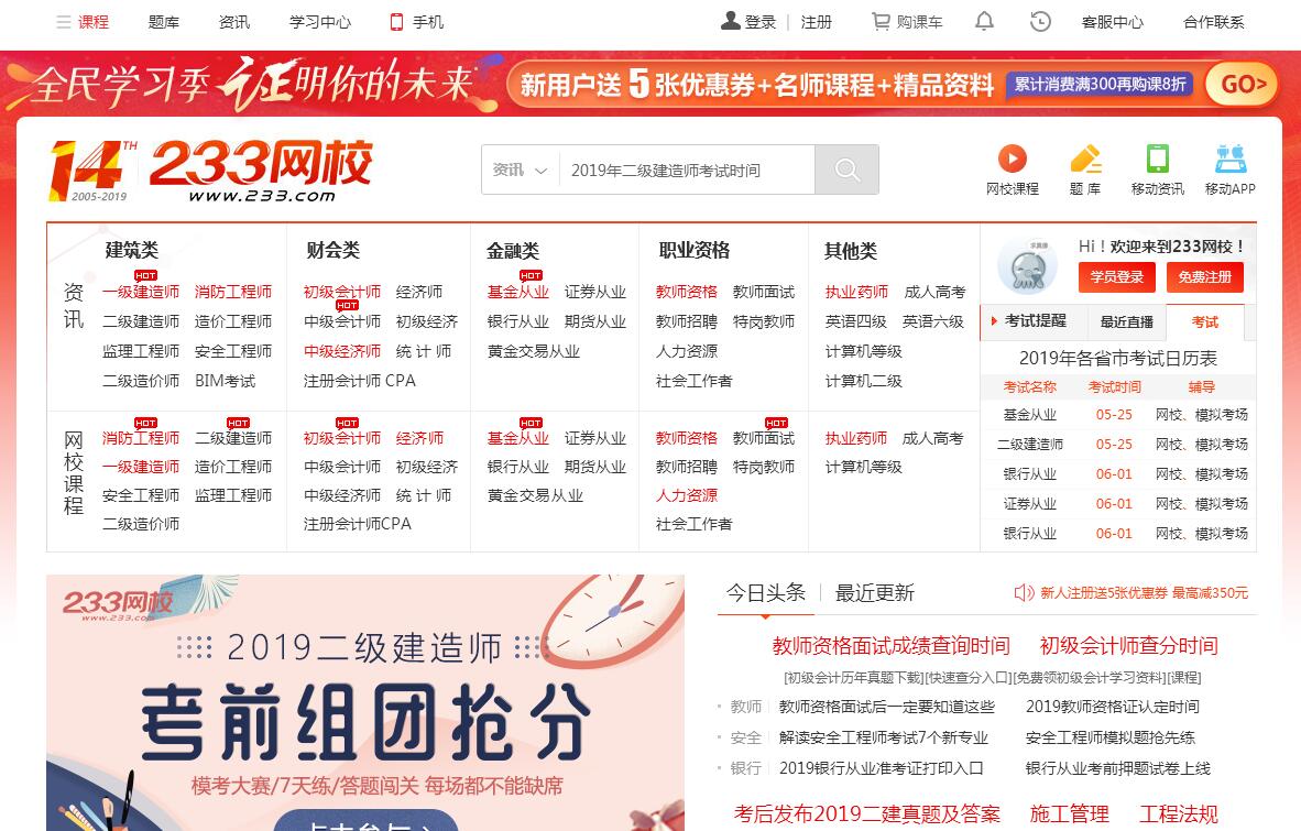 | 網(wǎng)站簡介: 233網(wǎng)校,提供金融、職業(yè)、建筑、財會等4大類30多種考試的在線培訓(xùn)、考試資訊、免費題庫等考試服務(wù),是擁有14年品牌的一站式學(xué)習(xí)網(wǎng)站。 |