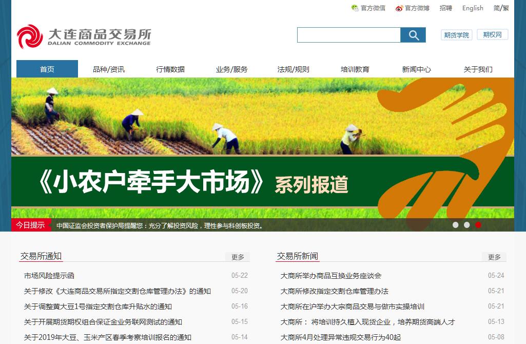 大連商品交易所成立于1993年2月28日,并于同年11月18日開始營業(yè),是中國四家期貨交易所之一,也是中國東北地區(qū)唯一一家期貨交易所。目前已上市玉米、玉米淀粉、黃大豆1號(hào)、黃大豆2號(hào)、豆粕、豆油、棕櫚油、雞蛋、纖維板、膠合板、線型低密度聚乙烯、聚氯乙烯、聚丙烯、乙二醇、焦炭、焦煤、鐵礦石共計(jì)17個(gè)期貨品種和豆粕、玉米兩個(gè)期權(quán)品種,并推出了棕櫚油、豆粕、玉米、焦炭、焦煤和鐵礦石等14個(gè)期貨品種和2個(gè)期權(quán)品種的夜盤交易。2018年5月,鐵礦石期貨引入境外交易者業(yè)務(wù)正式實(shí)施;2018年12月,商品互換業(yè)務(wù)正式上線,大商所建立了多元開放衍生品市場新格局,在多元開放戰(zhàn)略轉(zhuǎn)型和全面建設(shè)國際一流衍生品交易所道路上邁出了堅(jiān)實(shí)步伐。成立20多年來,大商所規(guī)范運(yùn)營、穩(wěn)步發(fā)展,已經(jīng)成為中國重要的期貨交易中心。目前,擁有會(huì)員單位164家,指定交割庫314個(gè)。2018年,大商所期貨年成交量和成交額分別達(dá)到9.69億手(單邊,下同)和52.19萬億元,豆粕期權(quán)全年成交量和成交額分別達(dá)到1252.16萬手和92.66億元。根據(jù)美國期貨業(yè)協(xié)會(huì)(FIA)公布的全球主要衍生品交易所成交量排名,2018年大商所在全球排名第12位。目前,大商所是全球最大的農(nóng)產(chǎn)品、塑料、煤炭、鐵礦石期貨市場。經(jīng)過多年發(fā)展,大商所期貨品種價(jià)格已成為國內(nèi)市場的權(quán)威價(jià)格,為相關(guān)各類企業(yè)的生產(chǎn)經(jīng)營提供了“指南針”和“避風(fēng)港”,并通過引入境外交易者,為全球相關(guān)產(chǎn)業(yè)客戶提供更優(yōu)質(zhì)的服務(wù)。近年來,大商所推出產(chǎn)業(yè)大會(huì)、機(jī)構(gòu)論壇、期貨學(xué)院、十大期貨投研團(tuán)隊(duì)評選、產(chǎn)融培育基地、高校人才培育項(xiàng)目等市場服務(wù)品牌,農(nóng)民收入保障計(jì)劃、場外期權(quán)、基差貿(mào)易等“三農(nóng)”及產(chǎn)業(yè)服務(wù)試點(diǎn)項(xiàng)目,積極探索期貨市場服務(wù)產(chǎn)業(yè)的新路,進(jìn)一步強(qiáng)化市場功能發(fā)揮,促進(jìn)了相關(guān)產(chǎn)業(yè)穩(wěn)步健康發(fā)展。國家對大商所的發(fā)展高度重視,國務(wù)院2007年批準(zhǔn)的《東北地區(qū)振興規(guī)劃》,2009年批準(zhǔn)的《遼寧沿海經(jīng)濟(jì)帶發(fā)展規(guī)劃》《關(guān)于進(jìn)一步實(shí)施東北地區(qū)等老工業(yè)基地振興戰(zhàn)略的若干意見》,2012年批準(zhǔn)的《東北振興“十二五”規(guī)劃》以及2016年批準(zhǔn)的《東北振興十三五規(guī)劃》,均對大商所的發(fā)展提出了要求,明確定位為建設(shè)全球重要期貨交易中心。2013年,習(xí)近平總書記視察并寄語大商所“腳踏實(shí)地、大膽探索,努力走出一條成功之路”。中國特色社會(huì)主義進(jìn)入新時(shí)代的歷史方位,對我國衍生品市場深化改革開放提出了新要求,大商所將以習(xí)近平新時(shí)代中國特色社會(huì)主義思想為指引,肩負(fù)起時(shí)代賦予的神圣使命,牢牢把握發(fā)展機(jī)遇,全面建設(shè)多元開放、國際一流衍生品交易所,力爭早日建成全球重要的大宗商品定價(jià)中心和風(fēng)險(xiǎn)管理中心,努力在服務(wù)實(shí)體經(jīng)濟(jì)、對外開放中發(fā)揮更大作用。